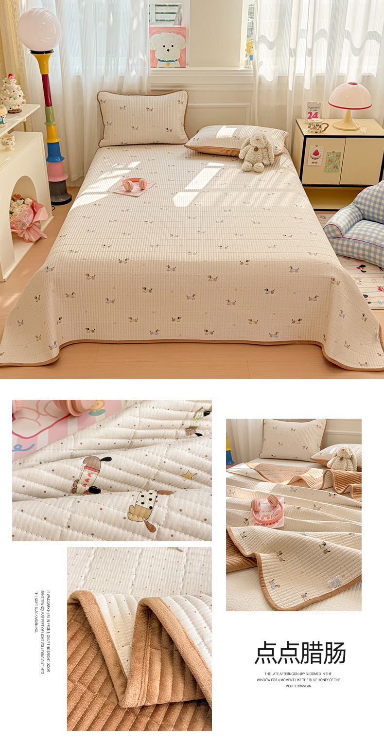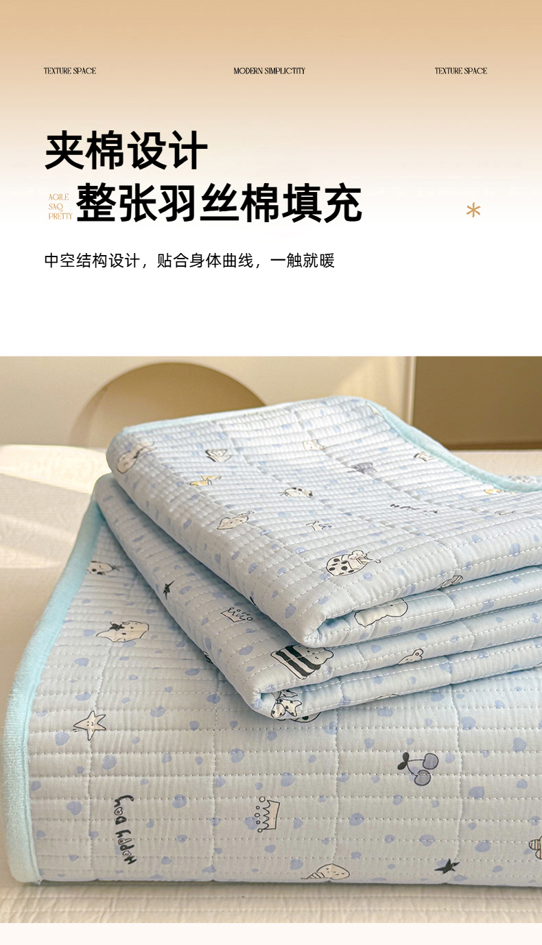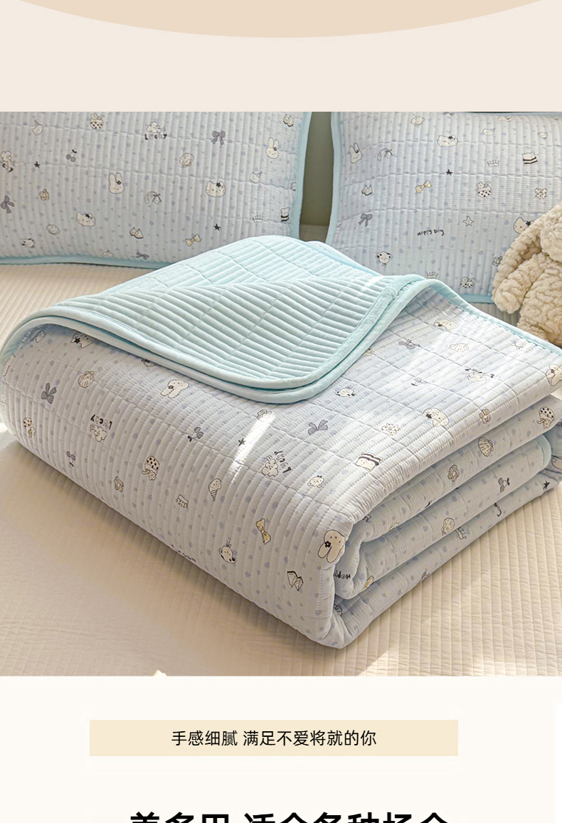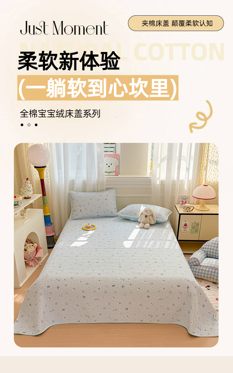 • 91家纺网 家纺一手货源 找家纺 简宜家居(朝初家纺) 2025新款A面100%全棉B面宝宝绒棉绒包边床盖正反两用 贝壳猫猫