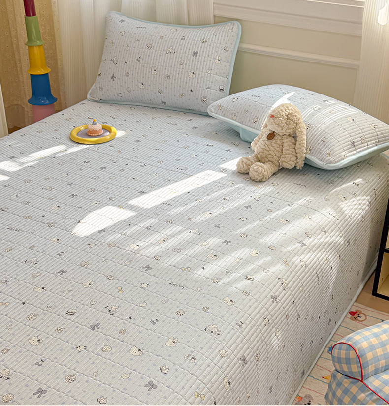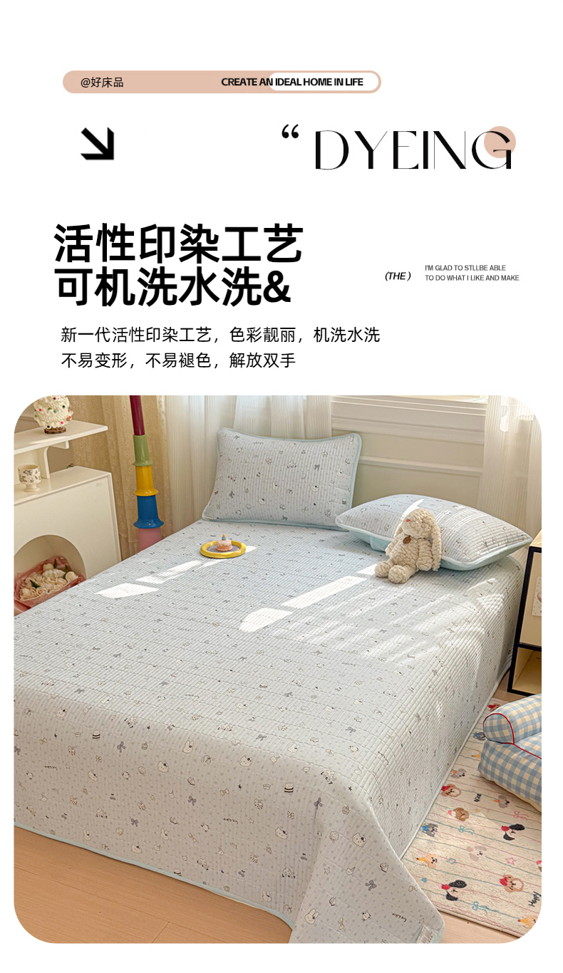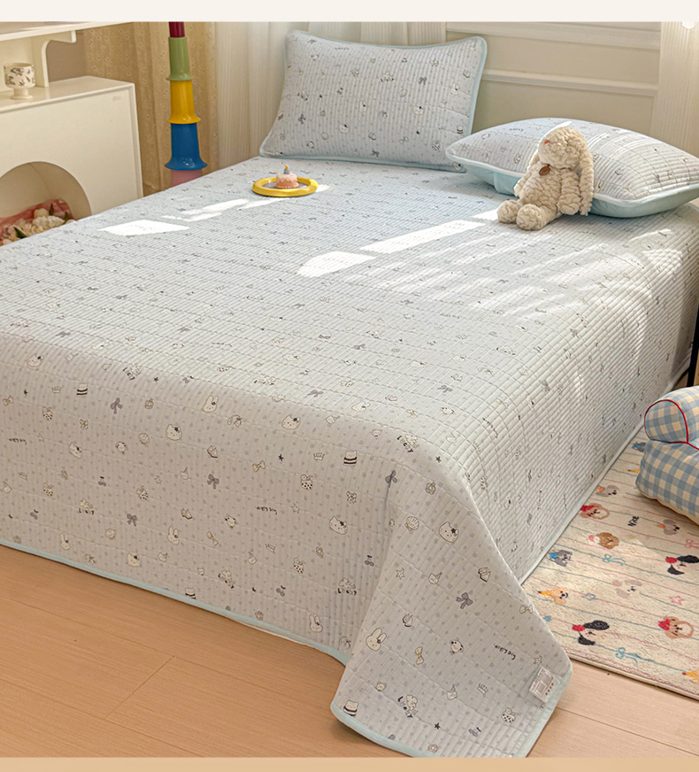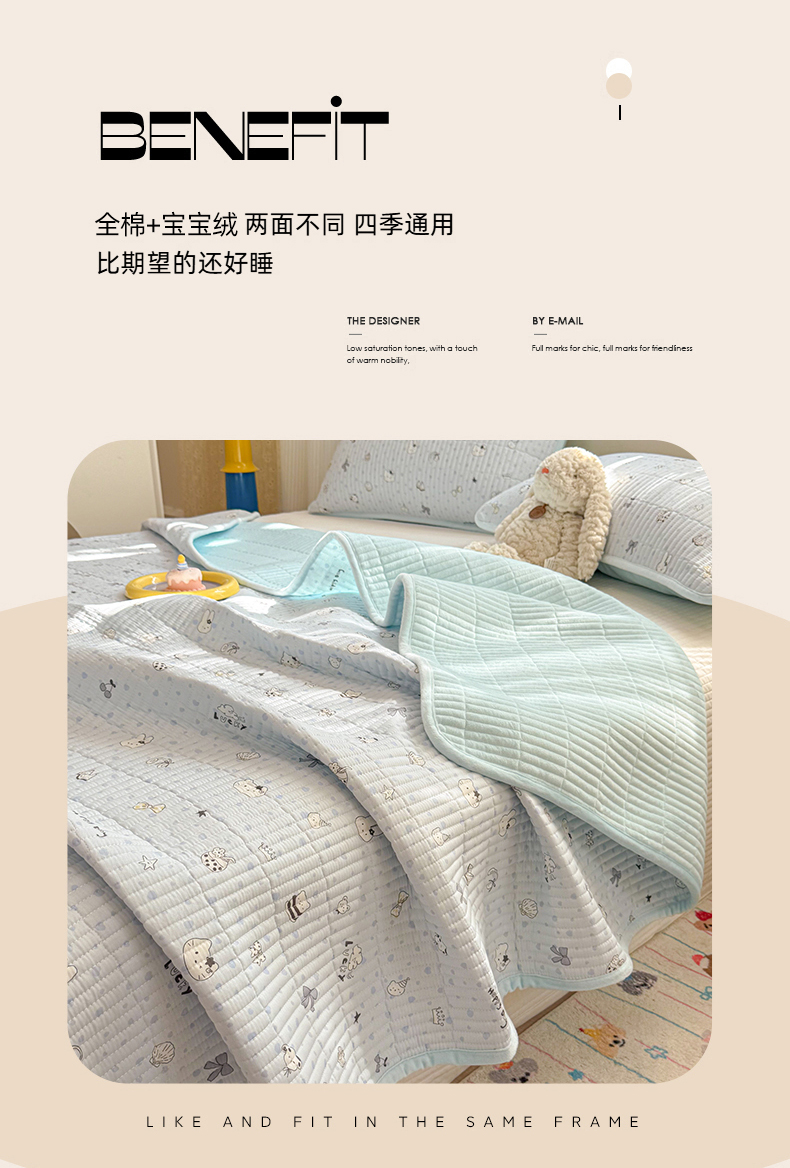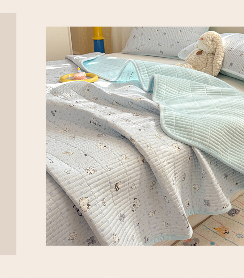 • 91家纺网 家纺一手货源 找家纺 简宜家居(朝初家纺) 2025新款A面100%全棉B面宝宝绒棉绒包边床盖正反两用 贝壳猫猫