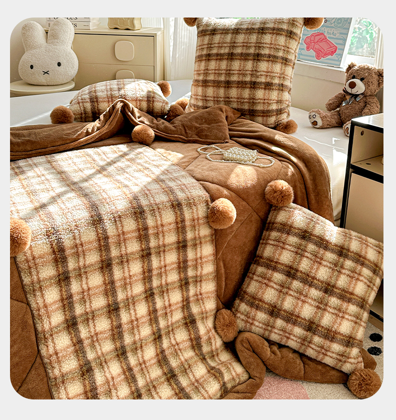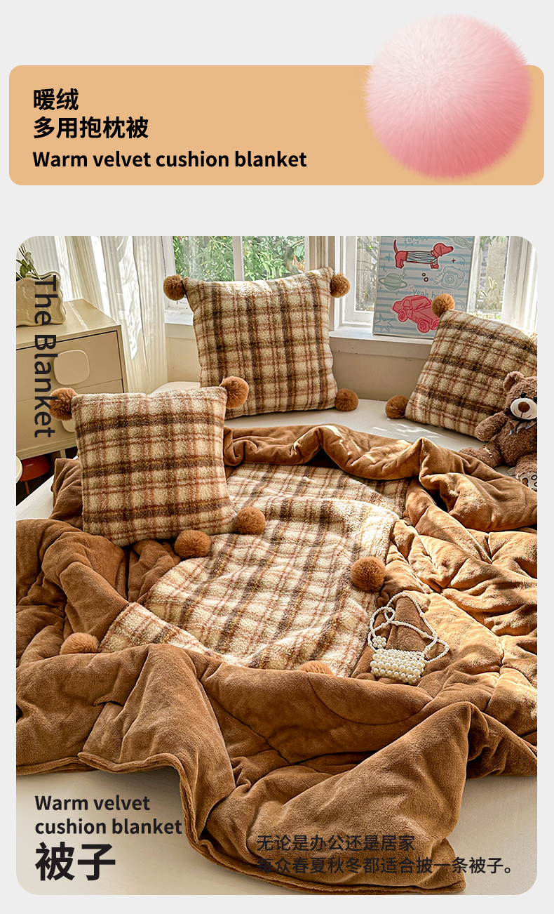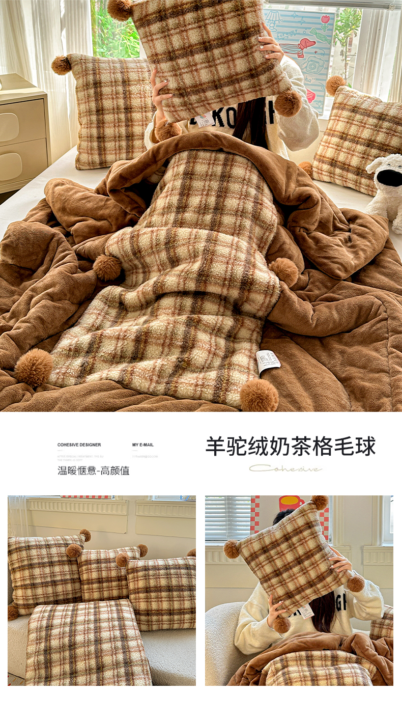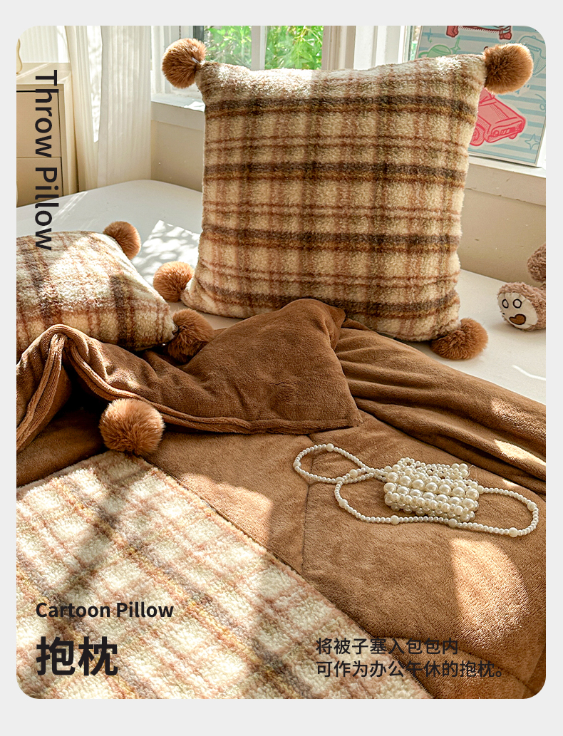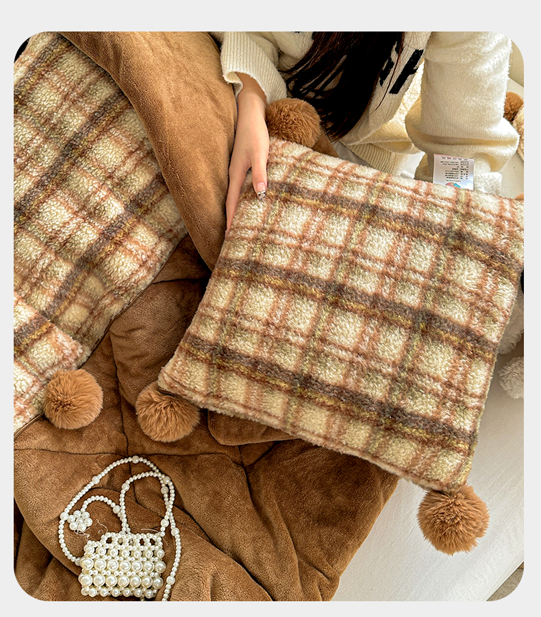 商品名称:古本家居 2025新款羊驼绒格子毛球款抱枕被 羊驼绒奶茶格毛球