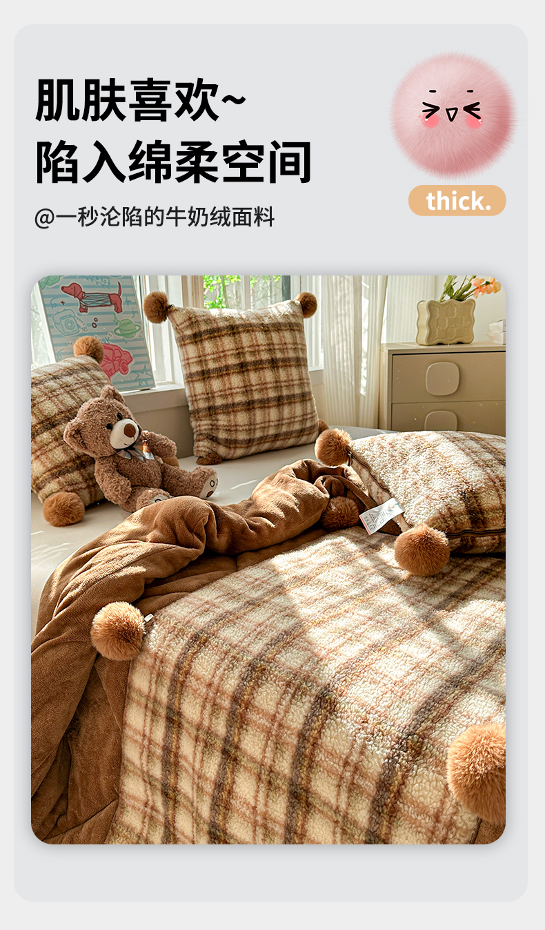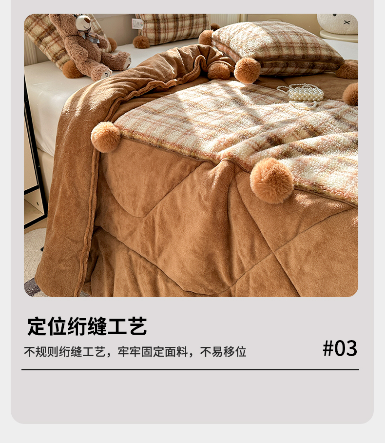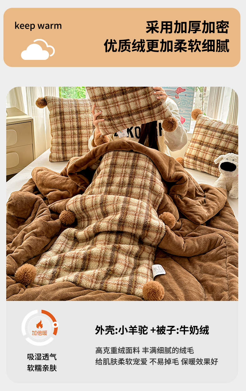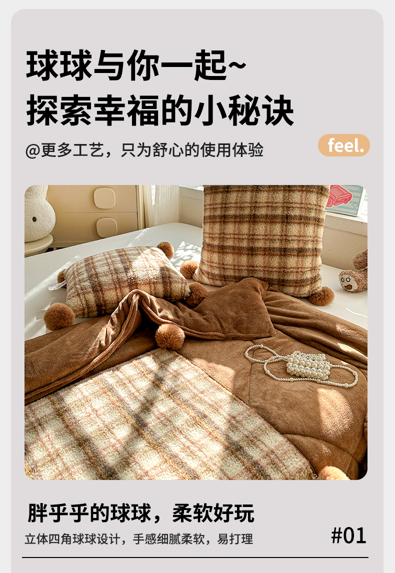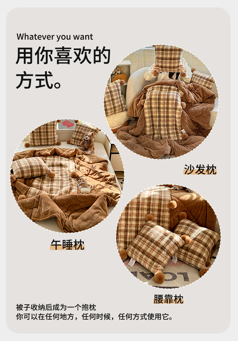 商品名称:古本家居 2025新款羊驼绒格子毛球款抱枕被 羊驼绒奶茶格毛球