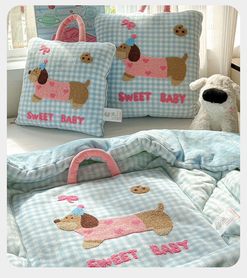 商品名称:古本家居 2025新款牛奶绒毛巾绣狗狗熊熊款抱枕被 牛奶绒红条帽子熊