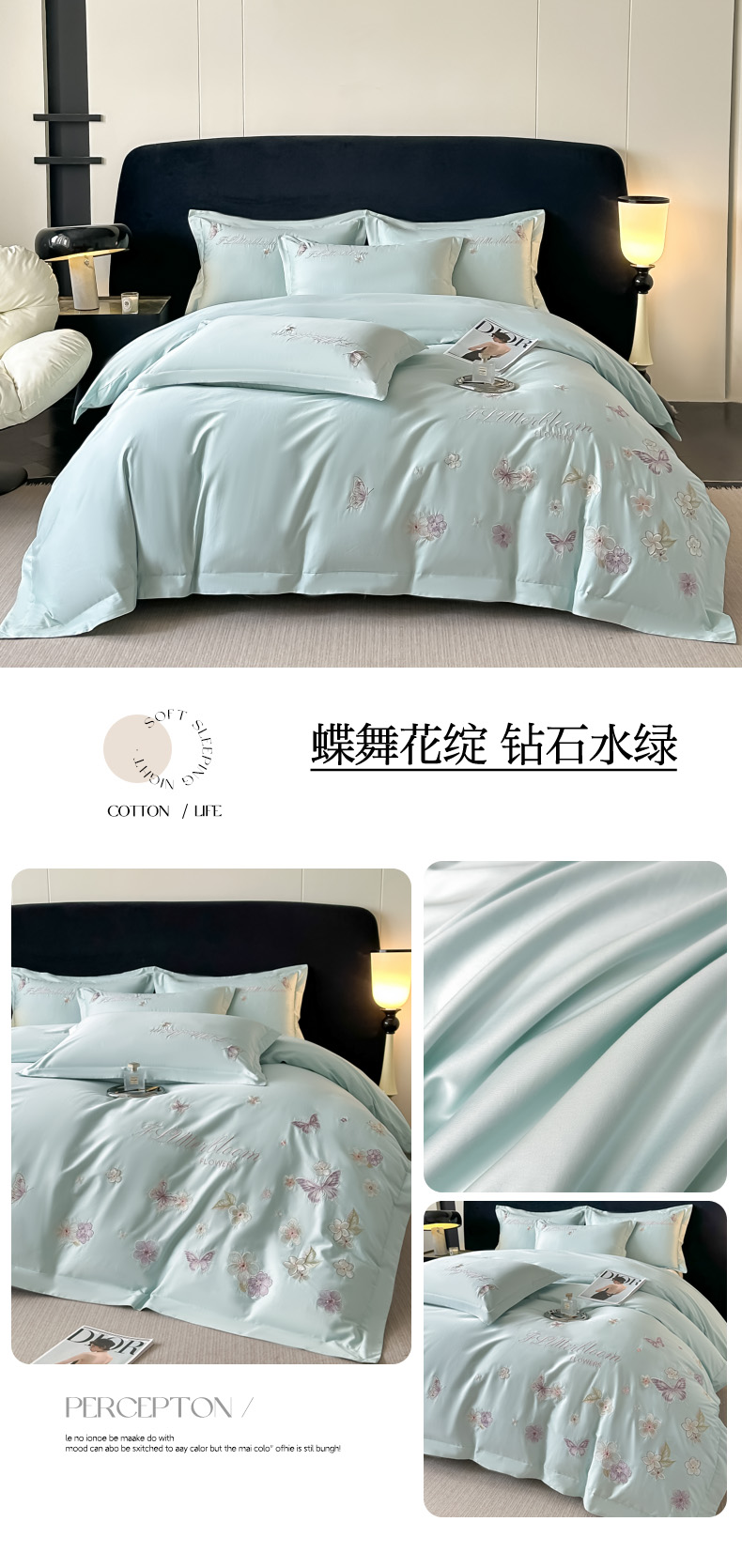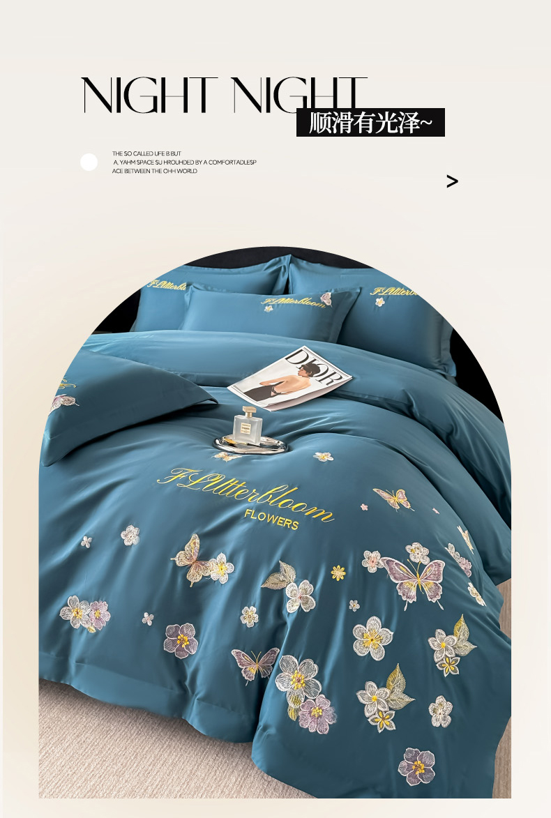 商品名称:卡诗兰 2025新款A类50S双股全棉贡缎长绒棉刺绣四件套-飞舞蝴蝶系列(高档礼盒装) 飞舞蝴蝶 宾利蓝
