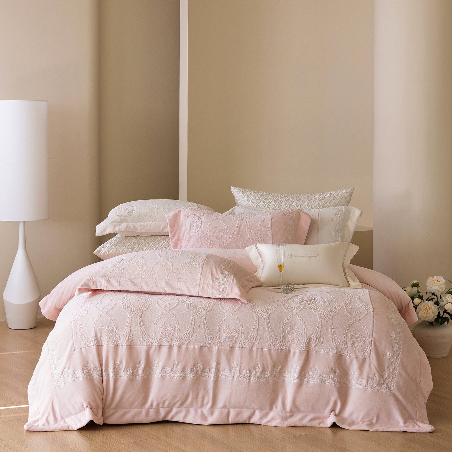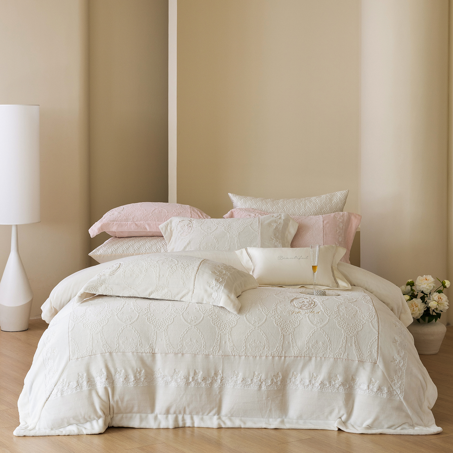(总)佳汐蓝 2025春夏新品双层皱皱纱刺绣+织带+荷叶边四件套--白茶花,奶白,曲奇