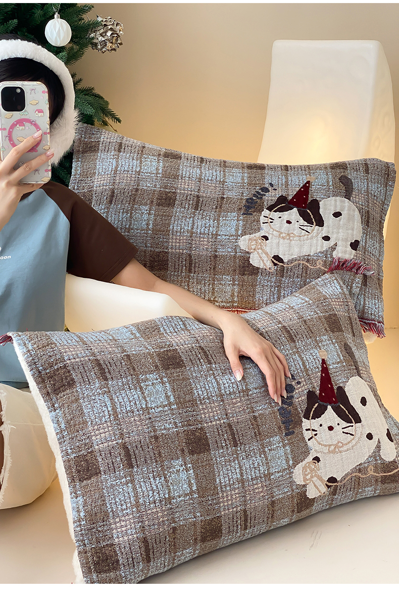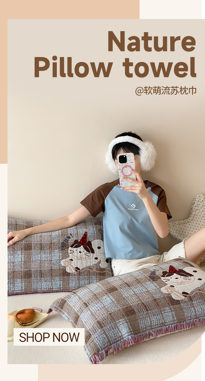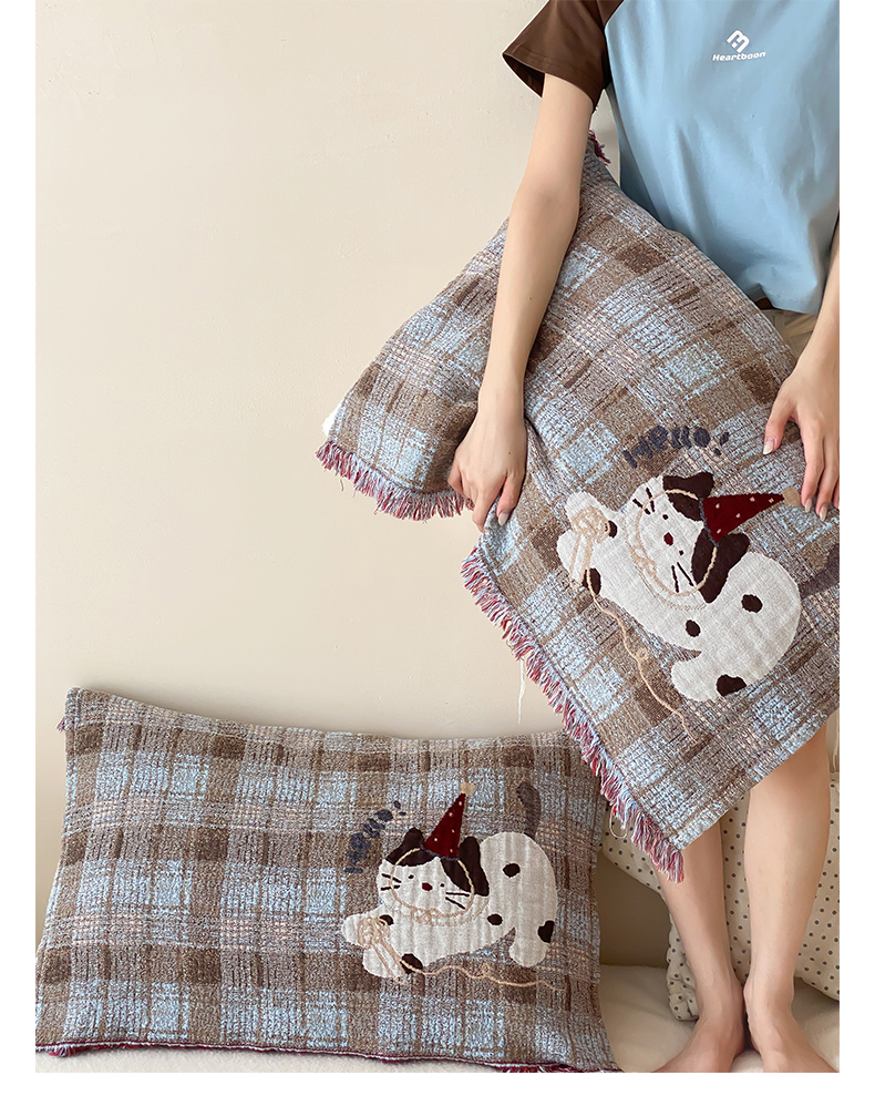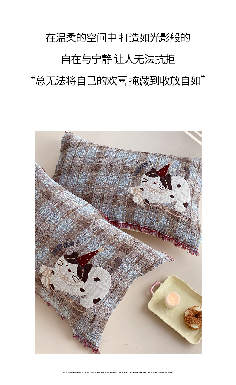 商品名称:麻依 2025新款全棉四层纱布软萌流苏枕巾 调皮小猫