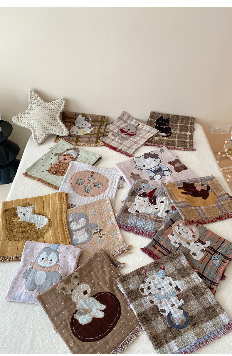 (总)麻依 2025新款全棉四层纱布软萌流苏枕巾,波点企鹅,蛋糕企鹅,蛋糕小咪,调皮小猫,乖乖狗,锣鼓小熊,帽子小象,沙发小狗,鲨鱼小狗,玩偶熊KT,线团小咪,香蕉小猫,鸭鸭小猫,杂技小狗,组合图