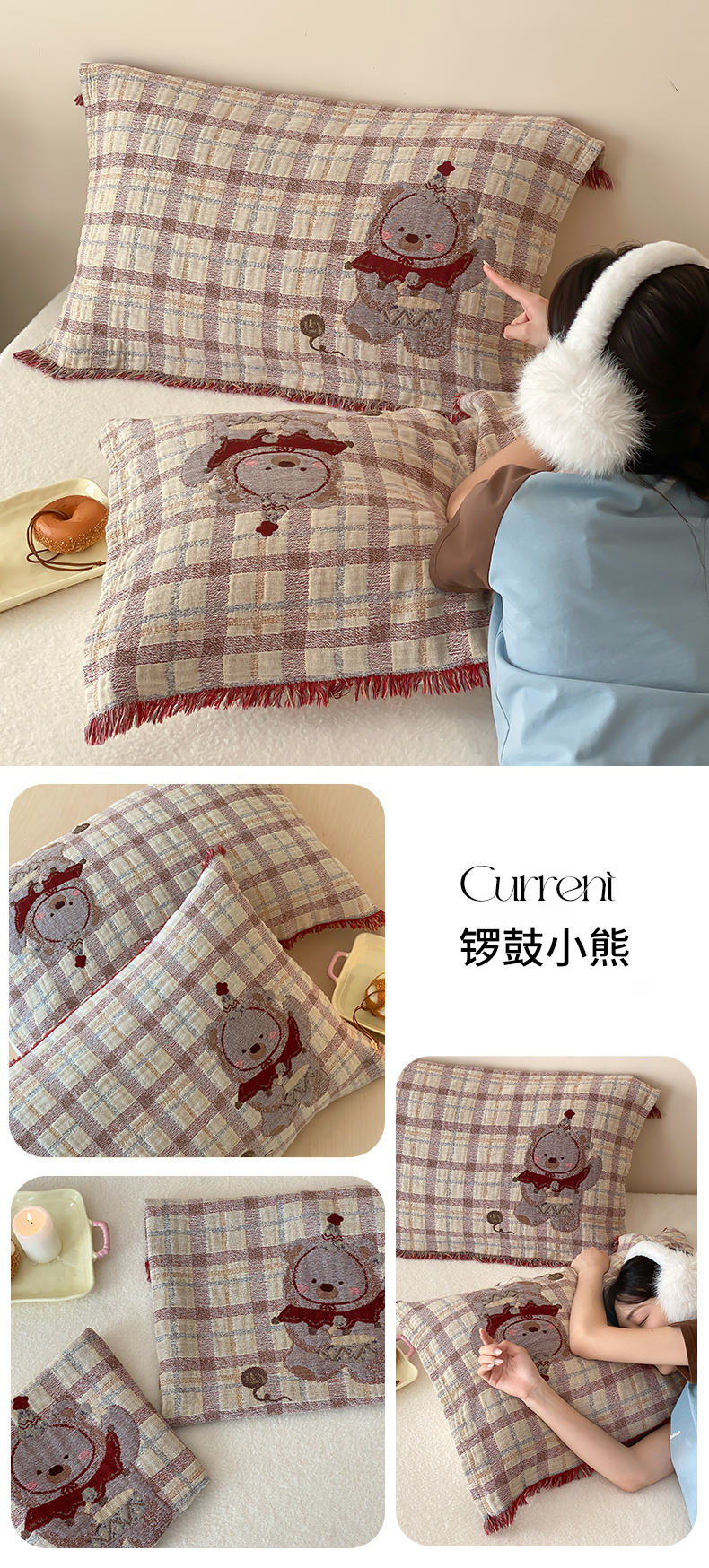 (总)麻依 2025新款棉花糖枕巾全棉四层纱布双层花边,抱抱熊,点点-灰,点点-米白,花影-粉,花影-米白,墨心,奶油草莓,帕帕熊,牵手小熊,生日腊肠狗,甜甜圈小熊,小蝴蝶结,小南瓜,小柿子,樱桃香