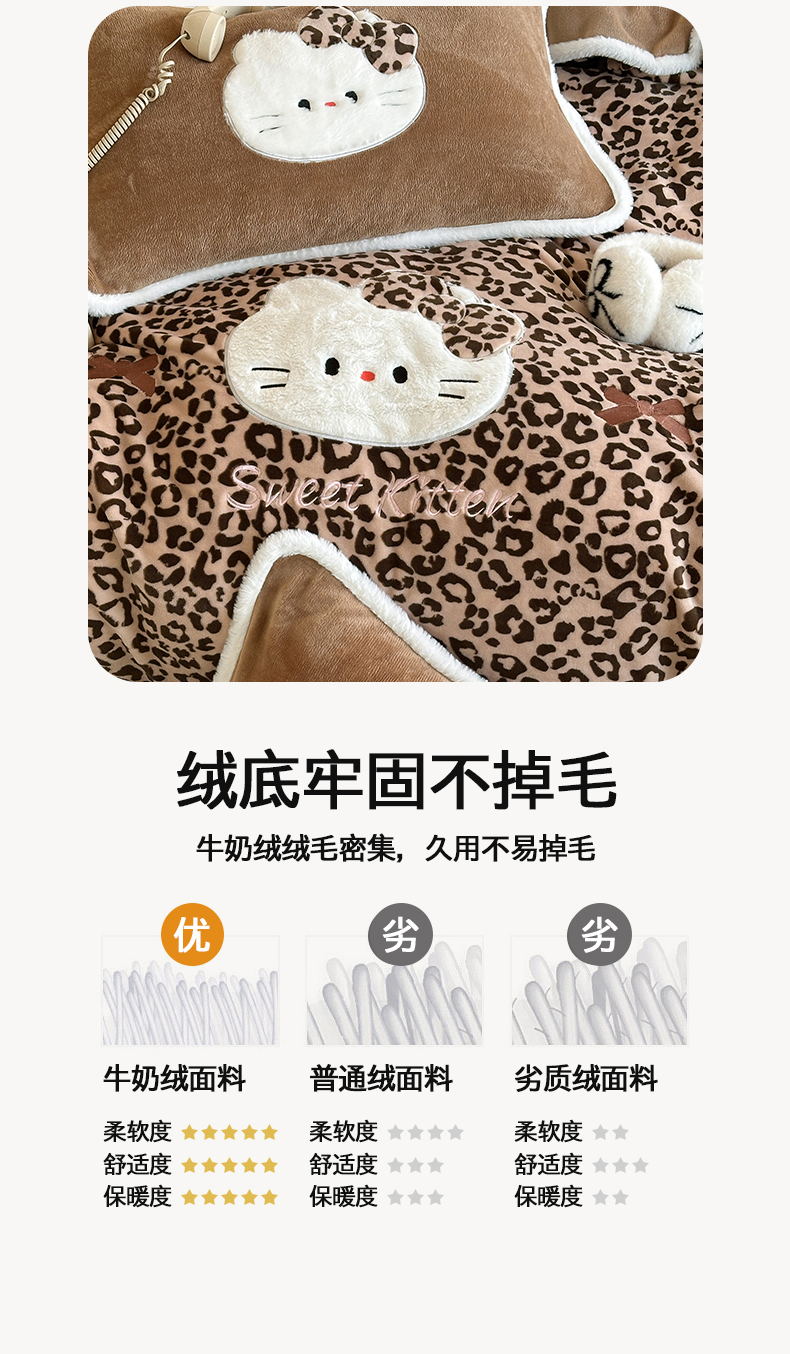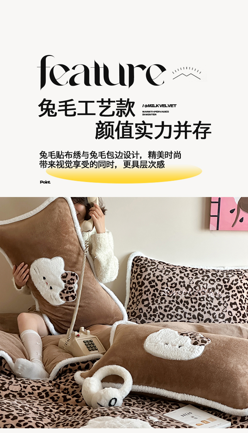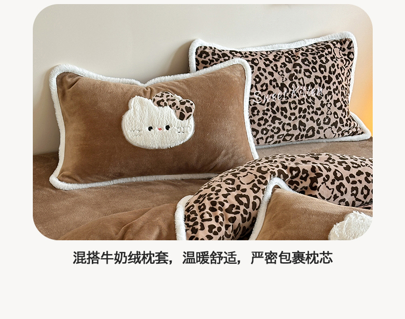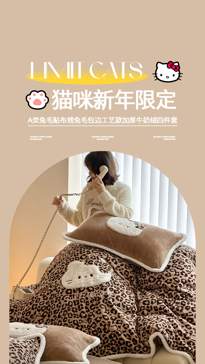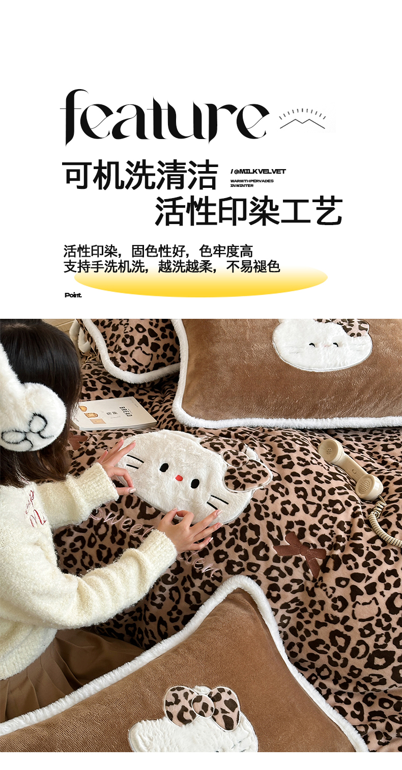 当前位置: 91家纺网 > 商品网购 > 床品套件 > 四件套 > 牛奶绒四件套 > 桃子家居 2026新款A类新年限定兔毛贴布绣猫咪可爱公主兔毛包边工艺款加厚牛奶绒四件套 绒贴布绣-豹纹喵喵咖
