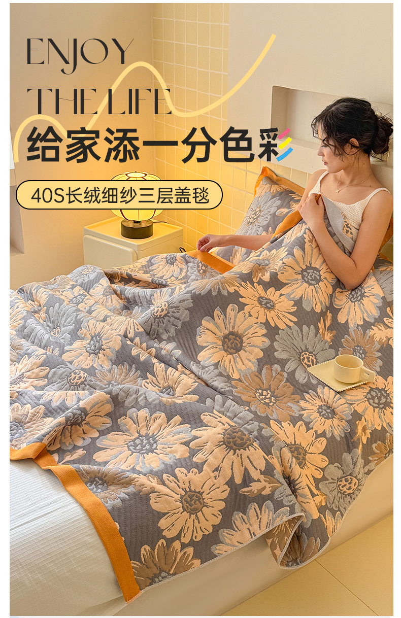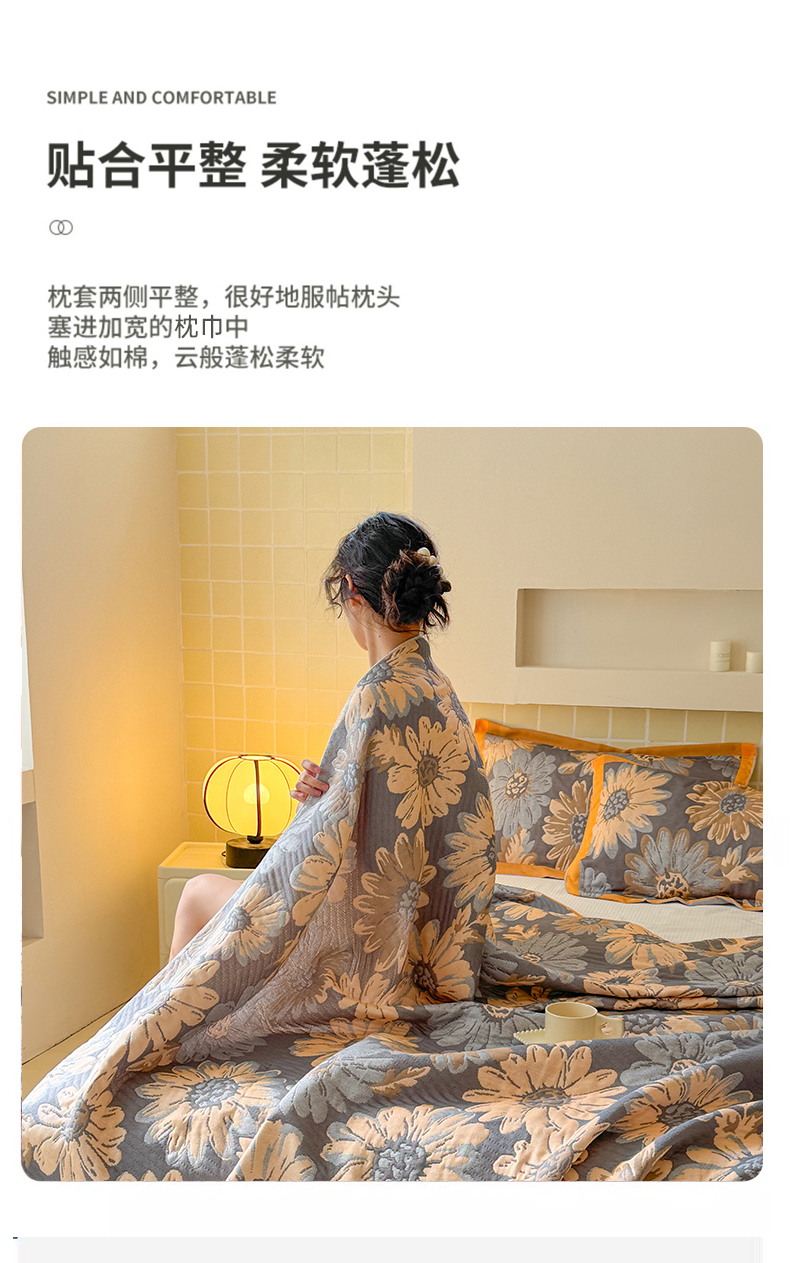 朴尔家纺-毛巾被 2026新款彩棉云柔三层纱布毛巾被三件套盖毯 花间令
