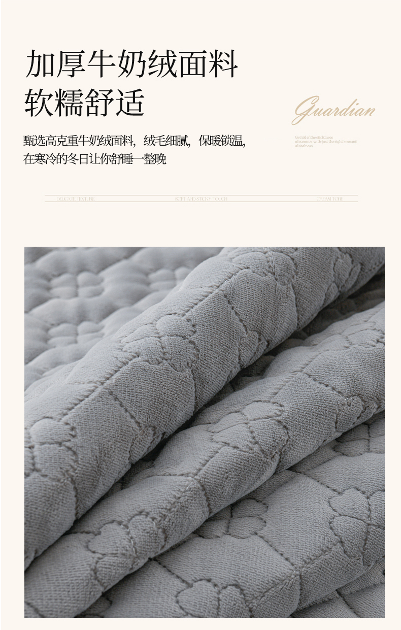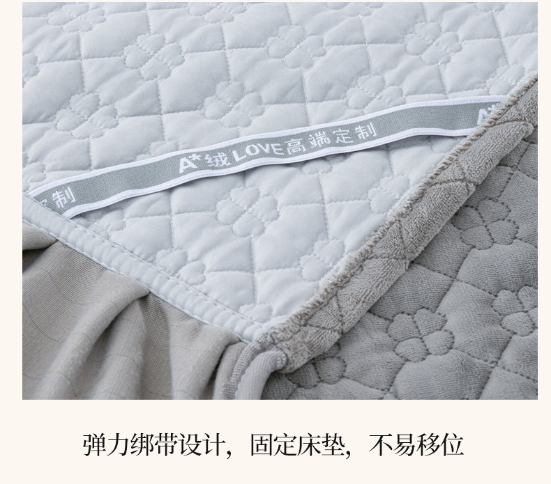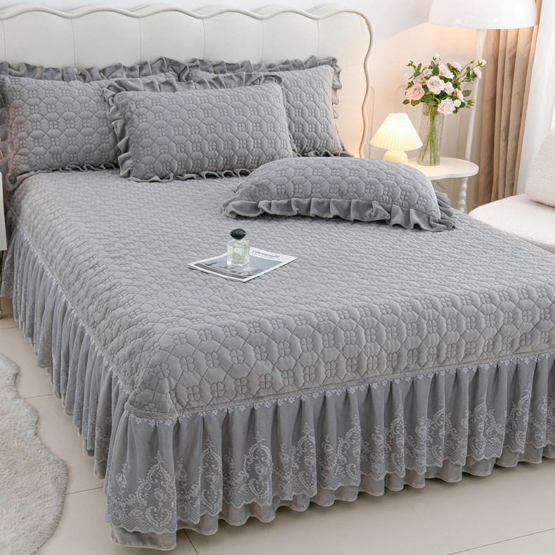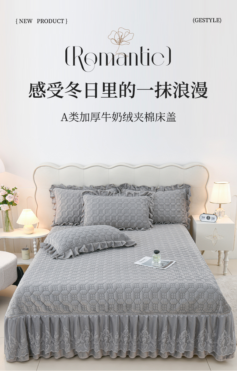 商品名称:优家居工厂店 2026新款240克高克重牛奶绒韩版牛奶绒夹棉床盖三件套床裙三件套直播热款-栀子花 栀子花-灰色