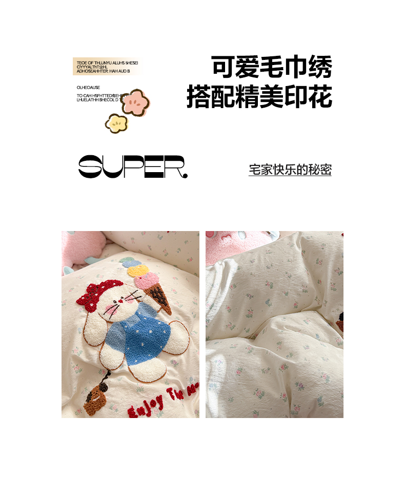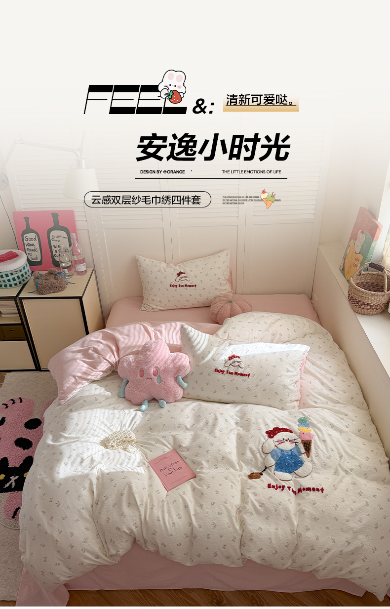 (总)美乐迪家纺 2026新款云感双层纱毛巾绣四件套,大脸猫,小熊糕,熊仔墩墩