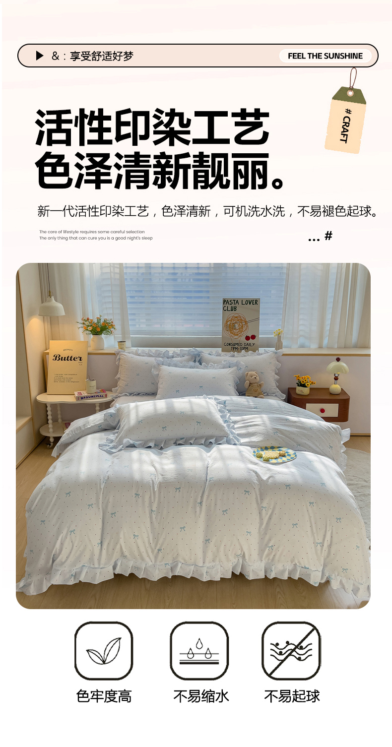 当前位置: 91家纺网 > 商品网购 > 床品套件 > 四件套 > 化纤普通四件套 > 优家居 2026新款精仿棉床裙四件套水洗棉韩版公主风花边床裙单被套直播外贸定制 潘多拉-兰