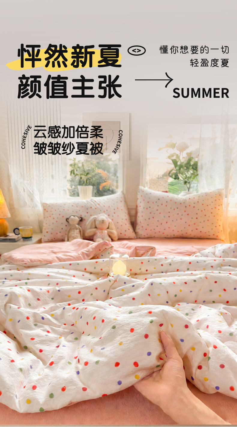 • 91家纺网 家纺一手货源 找家纺 丽美人家纺 2026春夏新款简单款皱皱纱夏被夏凉被空调被 彩色波点