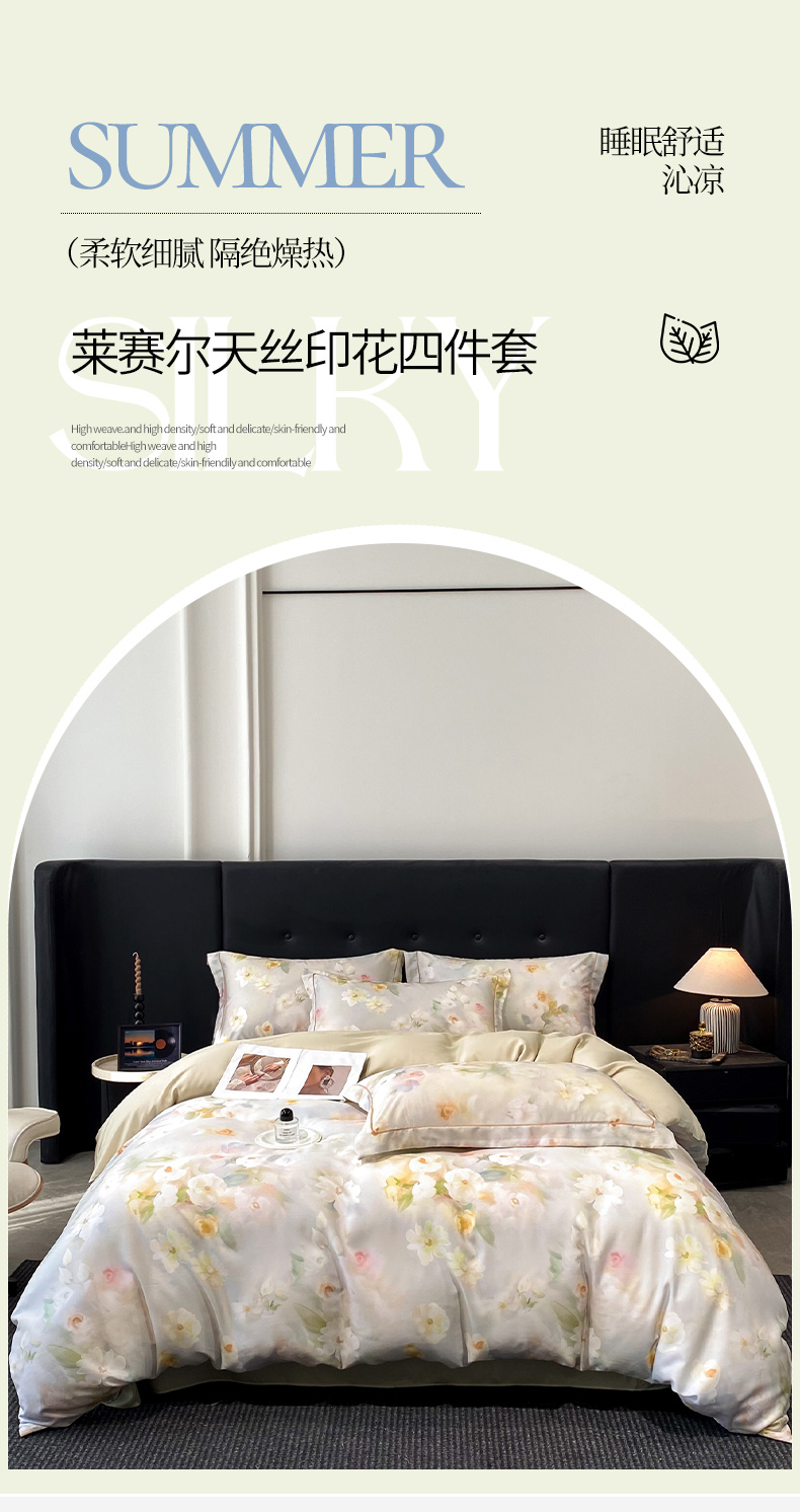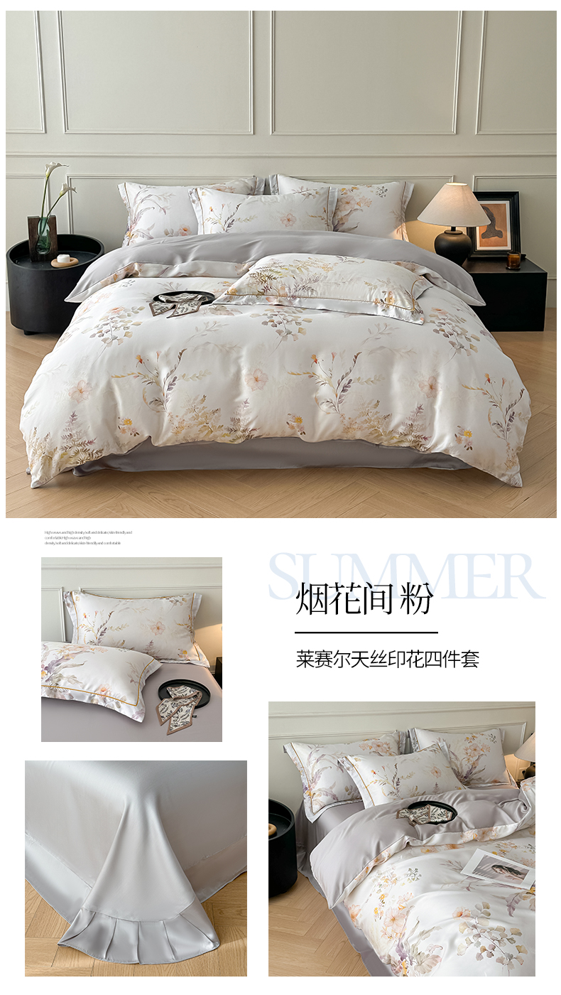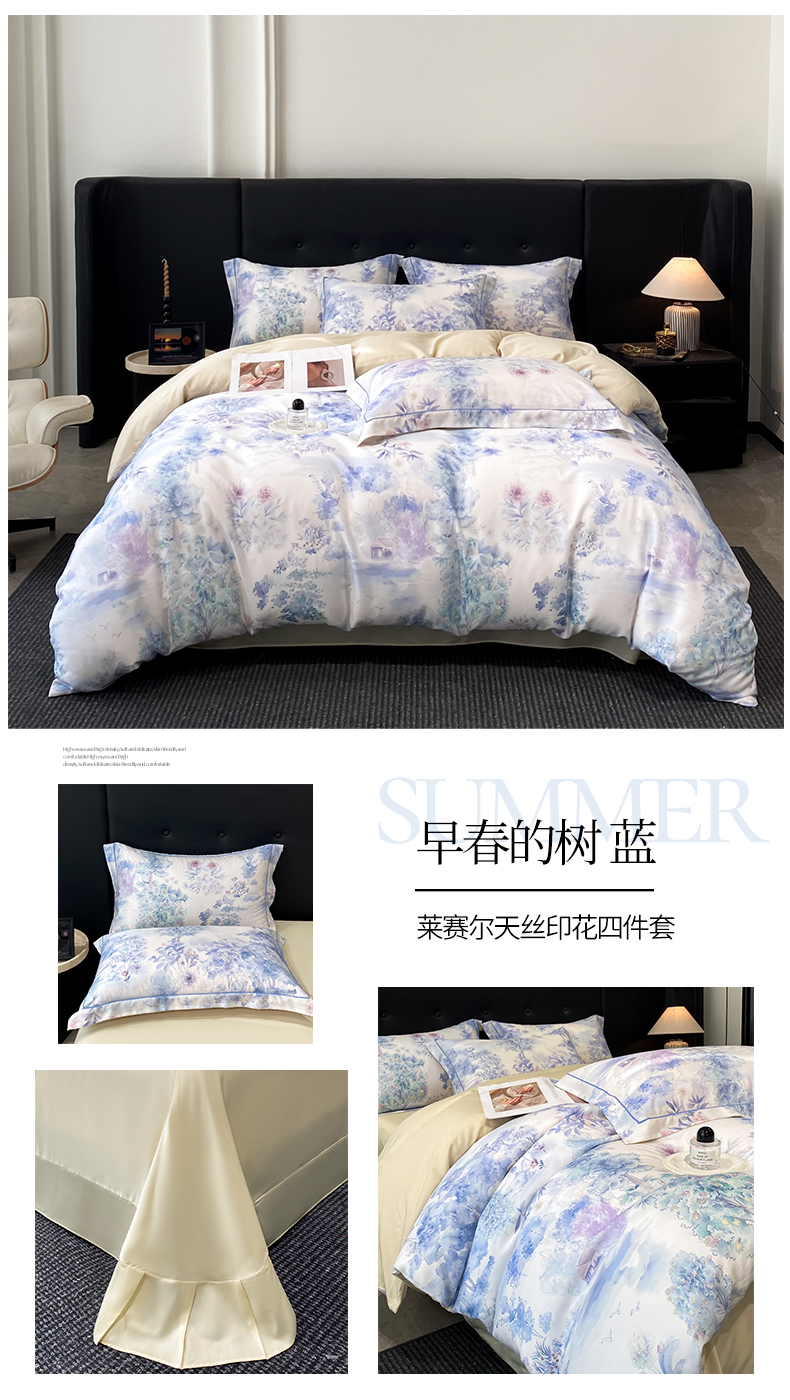 (总)启航家居 2026新款春夏天丝莱赛尔数码印花四件套,花颜外兰,半纸叶灰,池禾韵兰,春溢然兰,春溢然绿,花颜外粉,花园派对沙色,梦境之翼兰,梦境之翼绿,烟花间粉,烟花间绿,樱岛春漫粉,云间素语绿,云间素语紫,早春的树蓝,早春的树紫,栀花语粉,紫陌紫