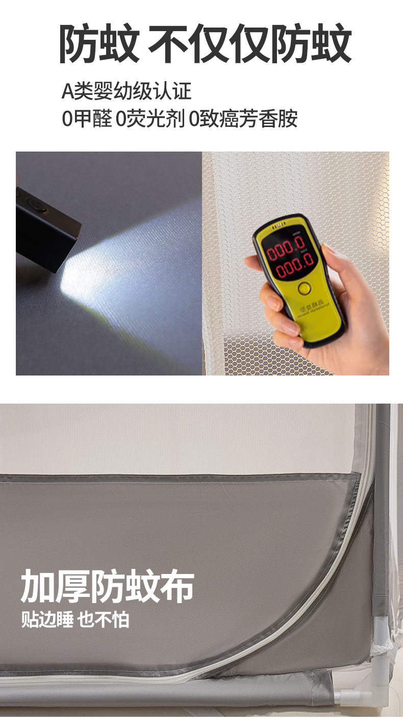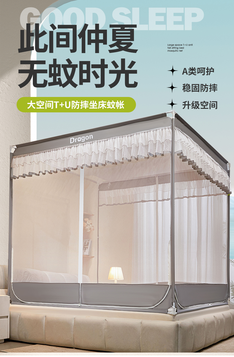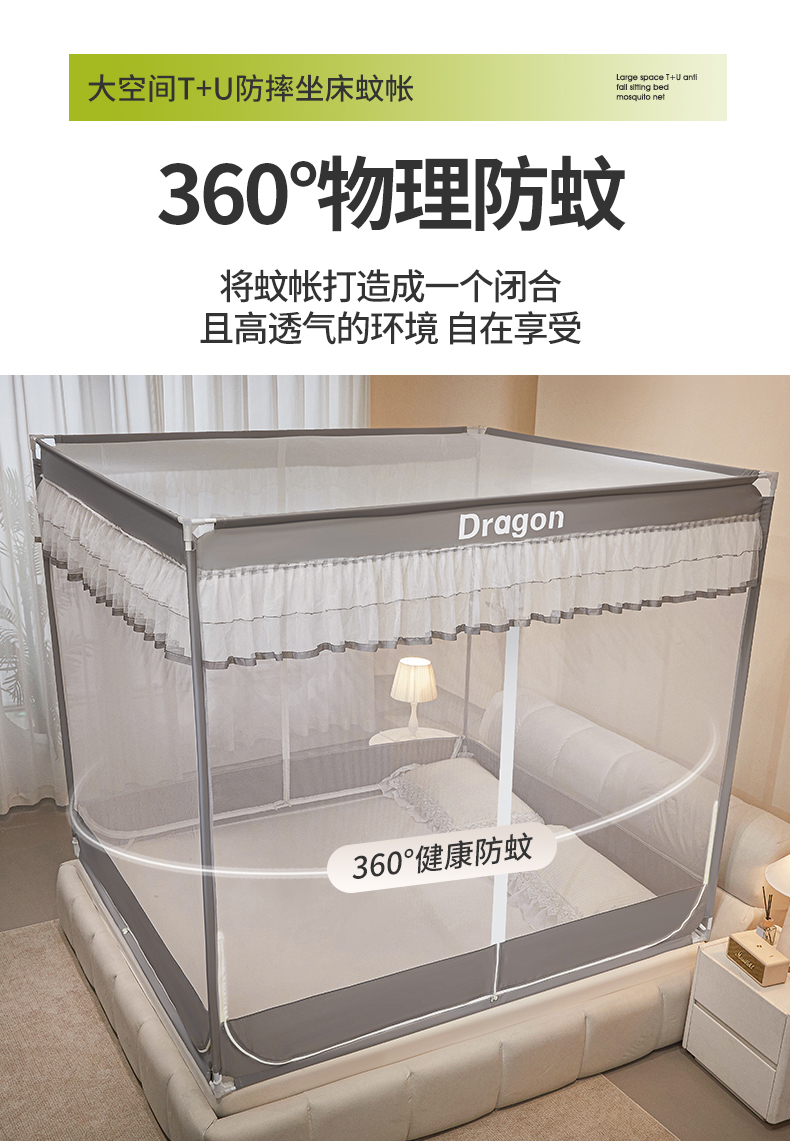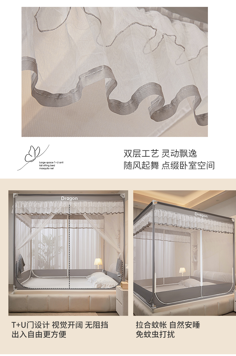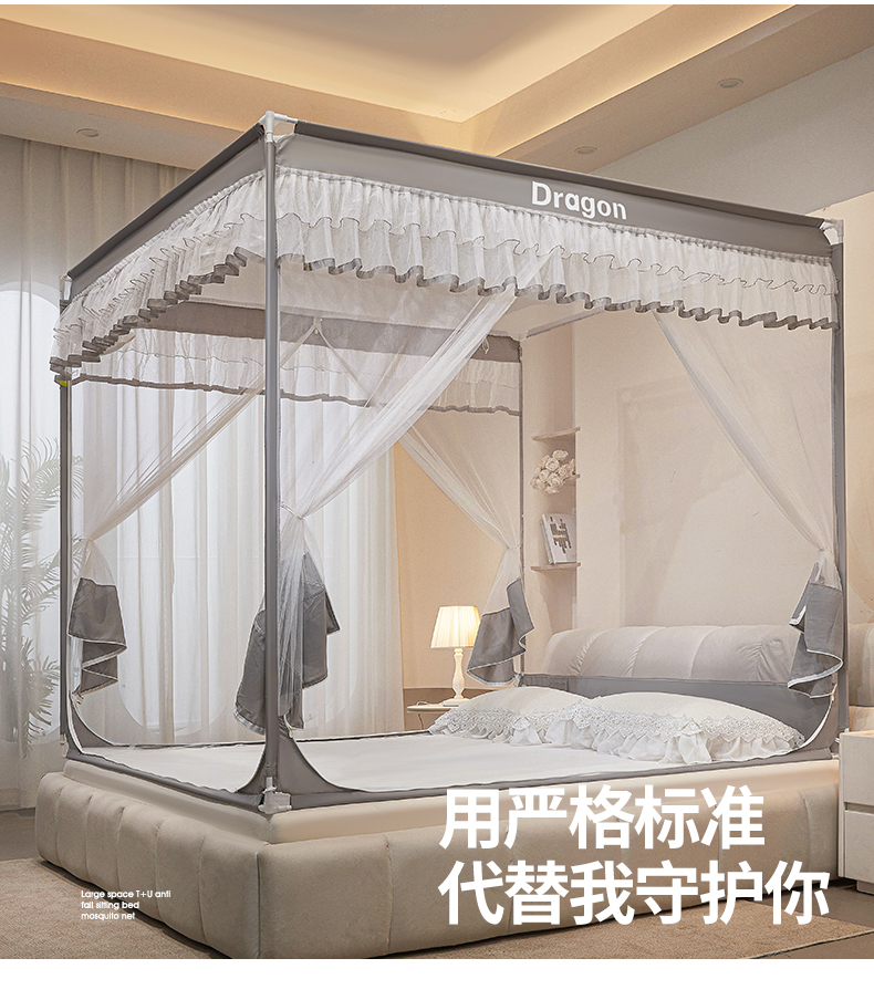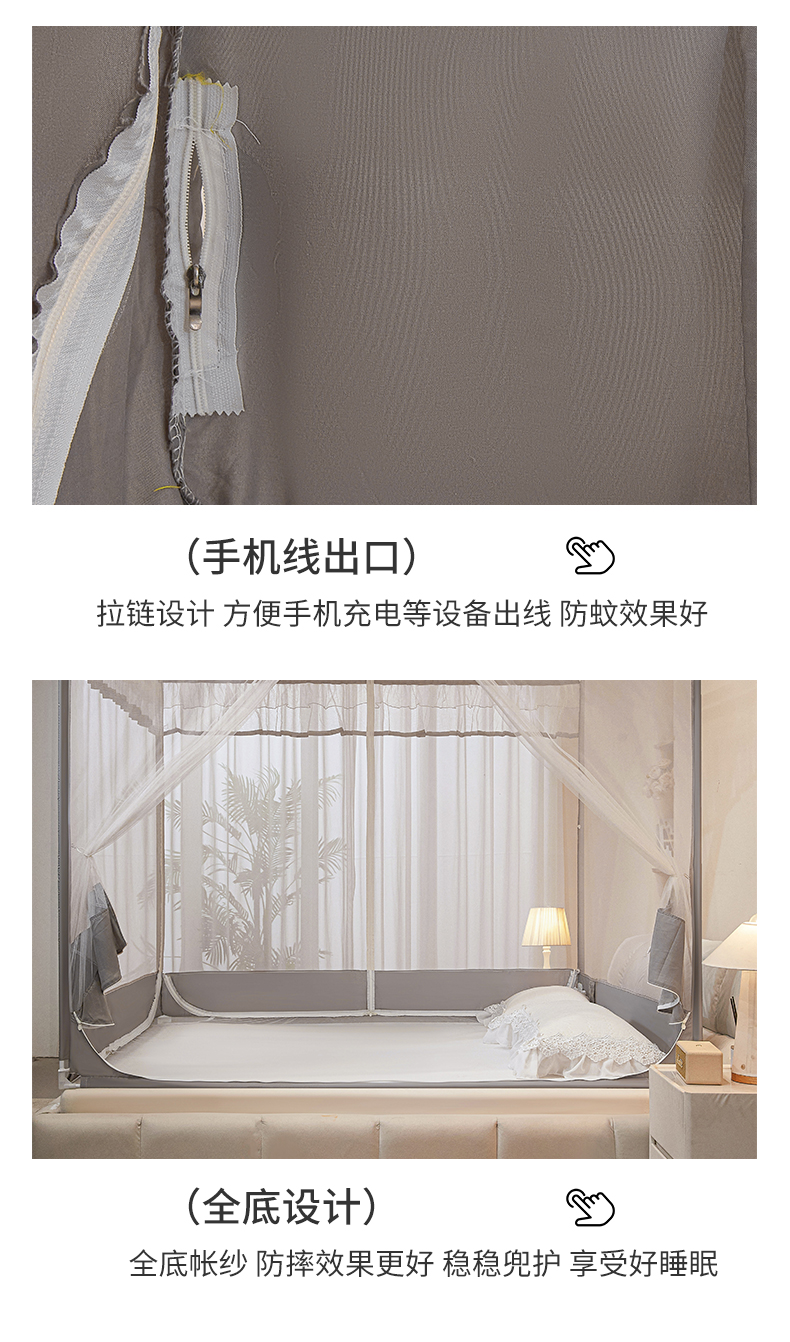 梵希良品家纺 2026新款全底家用卧室坐床加密加厚支架全包围加粗大空间T+U防摔坐床蚊帐-漫语 漫语 简灰