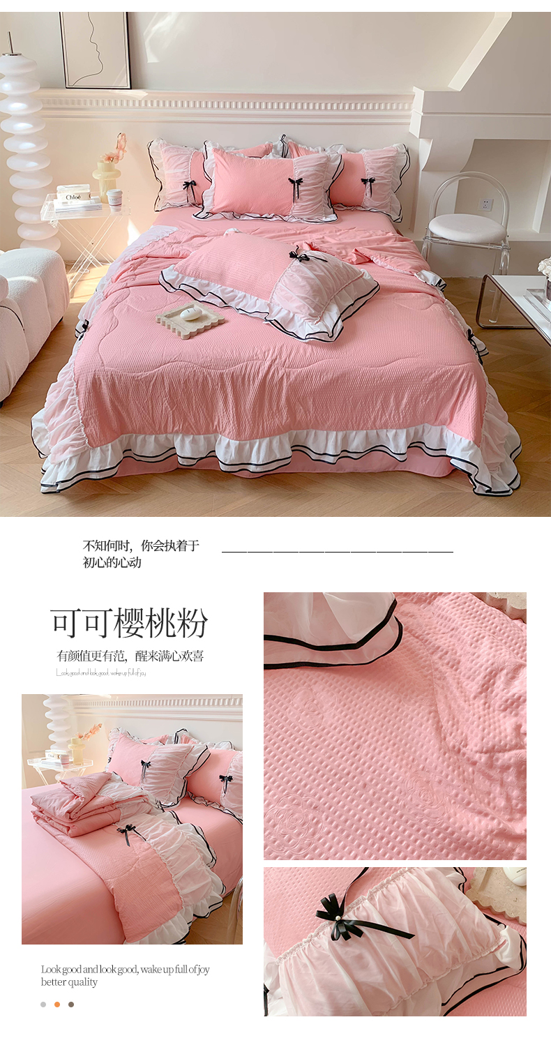 (总)吾欢心 2026新款小香风可可系列双层花边床盖款夏被四件套被子被芯,可可奶茶绿,可可奶昔粉,可可柠檬黄,可可温柔紫,可可樱桃粉
