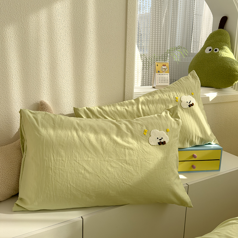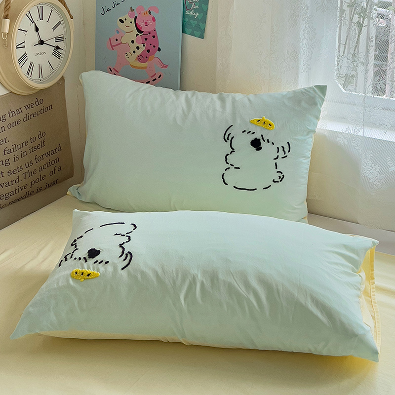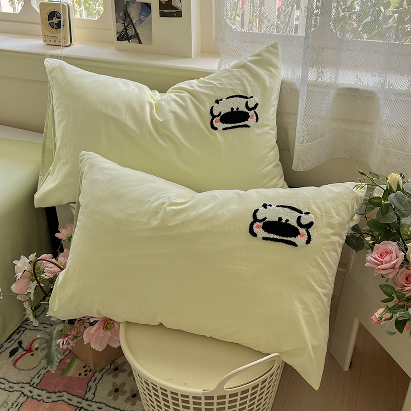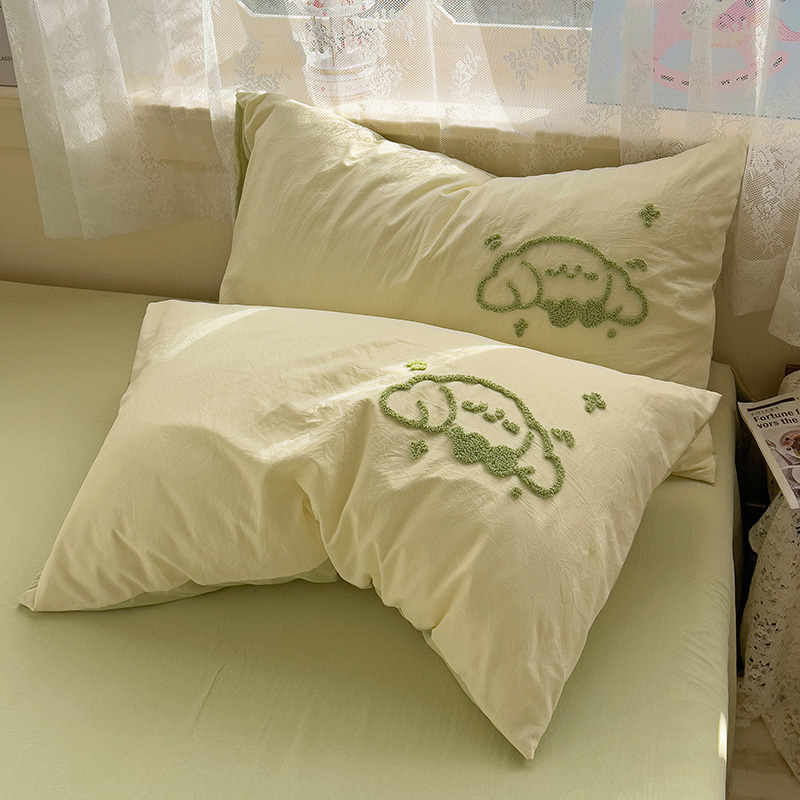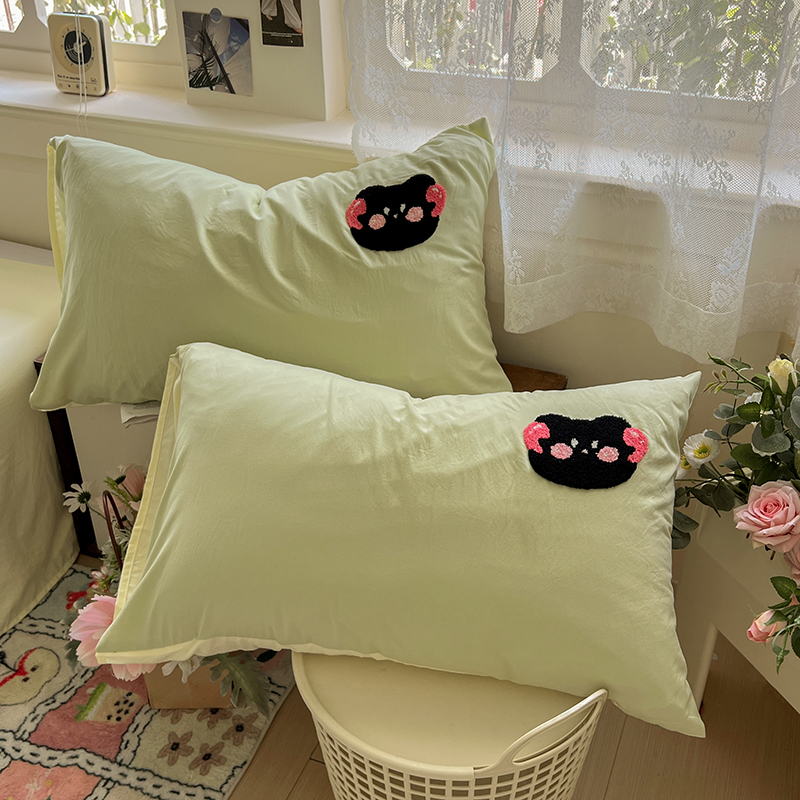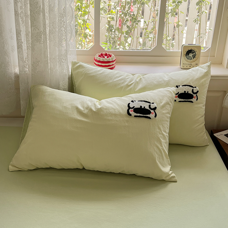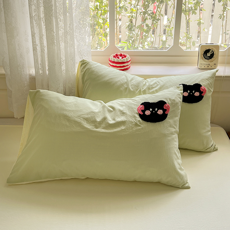 曼谷 新款毛巾绣四件套ins煤球图案柔软磨毛水洗棉套件 煤球-芝士绿,煤球-芝士绿