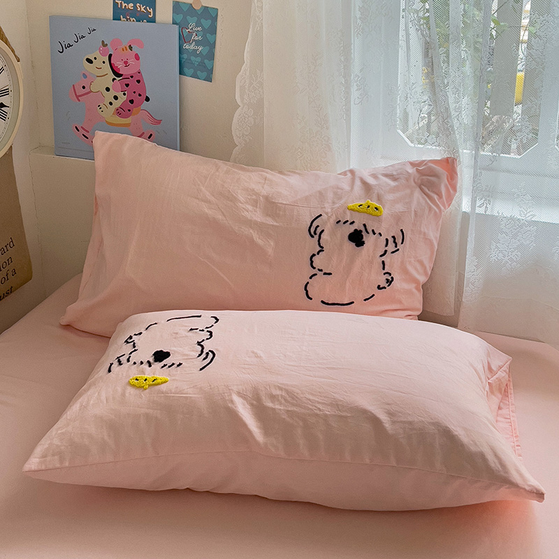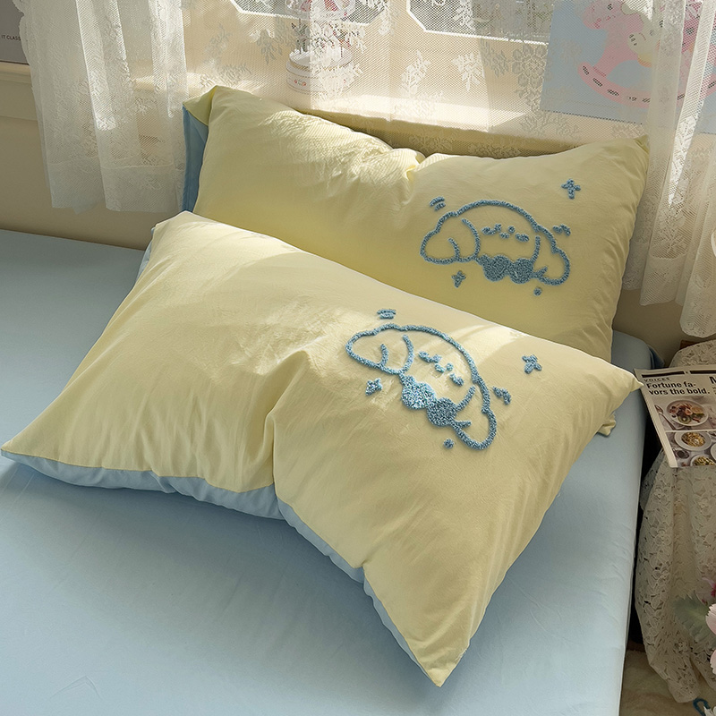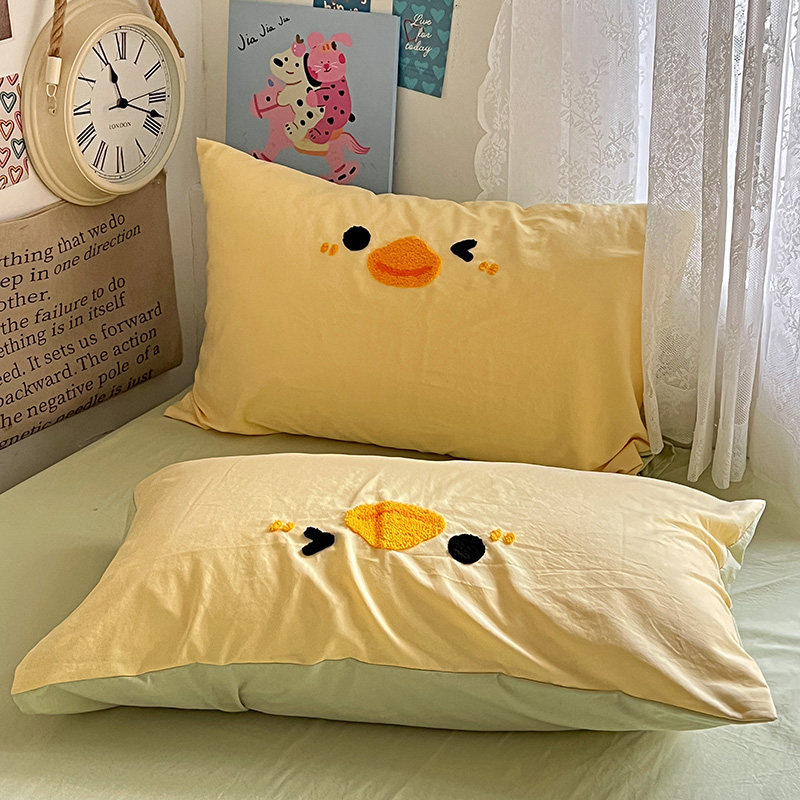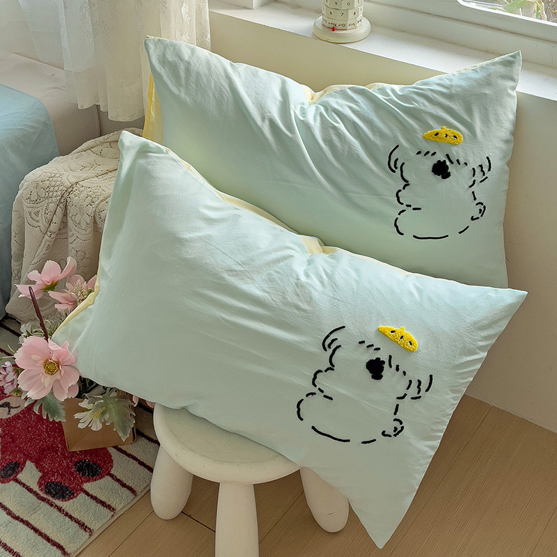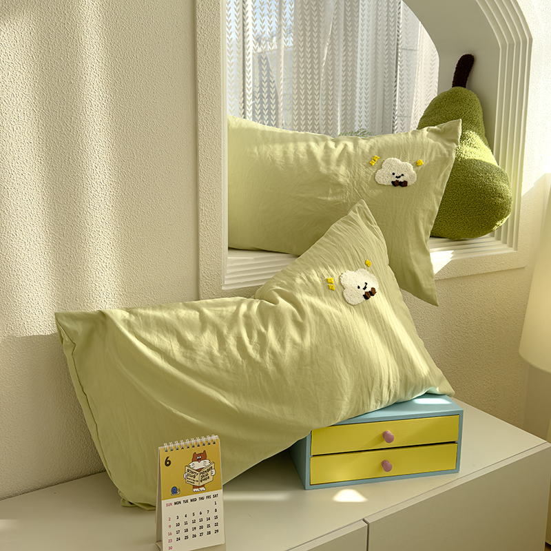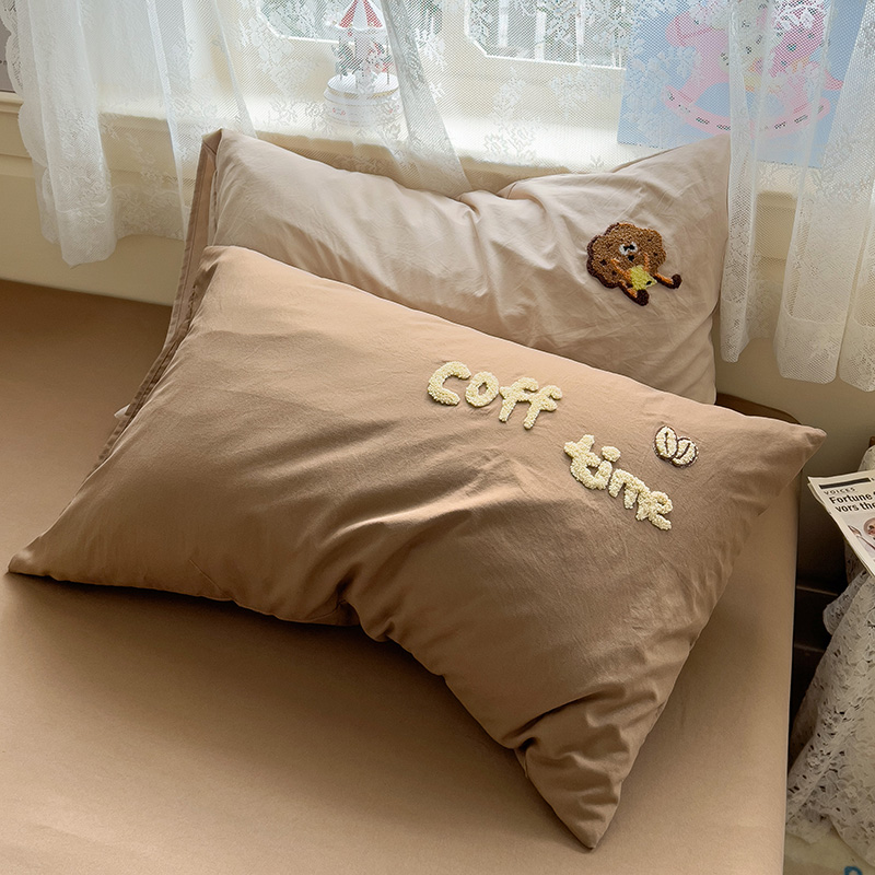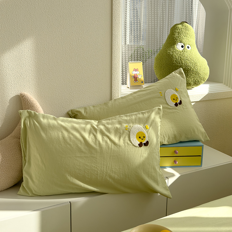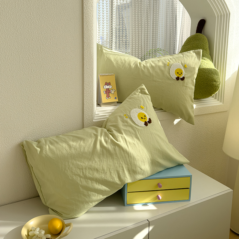 曼谷 新款毛巾绣四件套ins煤球图案柔软磨毛水洗棉套件 煤球-芝士绿,煤球-芝士绿