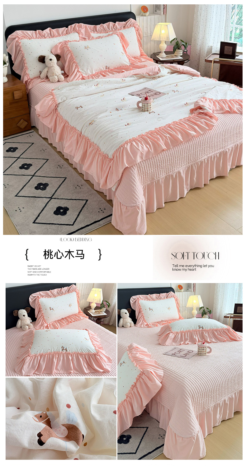 铠畅 2026新款法式宽边水洗棉泡芙纱床盖款夏被四件套 桃心木马