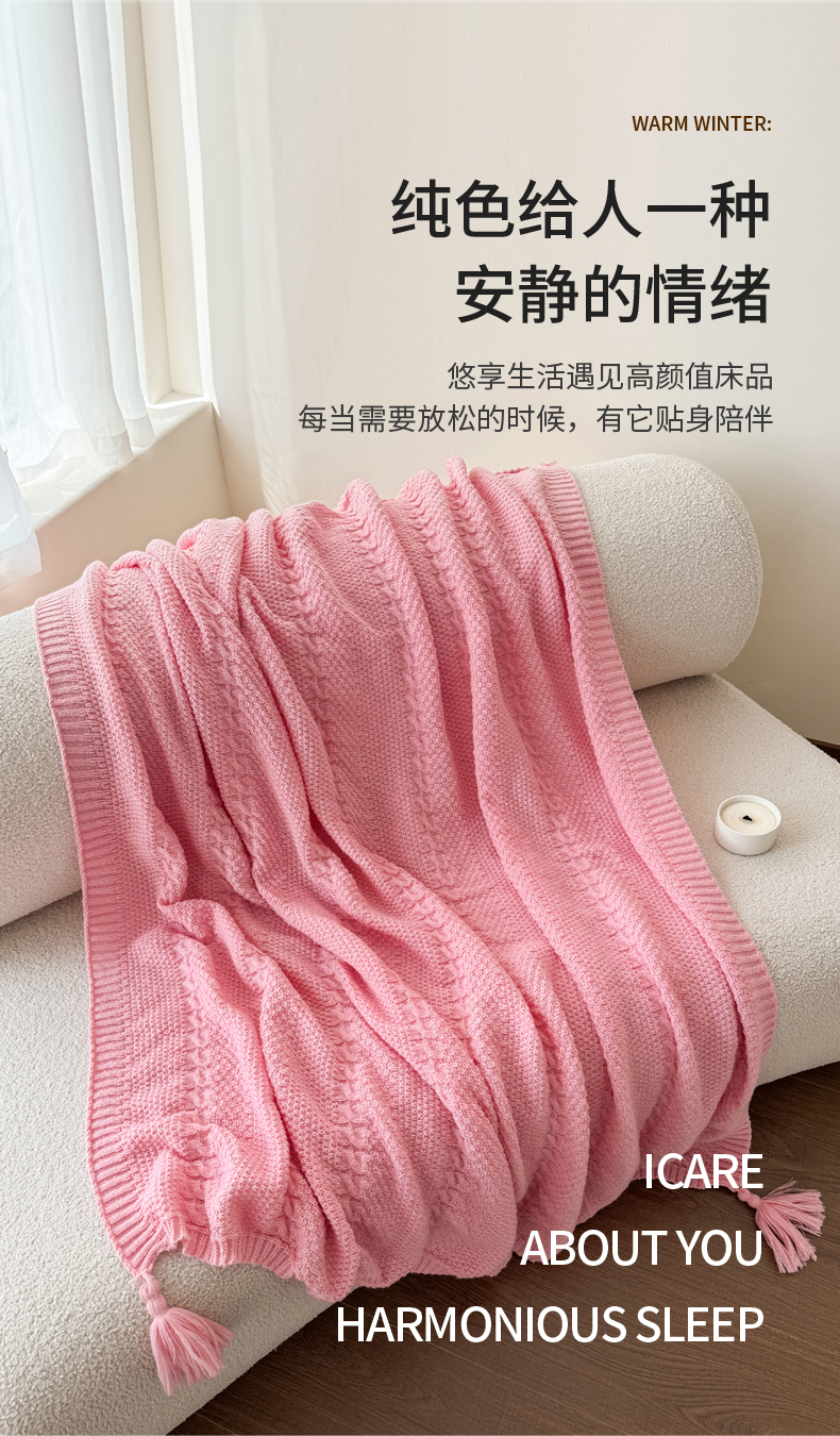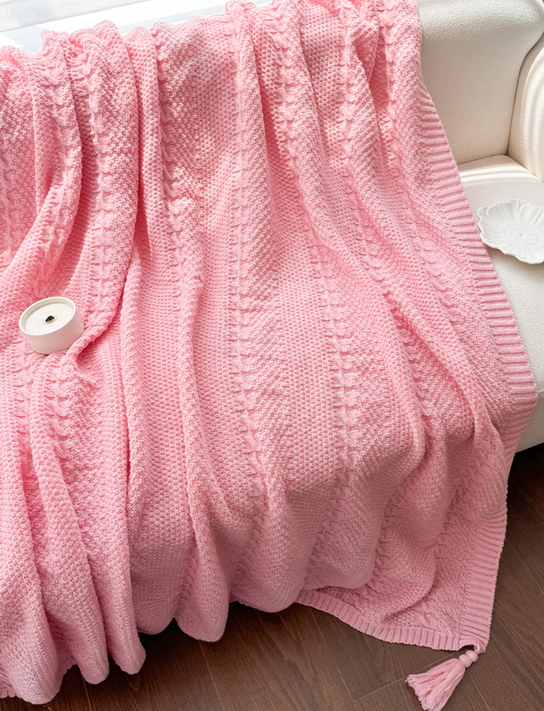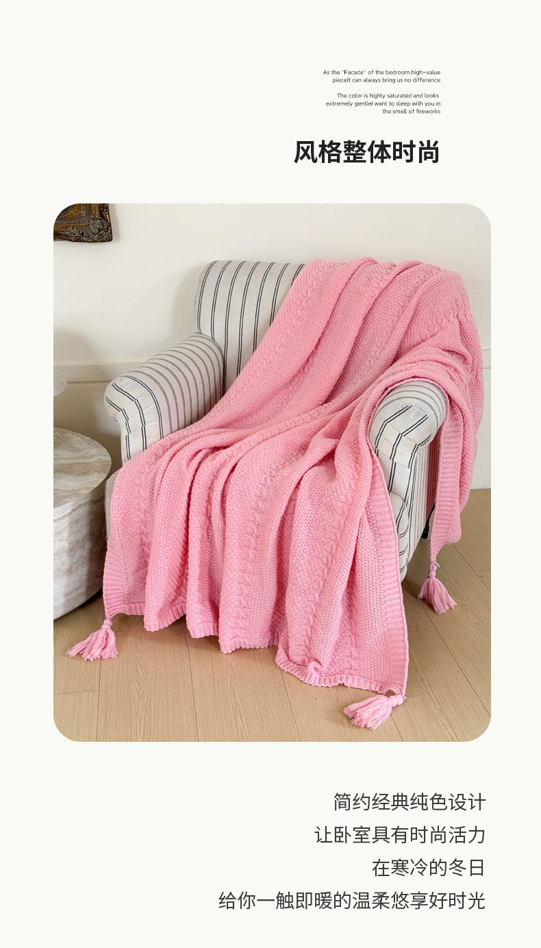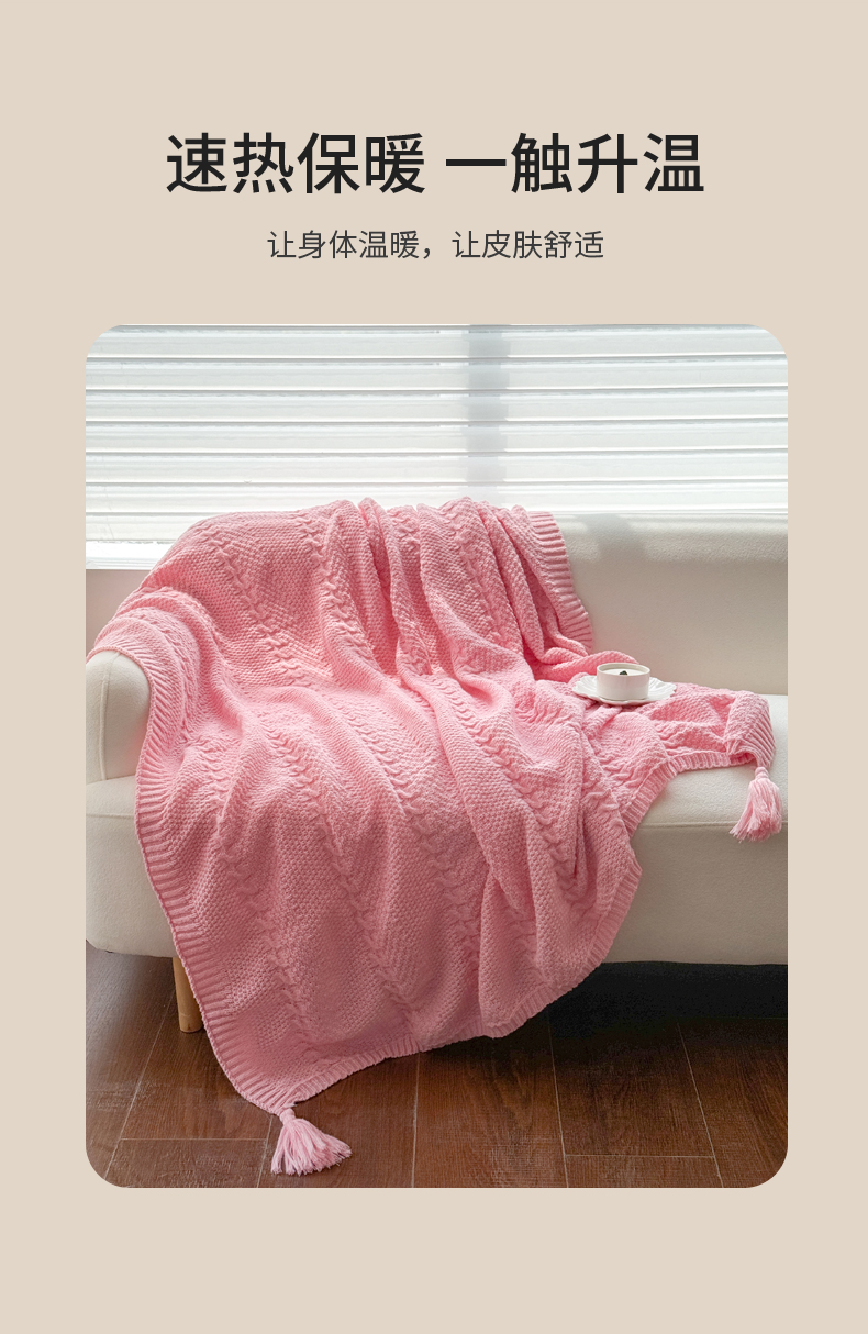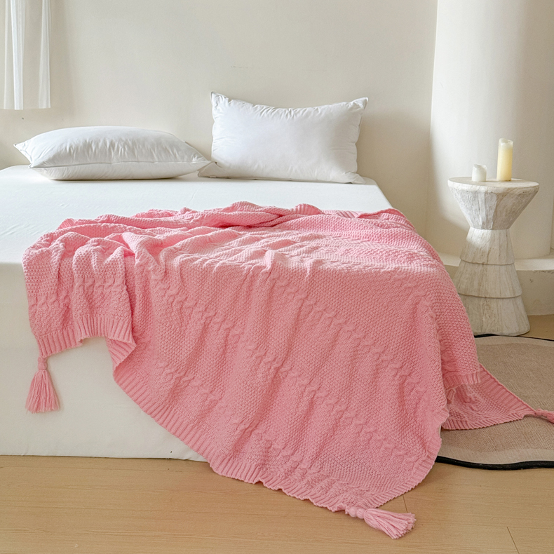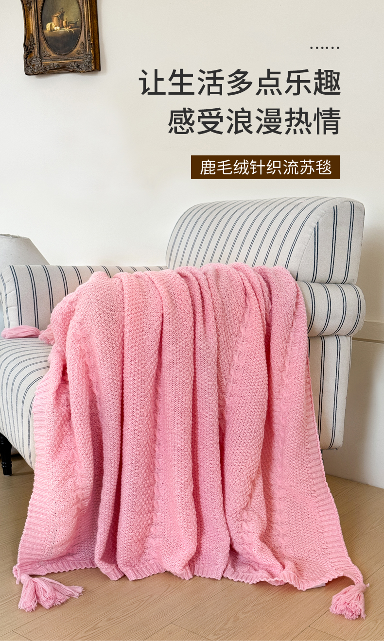 商品名称:丹本家纺 2026新款针织毛毯鹿毛绒纯色流苏航空休闲毯办公午睡盖毯多功能装饰毯 玫瑰粉