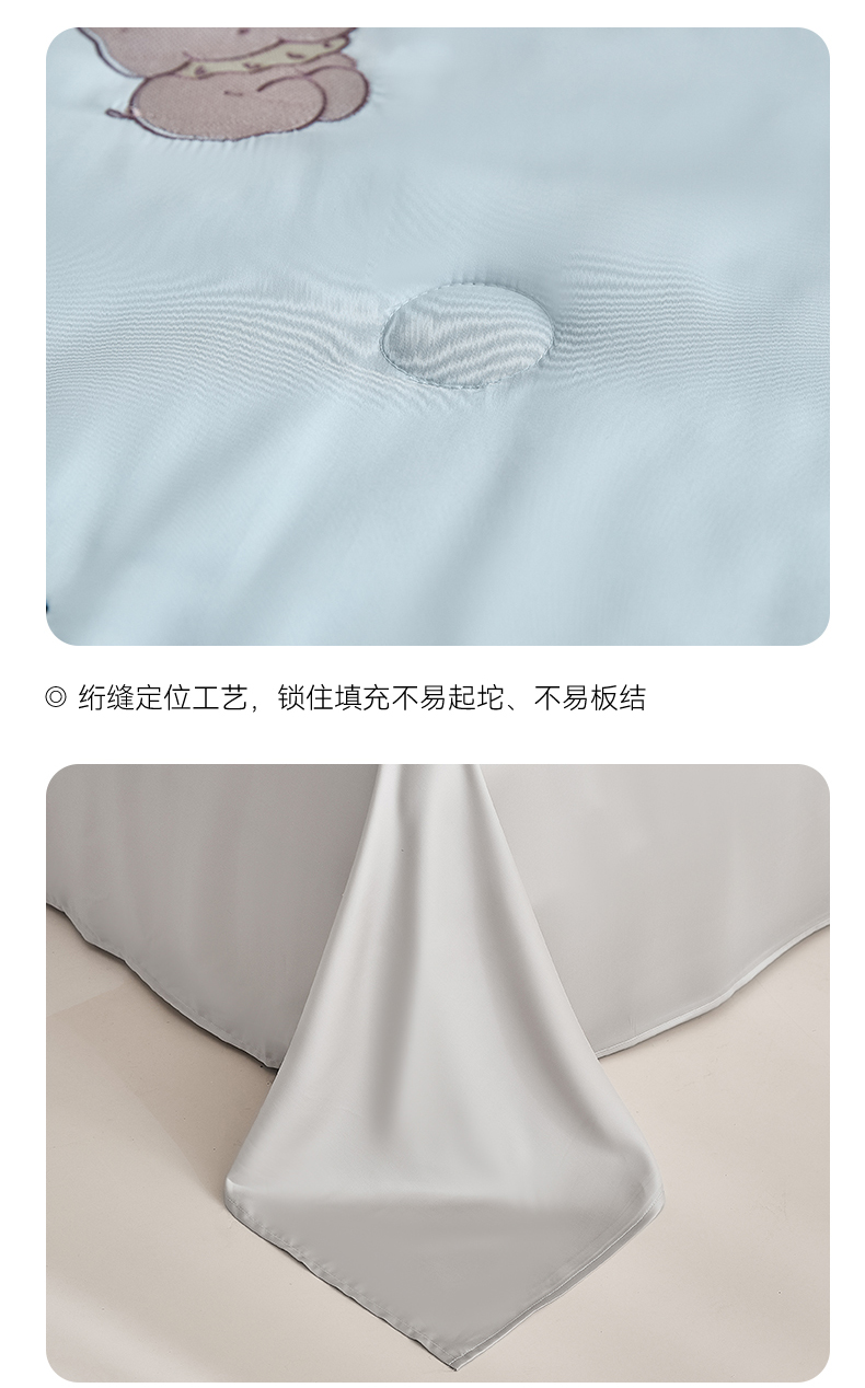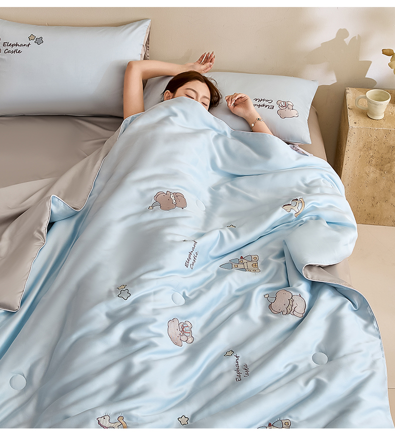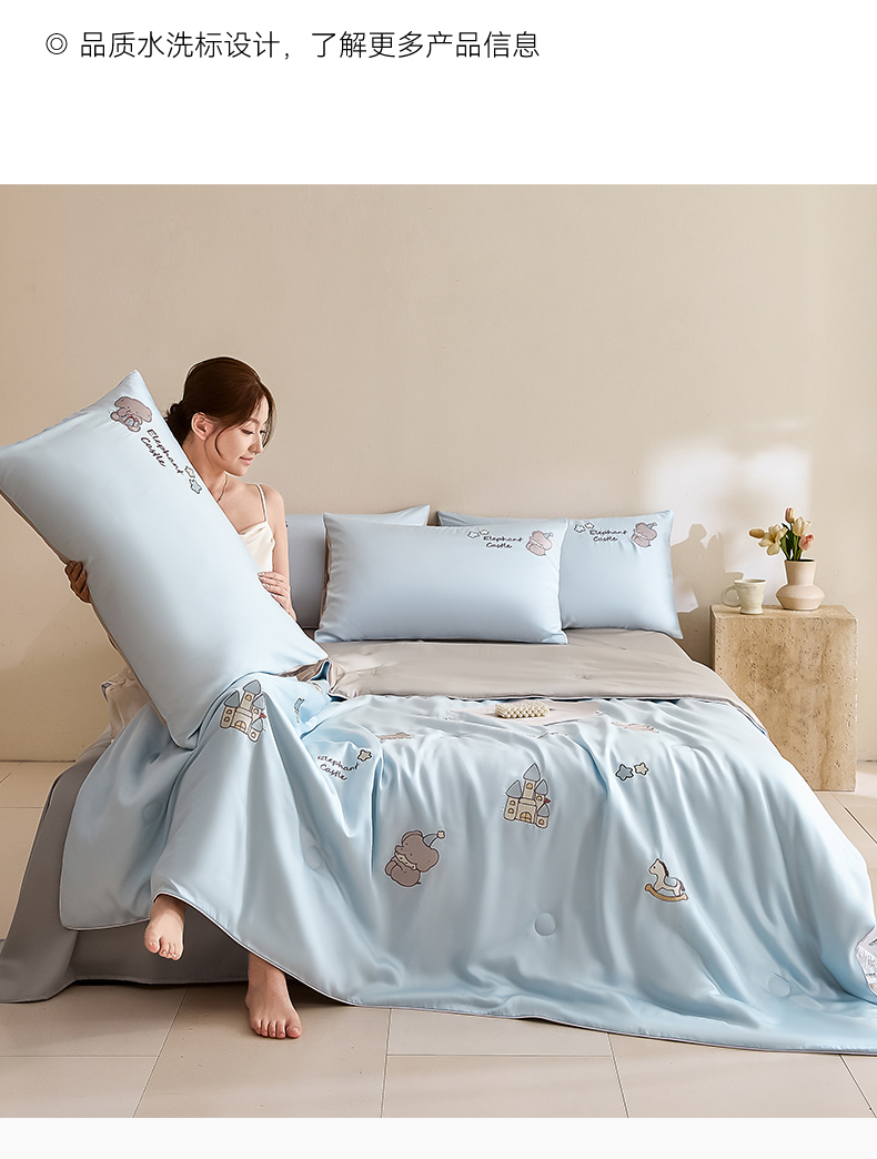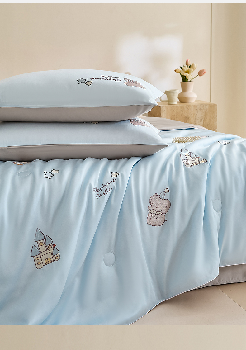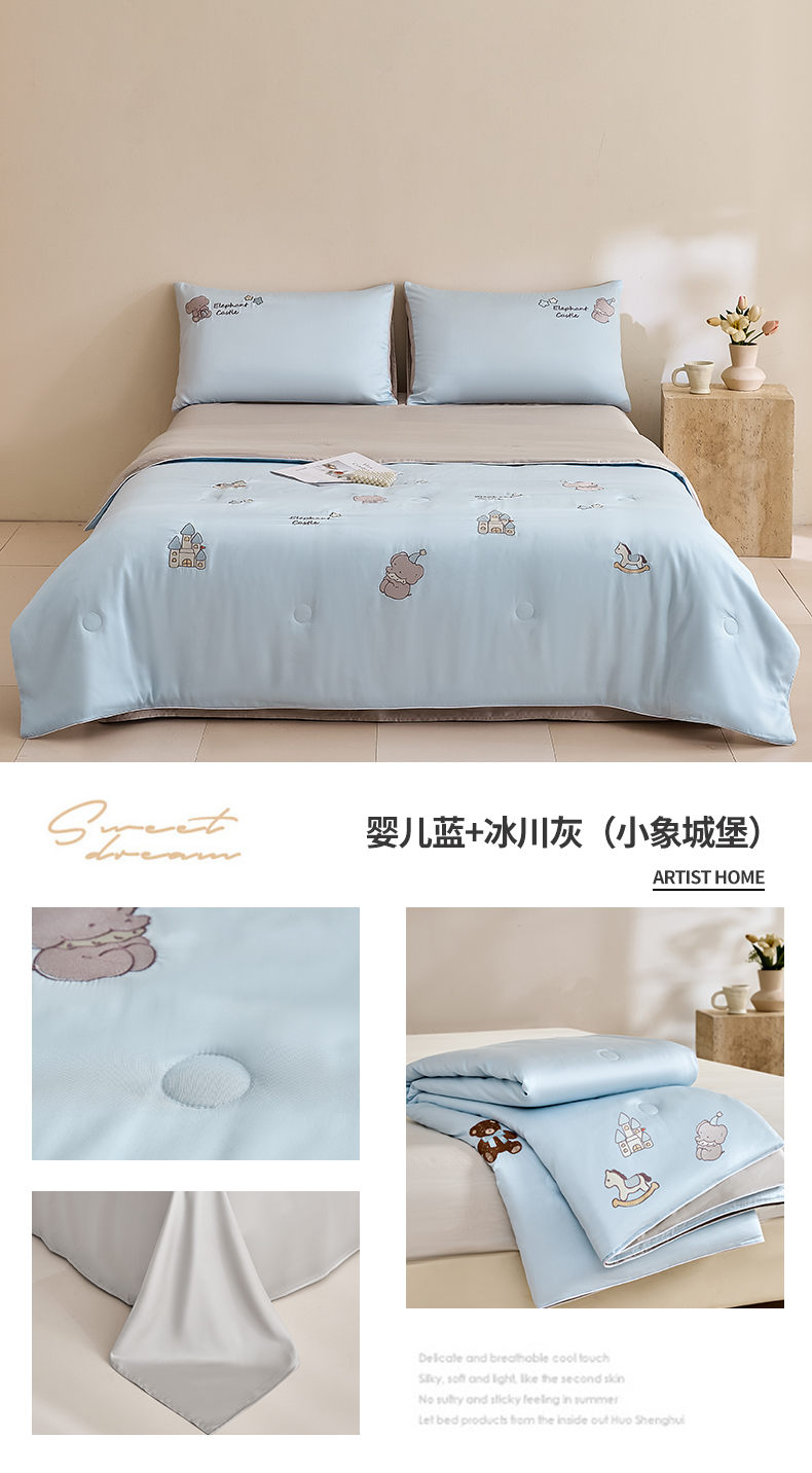 • 91家纺网 家纺一手货源 找家纺 DC 2026新款A类兰精天丝麻绳平绣系列夏被四件套 婴儿蓝+冰川灰(小象城堡)