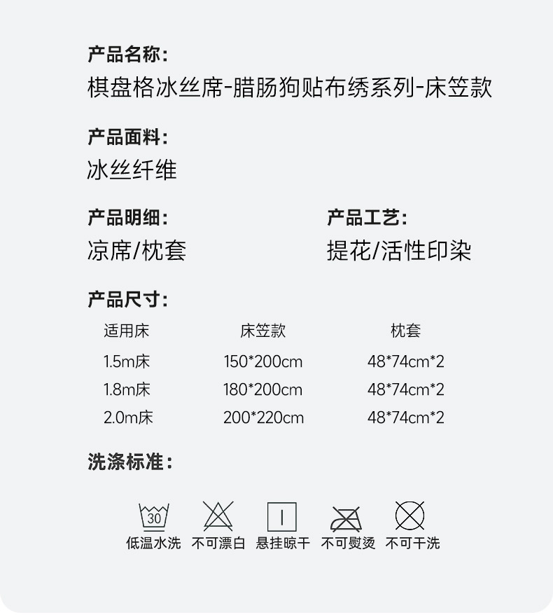 (总)小牛席业 2026新款棋盘格冰丝席(腊肠狗贴布绣)凉席三件套-床笠款,腊肠狗贴布绣-粉色,腊肠狗贴布绣-灰色,腊肠狗贴布绣-咖色,腊肠狗贴布绣-蓝色