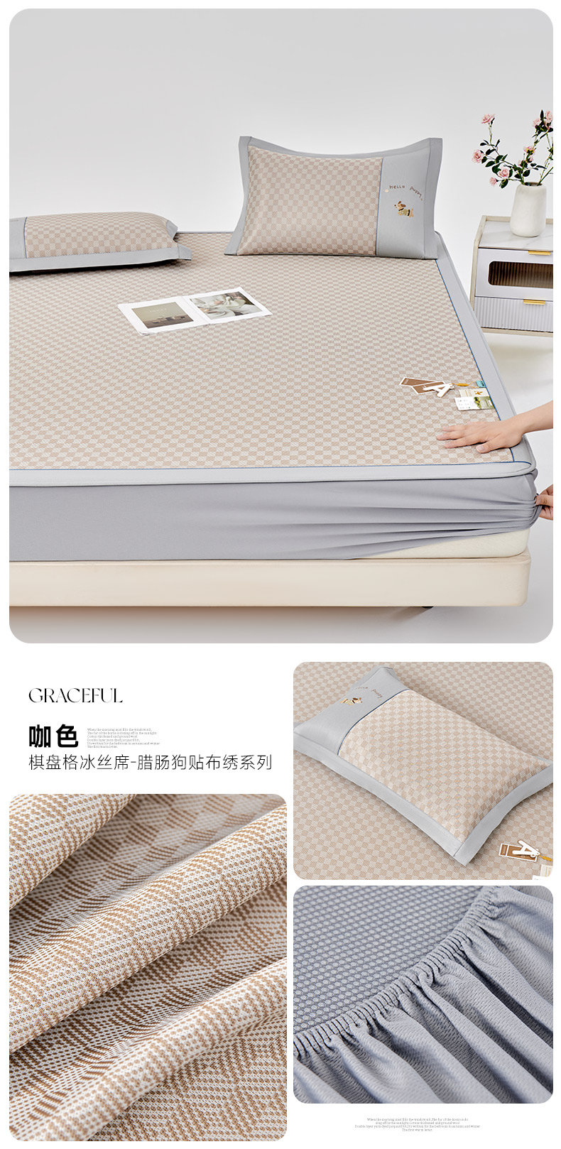 商品名称:小牛席业 2026新款棋盘格冰丝席(腊肠狗贴布绣)凉席三件套-床笠款 腊肠狗贴布绣-咖色