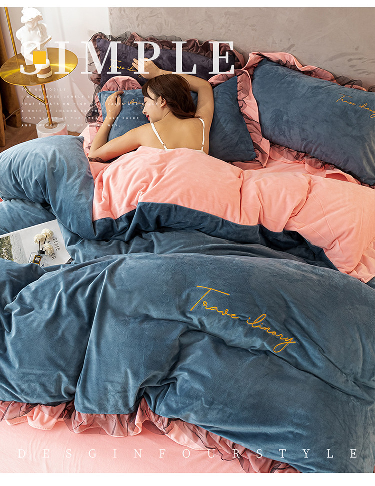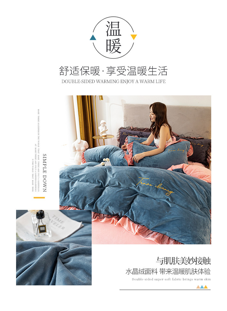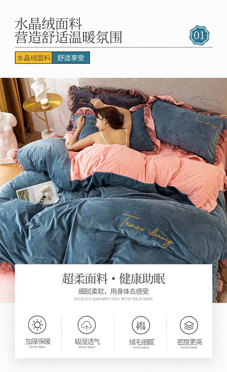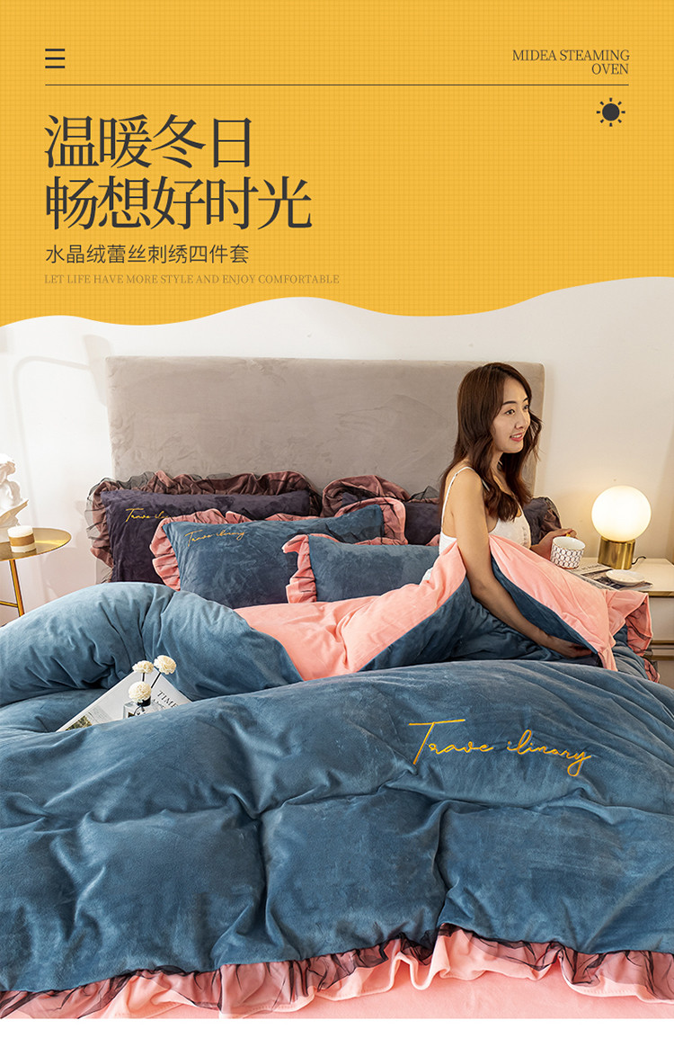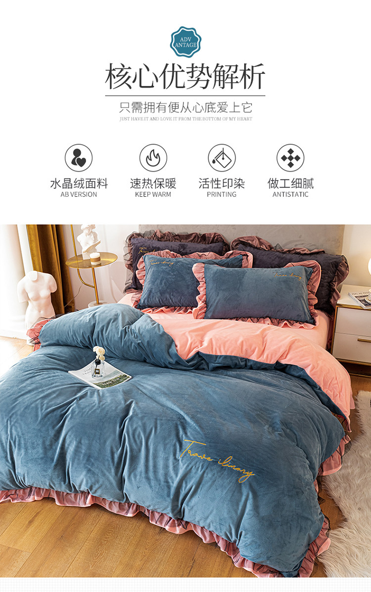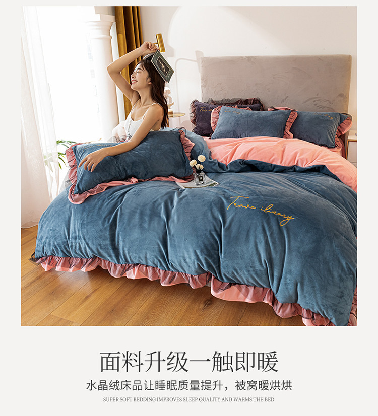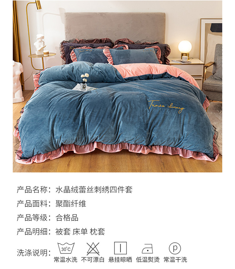 蓝巢 2020新款水晶绒蕾丝边四件套 绒-宾利蓝浅粉
