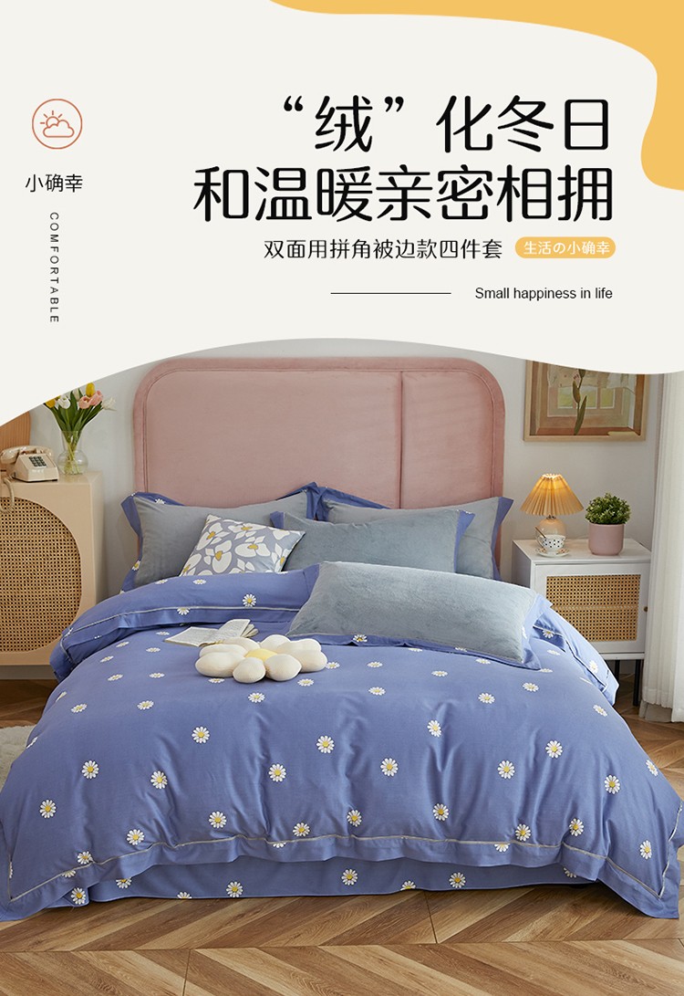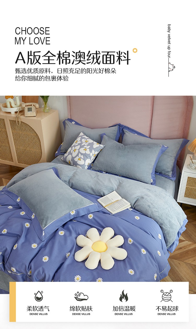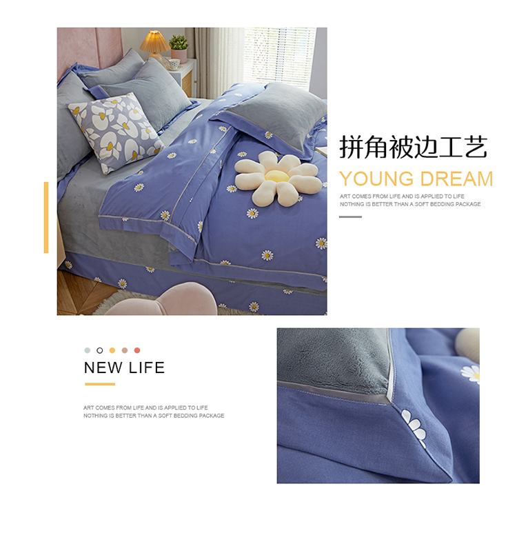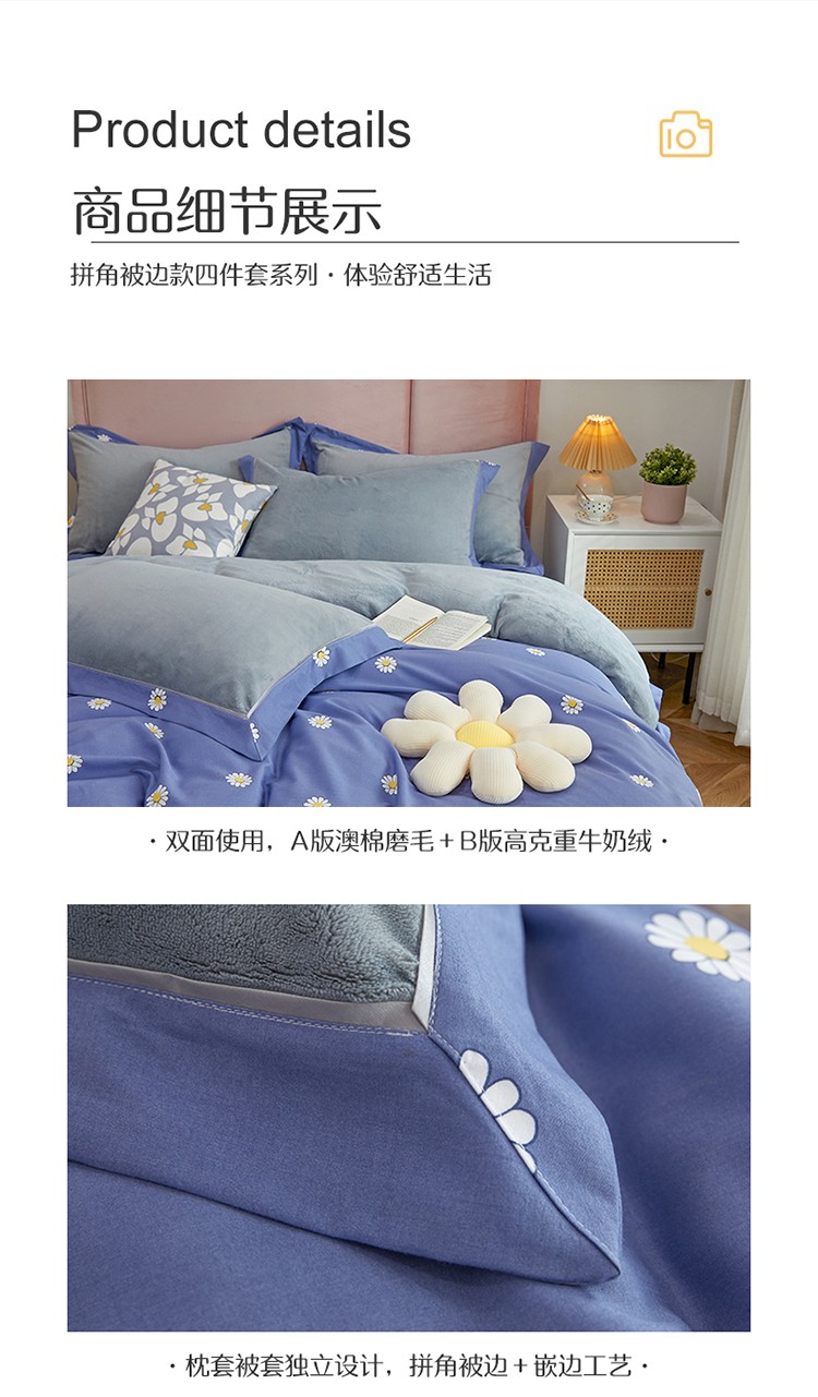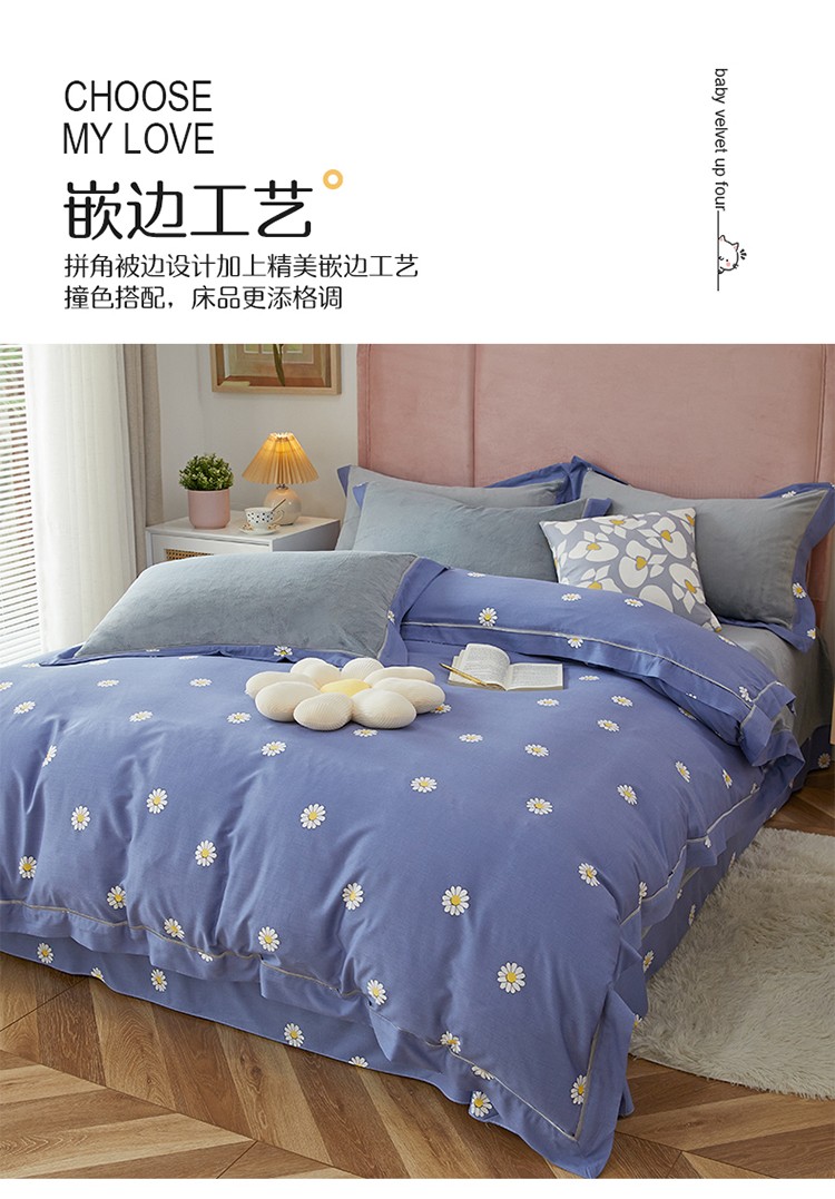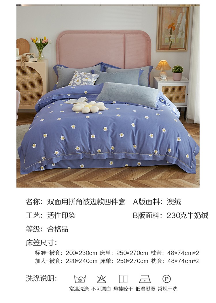商品名称:杜先生 2021新款拼角被边款澳绒牛奶绒四件套 小雏菊-蓝