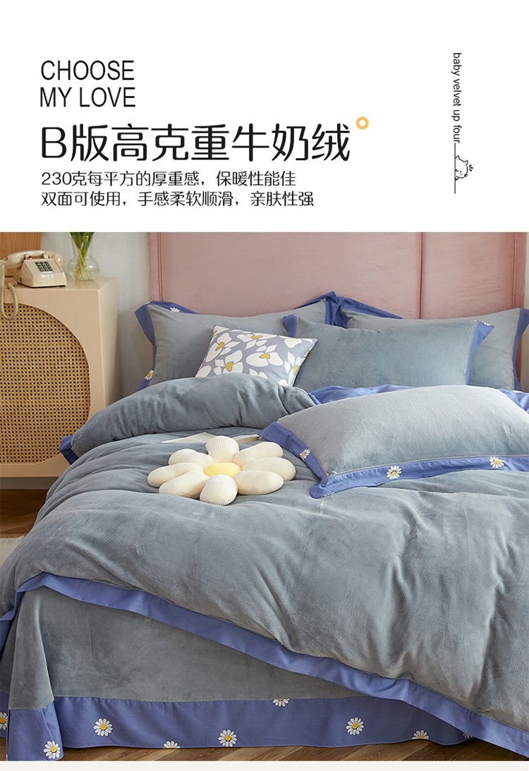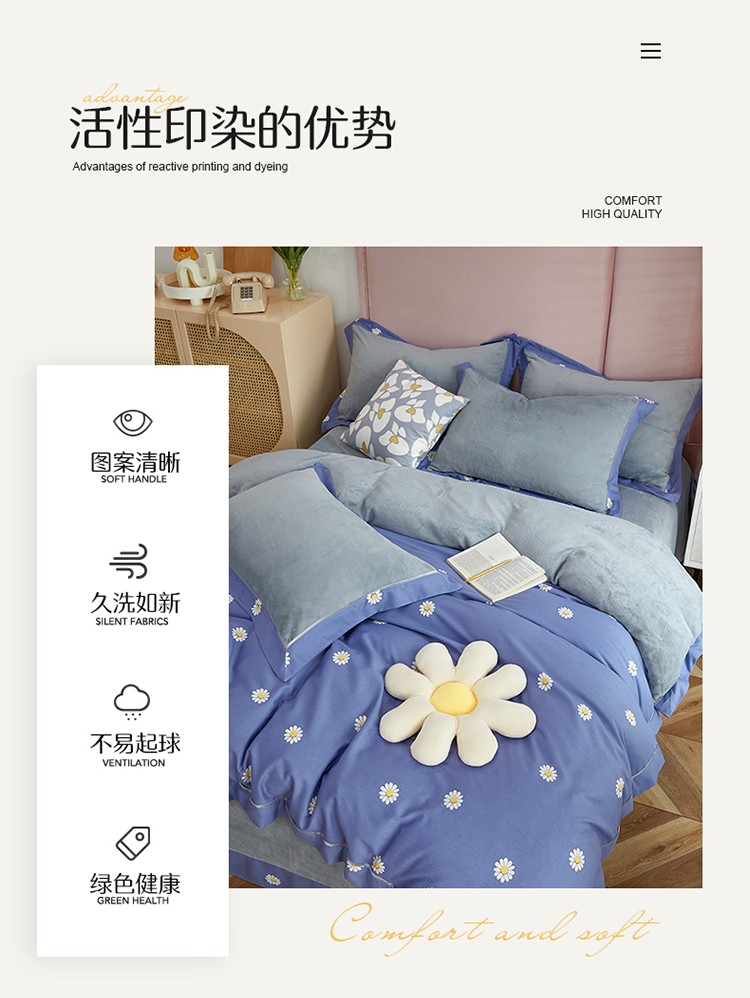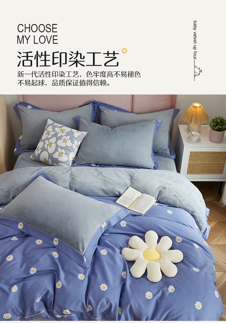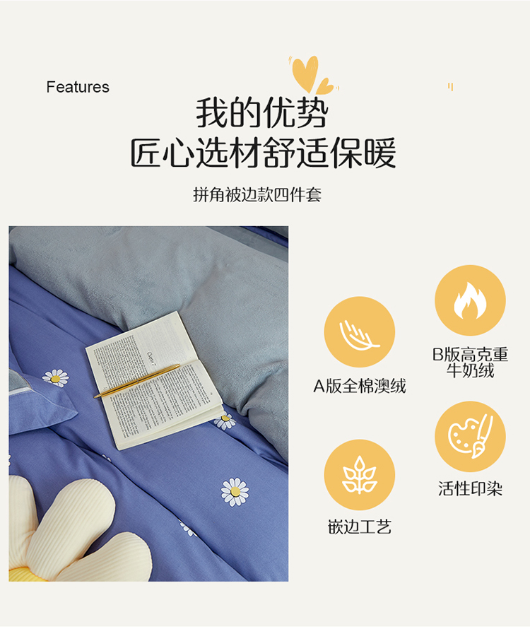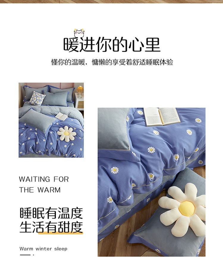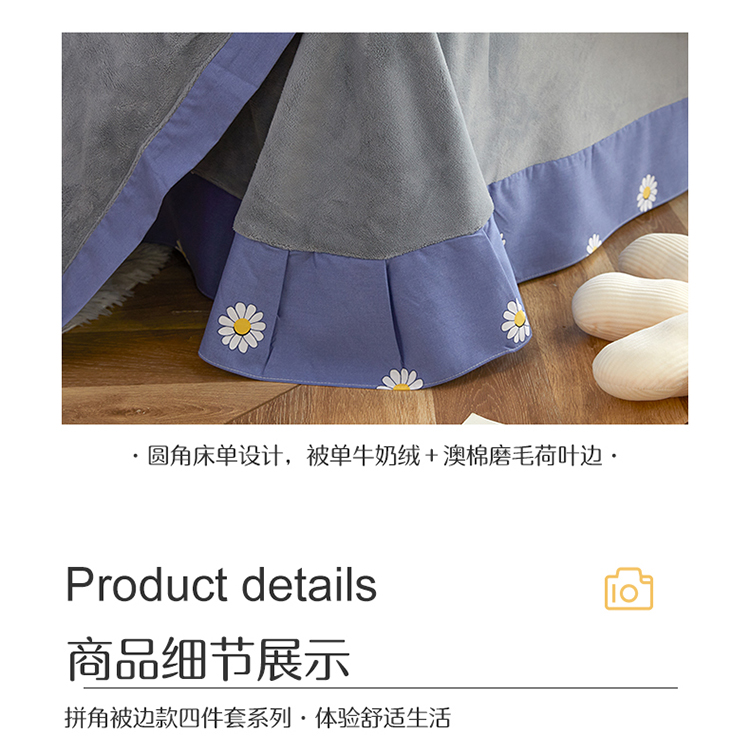 商品名称:杜先生 2021新款拼角被边款澳绒牛奶绒四件套 小雏菊-蓝