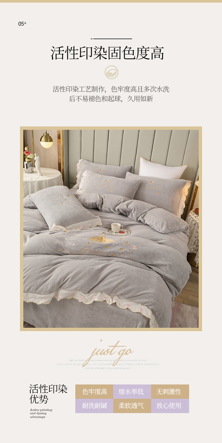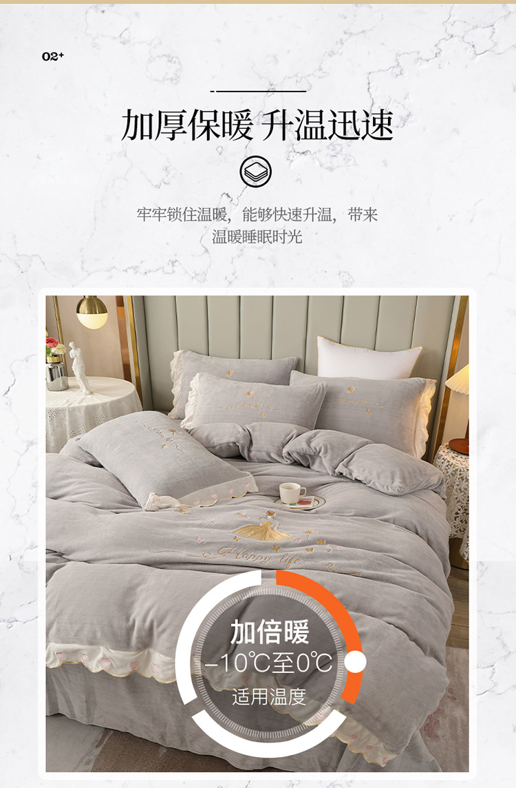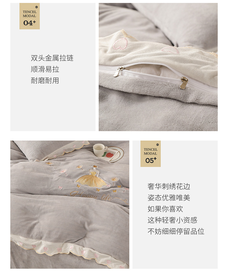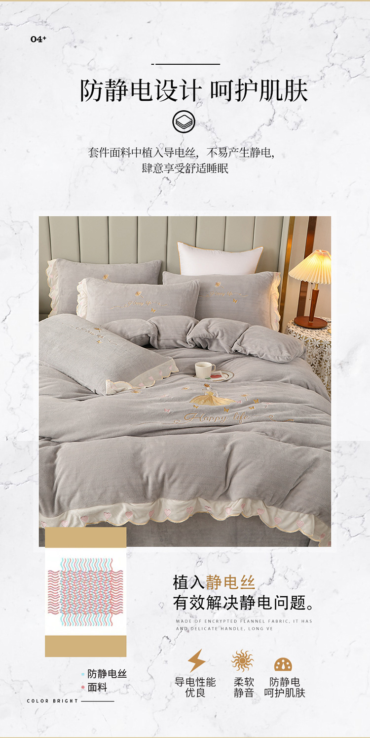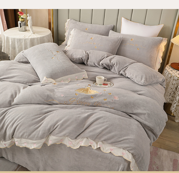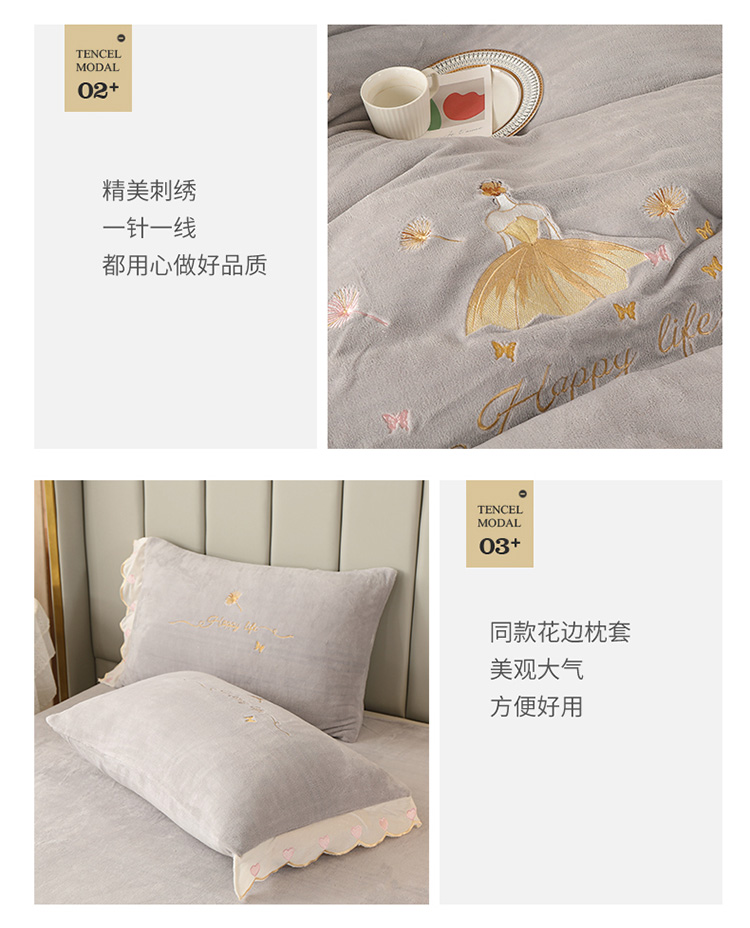 商品名称:沐辰 2021新款牛奶绒刺绣四件套-舒蕾公主 舒蕾公主-灰