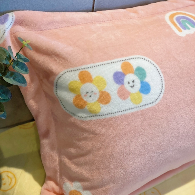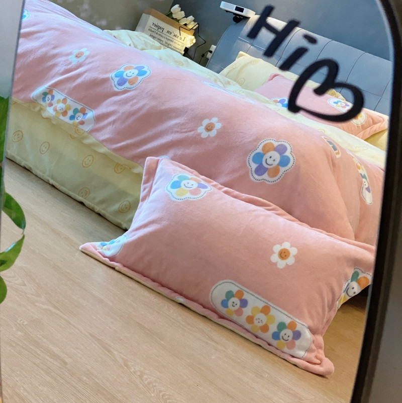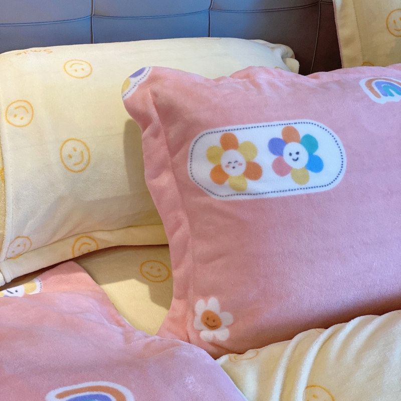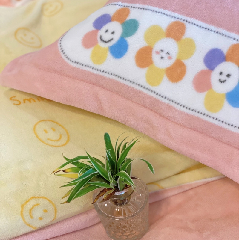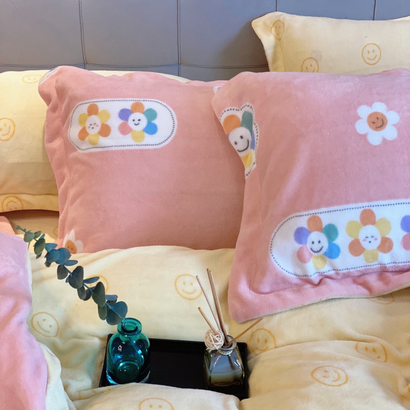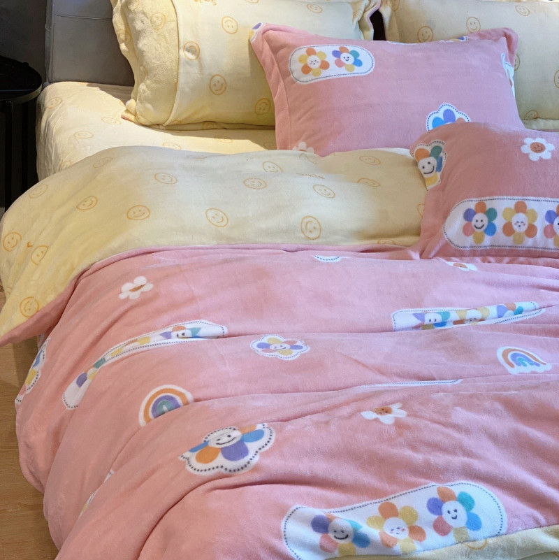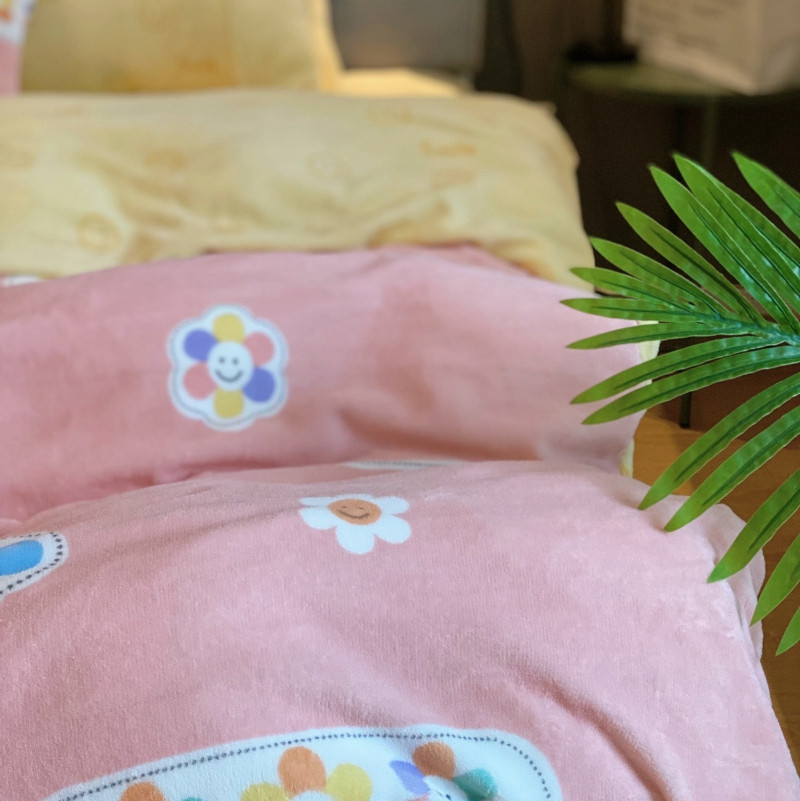 棉生活 2021新款小清新牛奶绒四件套 花花笑脸粉