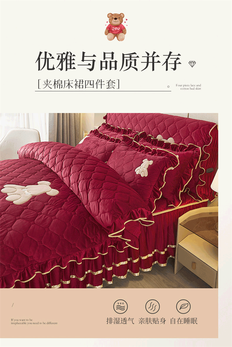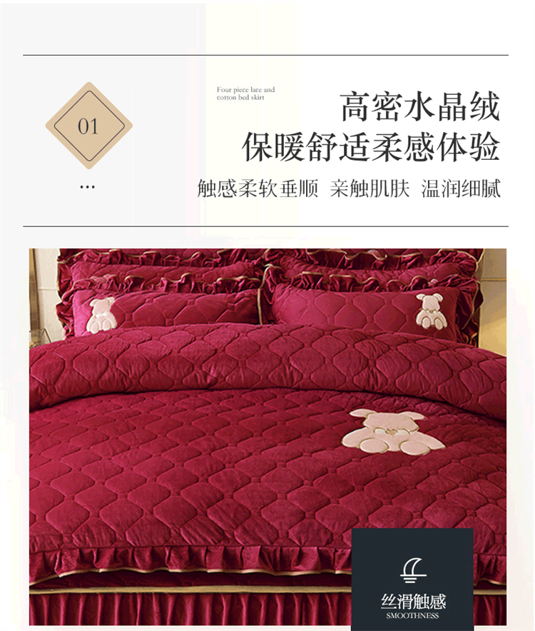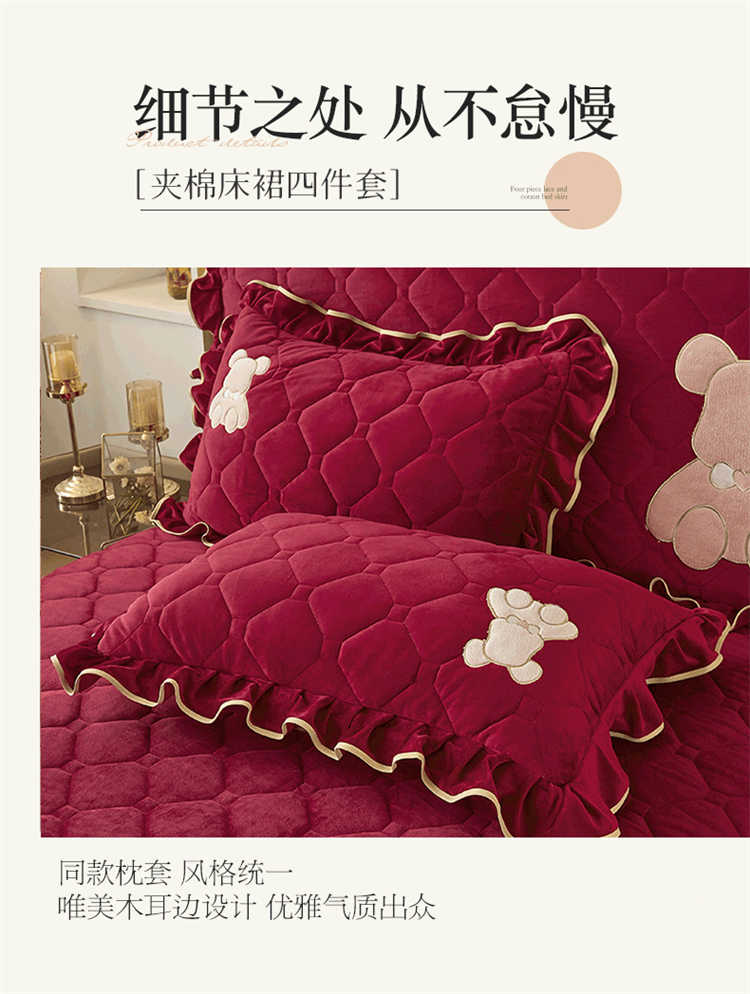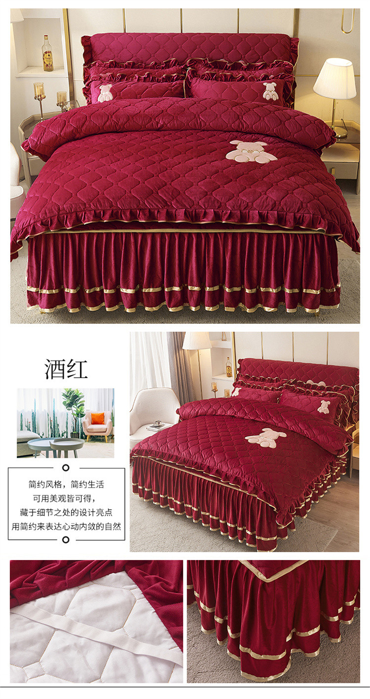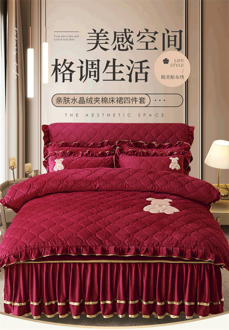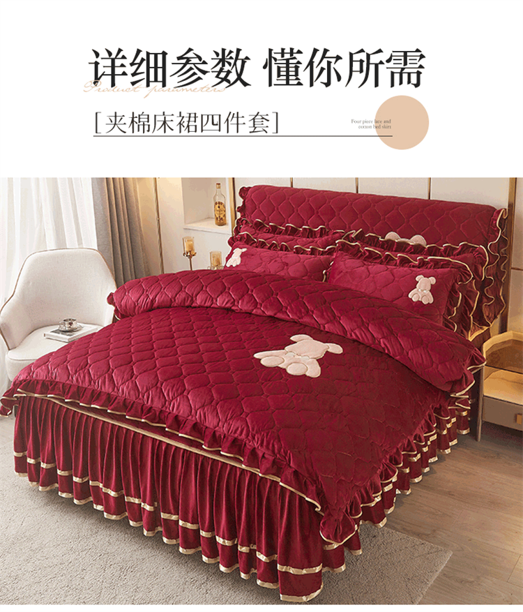 当前位置: 91家纺网 > 商品网购 > 床品套件 > 四件套 > 水晶绒四件套 > 屹成家纺 2024新款亲肤水晶绒夹棉床裙四件套-小熊款 酒红