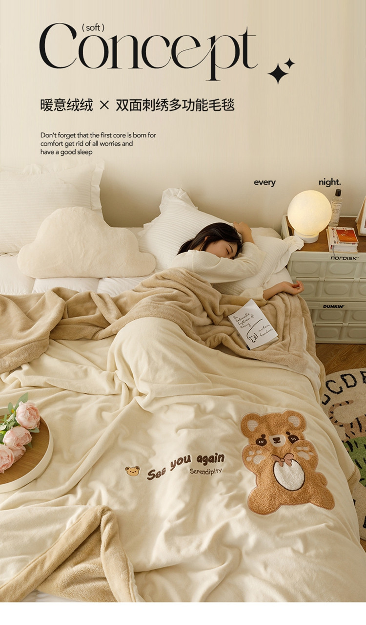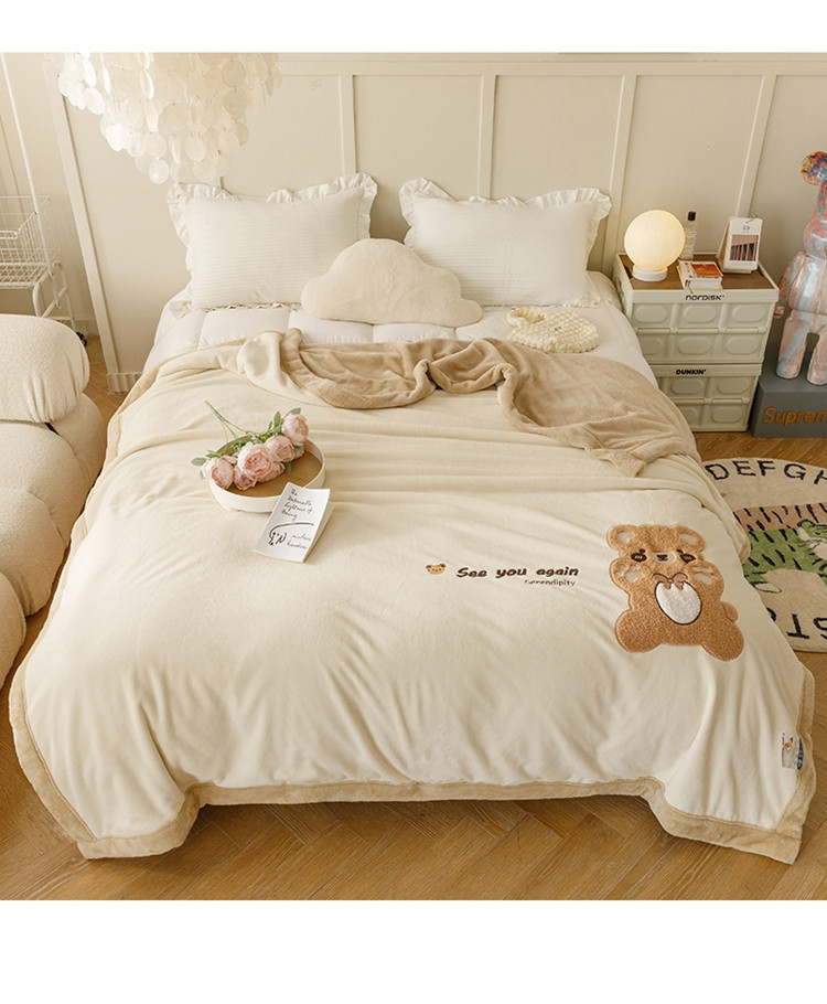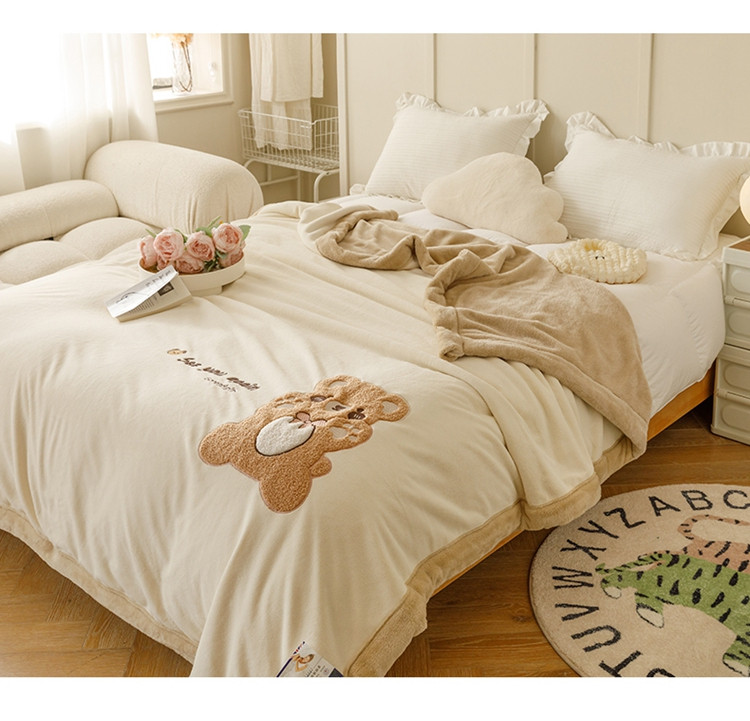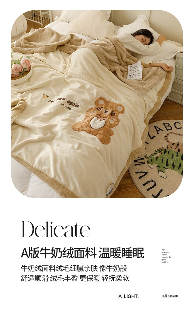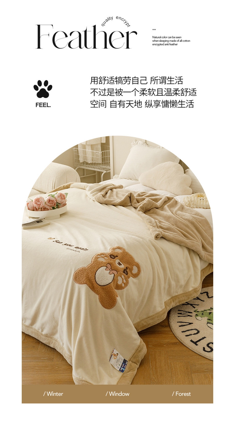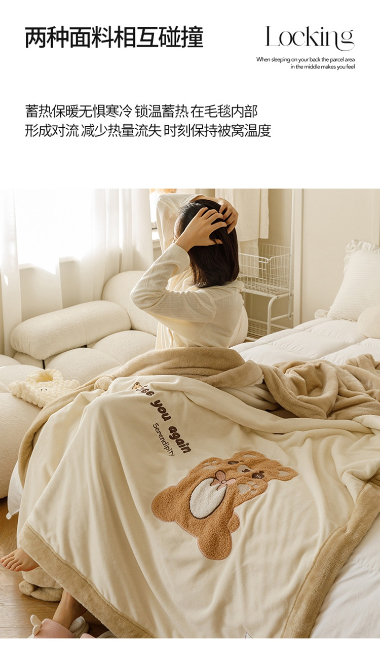 商品名称:铭动 23新款牛奶绒羊羔绒双面贴布刺绣小熊毛毯盖毯披肩毯 大肚熊+米色