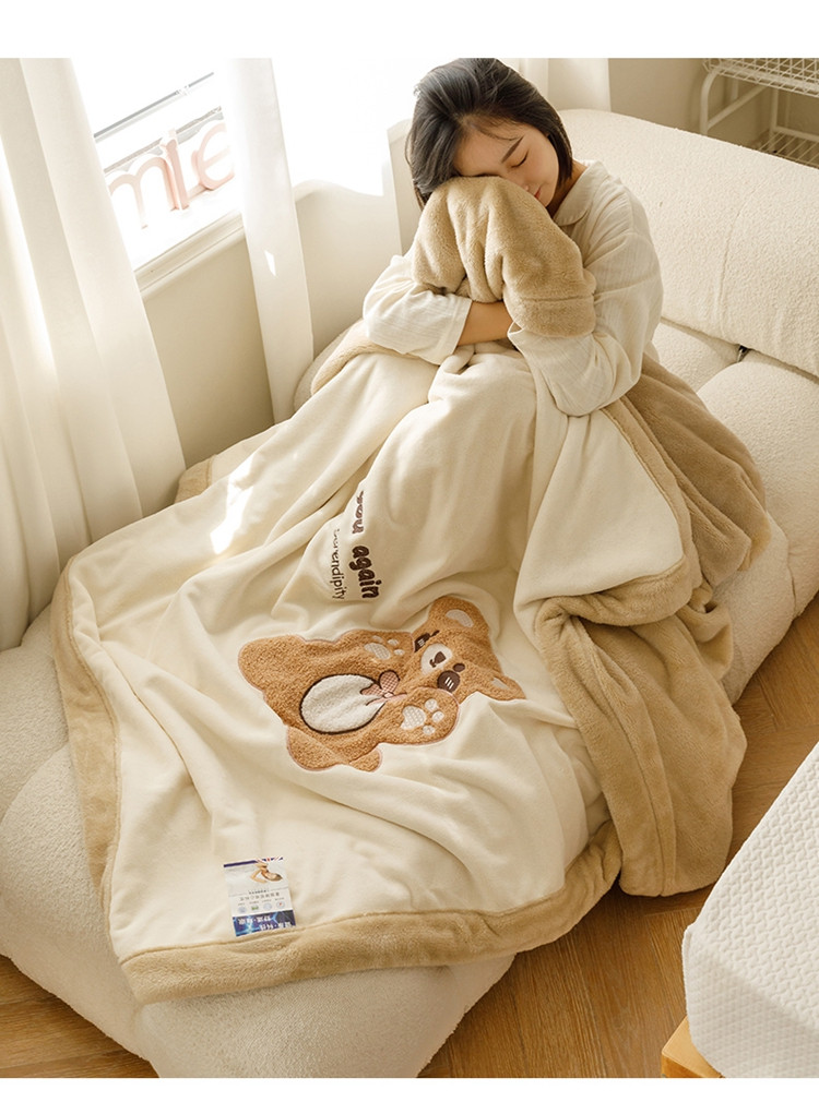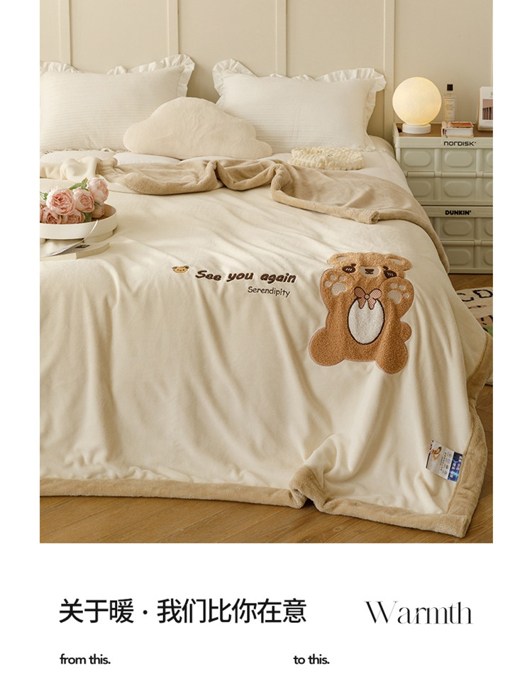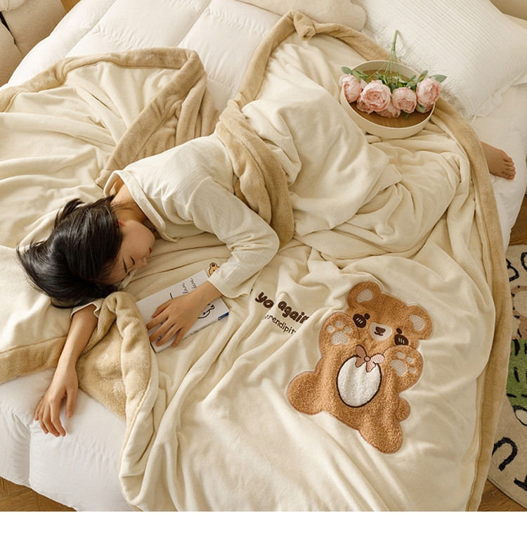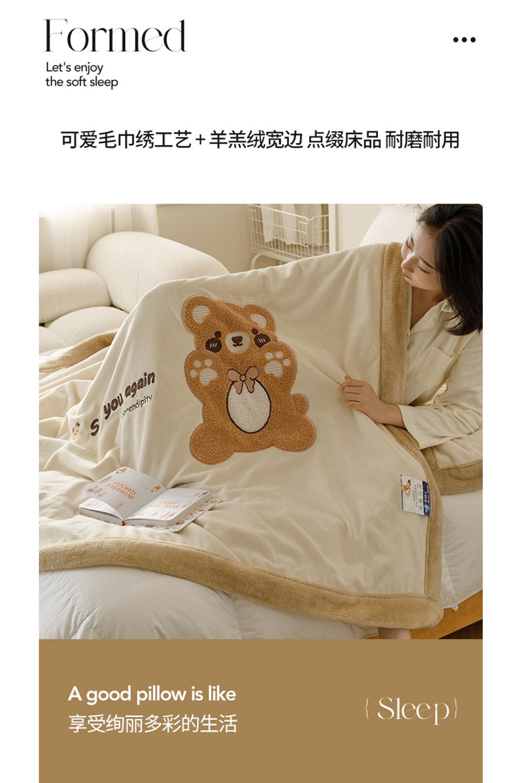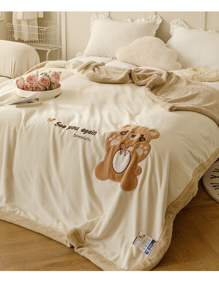 铭动 23新款牛奶绒羊羔绒双面贴布刺绣小熊毛毯盖毯披肩毯 大肚熊+米色