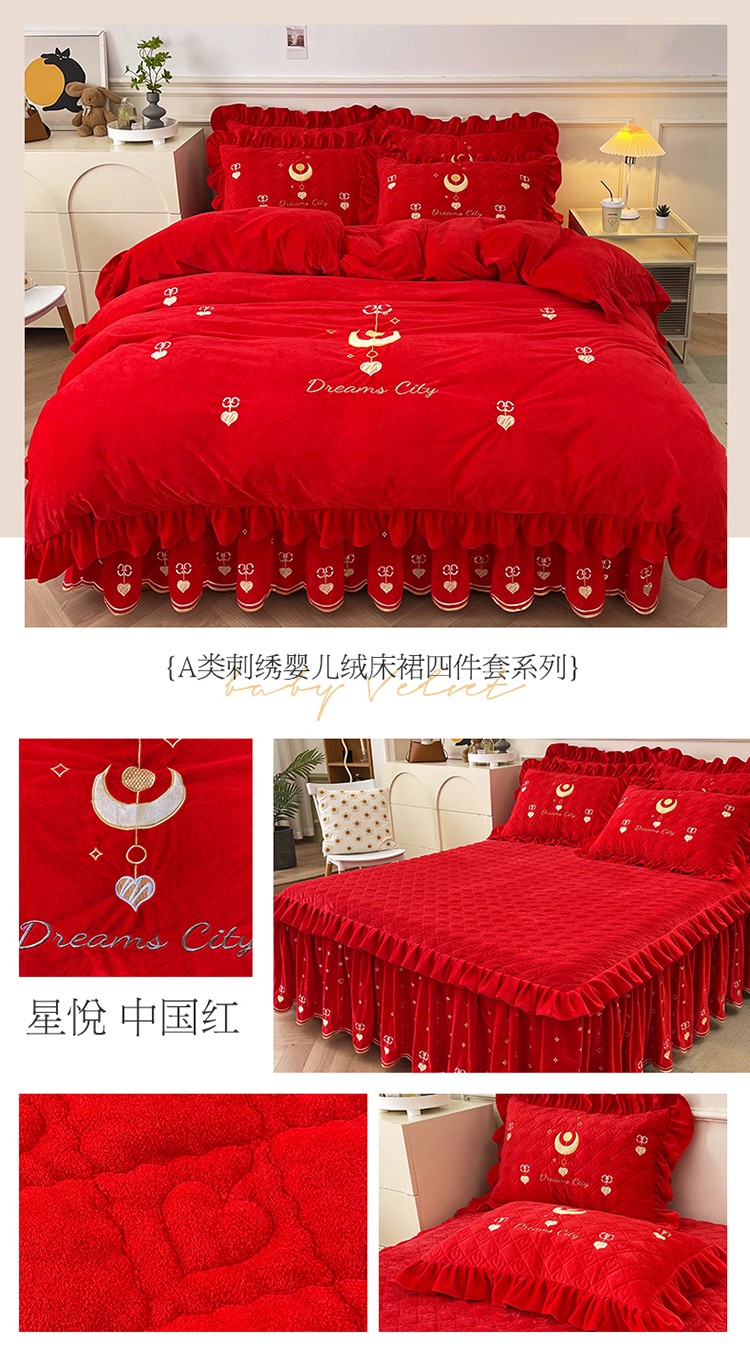 (总)宜凡家纺 2025新款婴儿绒压花全夹棉床裙四件套,韵雅-中国红,韵雅-黑天鹅