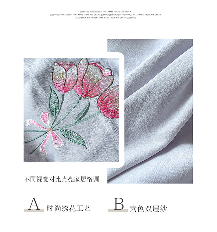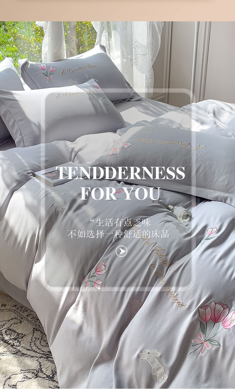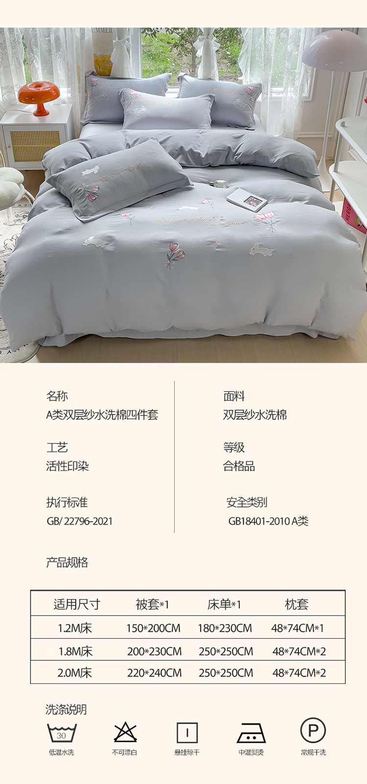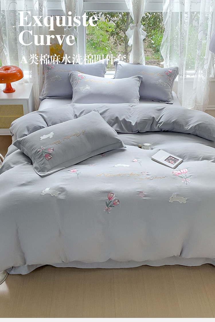 商品名称:2023春夏新品A类双层纱水洗棉麻四件套-郁金香系列 郁金香-冰川灰