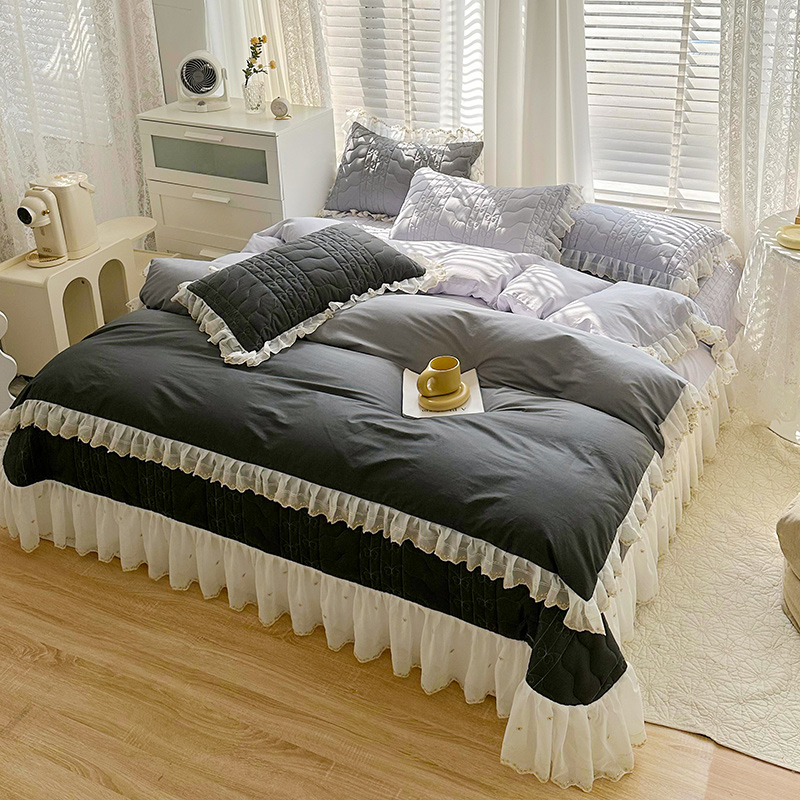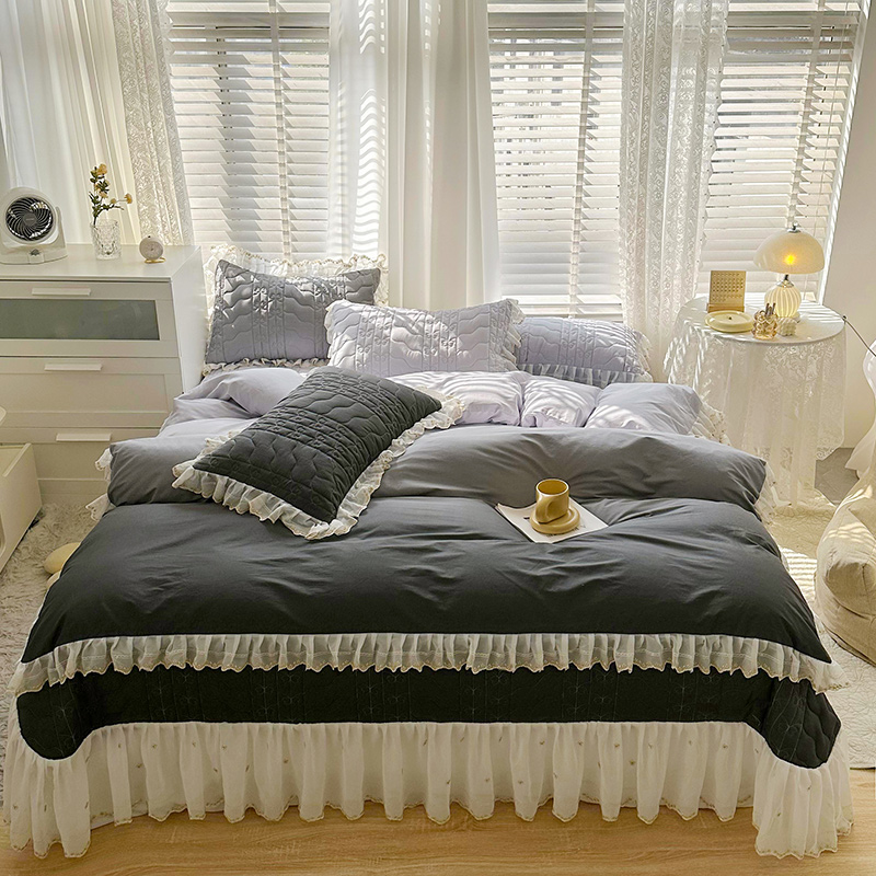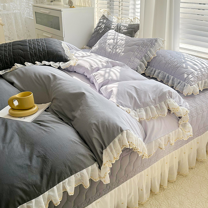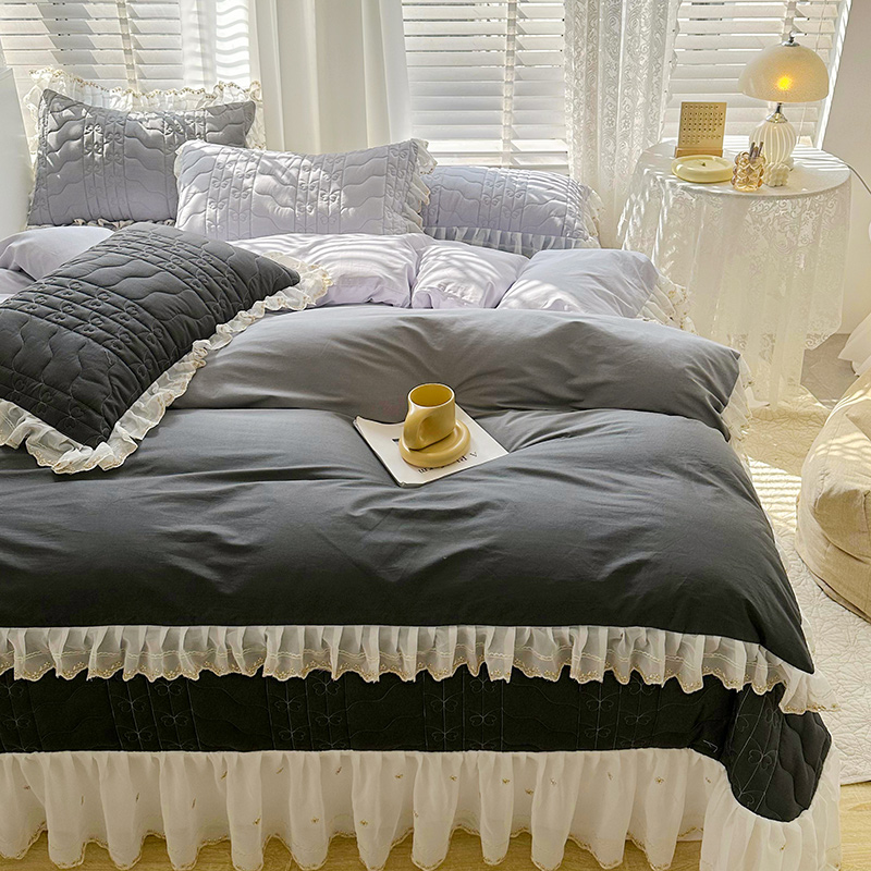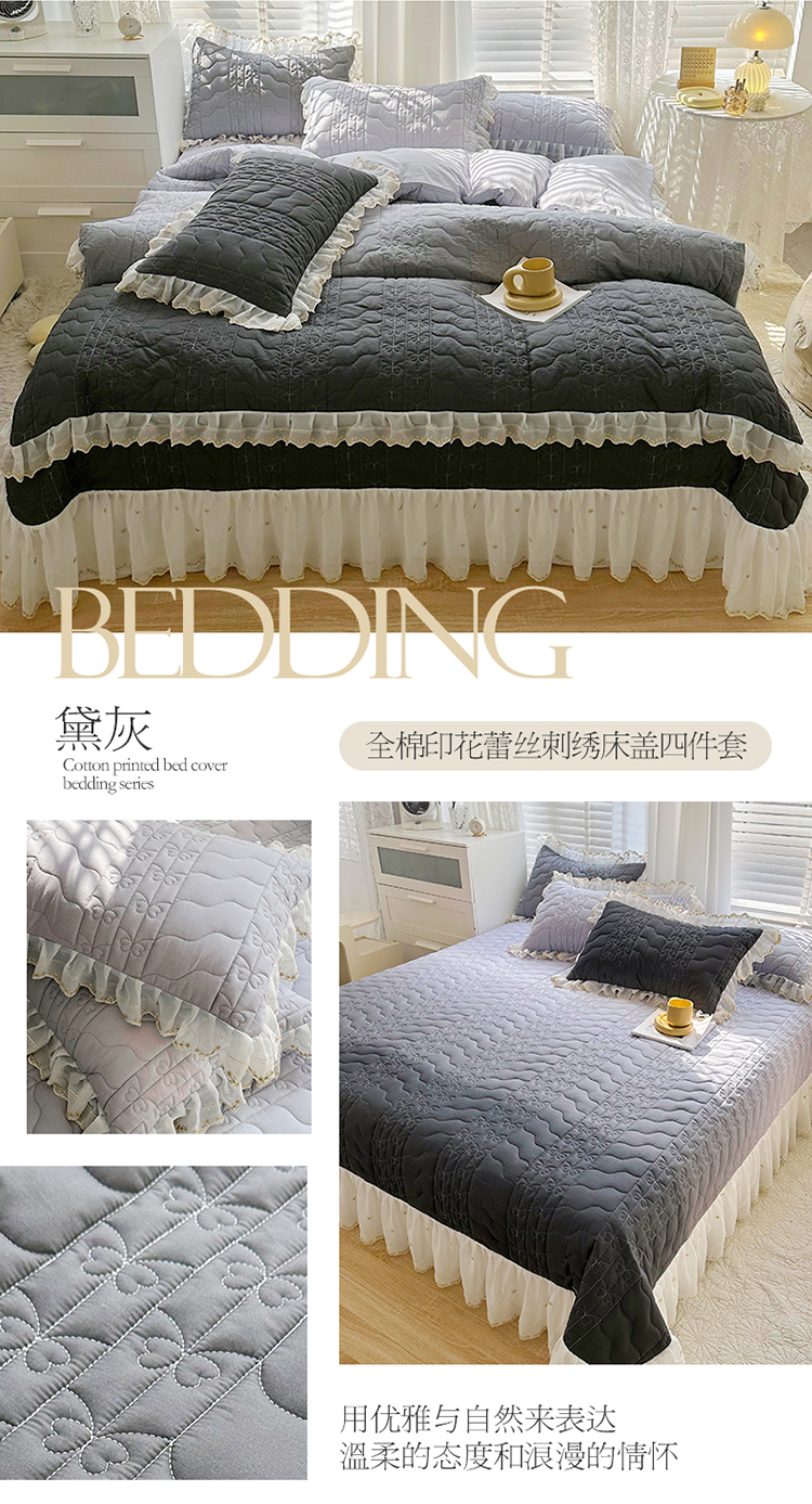 • 91家纺网 家纺一手货源 找家纺 宜凡 2023新款全棉蕾丝刺绣床盖四件套(单层被套) 黛灰