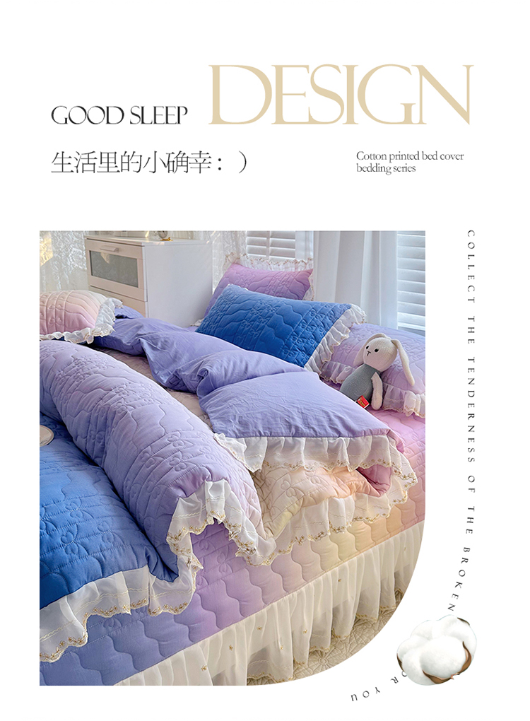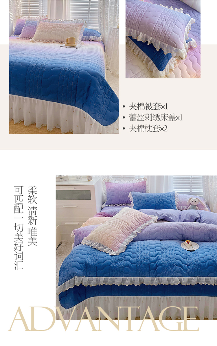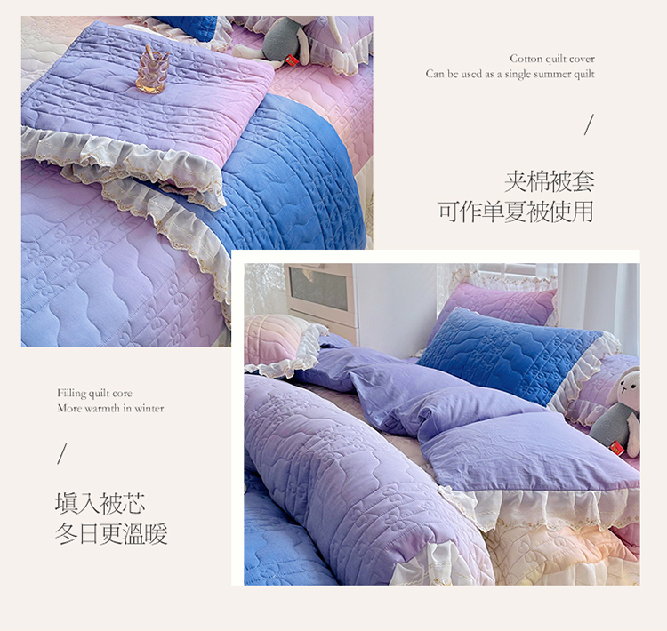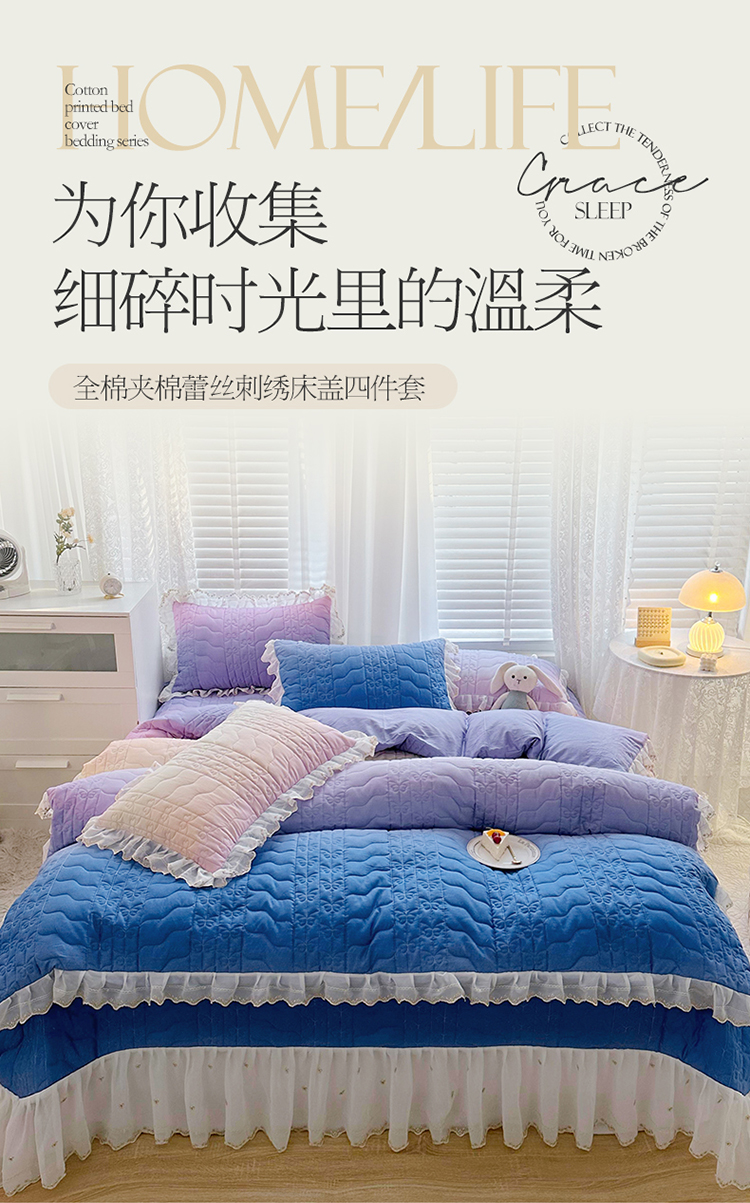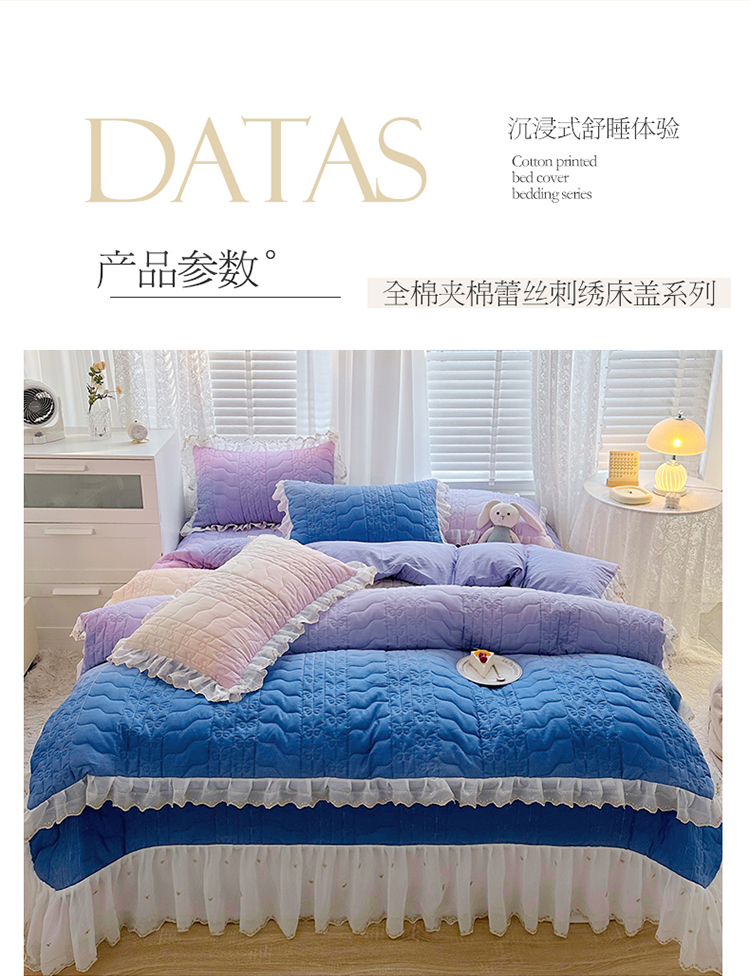 • 91家纺网 家纺一手货源 找家纺  2023新款全棉蕾丝刺绣床盖四件套(夹棉被套) 浪漫紫