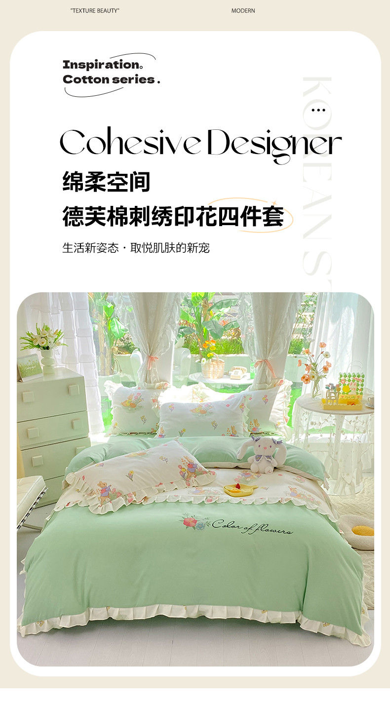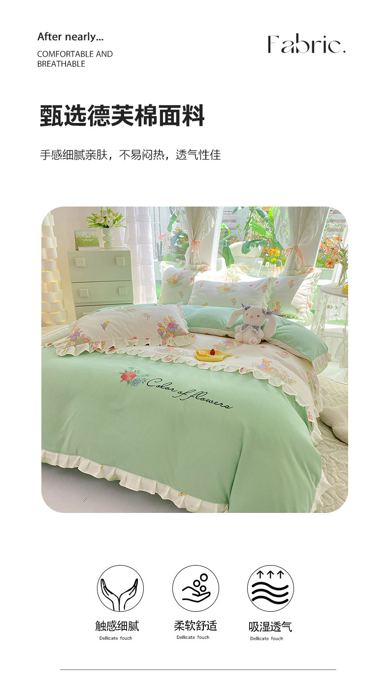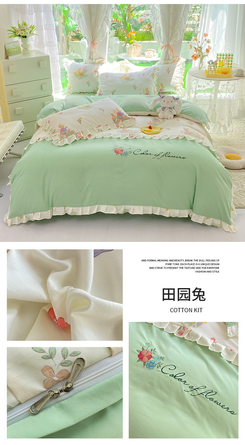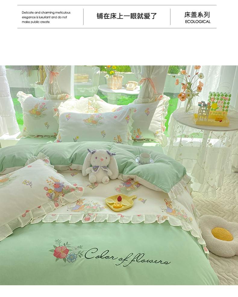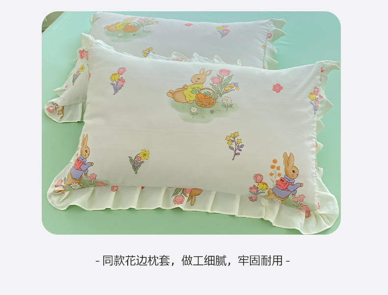 当前位置: 91家纺网 > 商品网购 > 床品套件 > 四件套 > 水洗棉四件套 > 易辰美 2024新款双层纱水洗磨毛德芙棉绣花四件套 田园兔