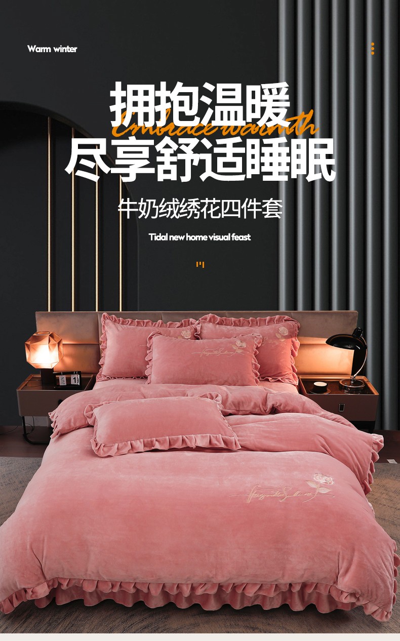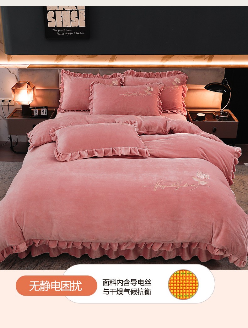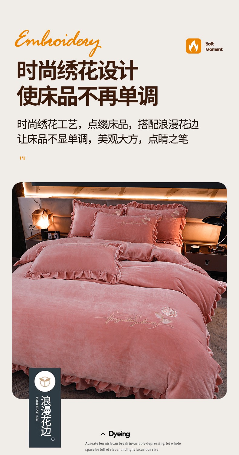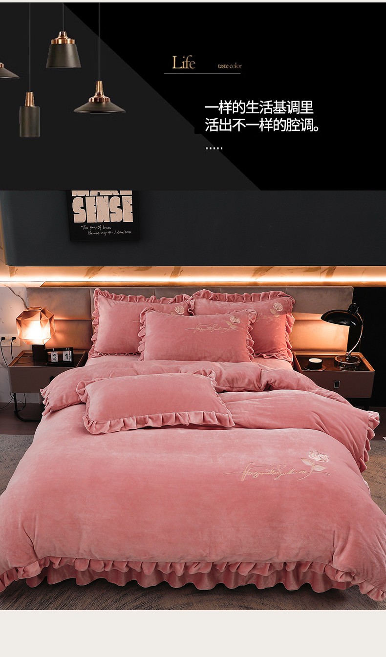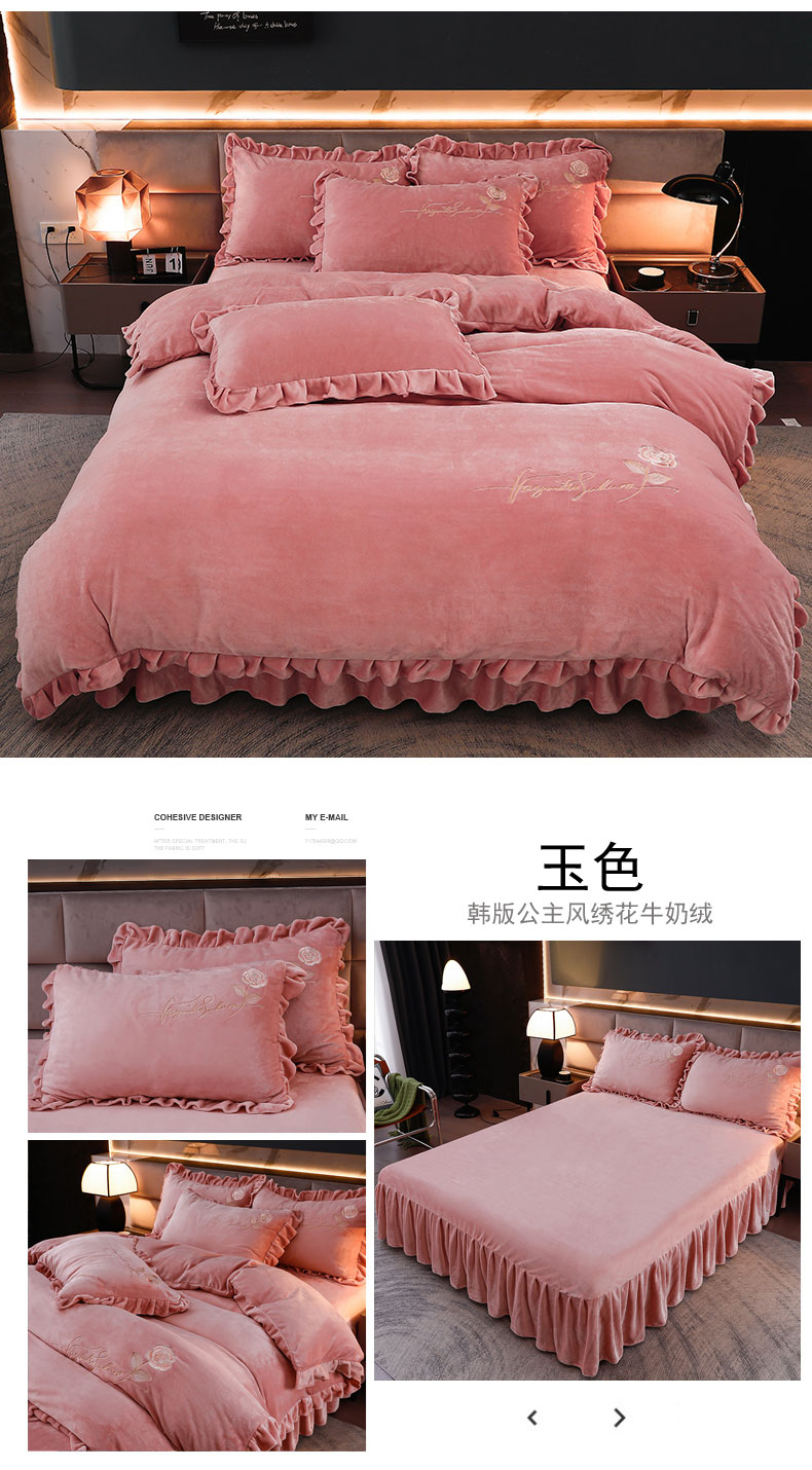 2023牛奶绒保暖四件套韩版蕾丝花边,紫色,松花绿,灰色,豆沙,宾利蓝
