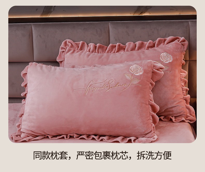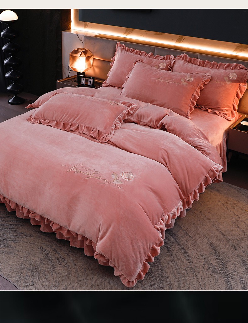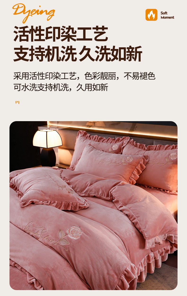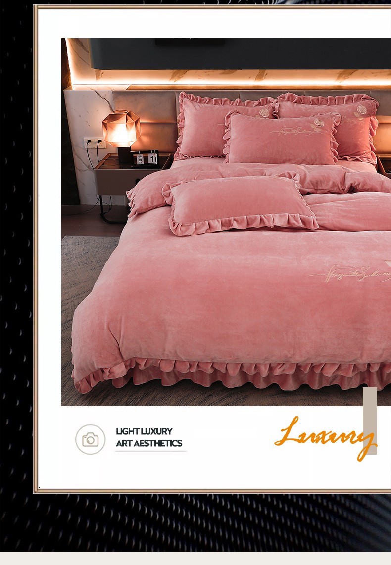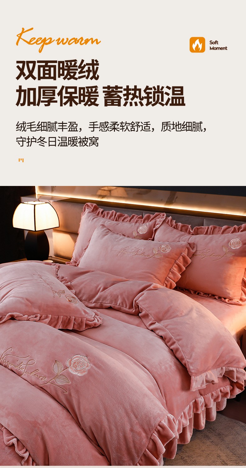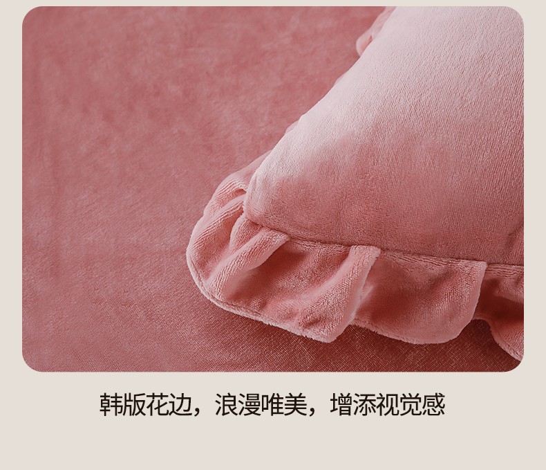 2023牛奶绒保暖四件套韩版蕾丝花边,紫色,松花绿,灰色,豆沙,宾利蓝
