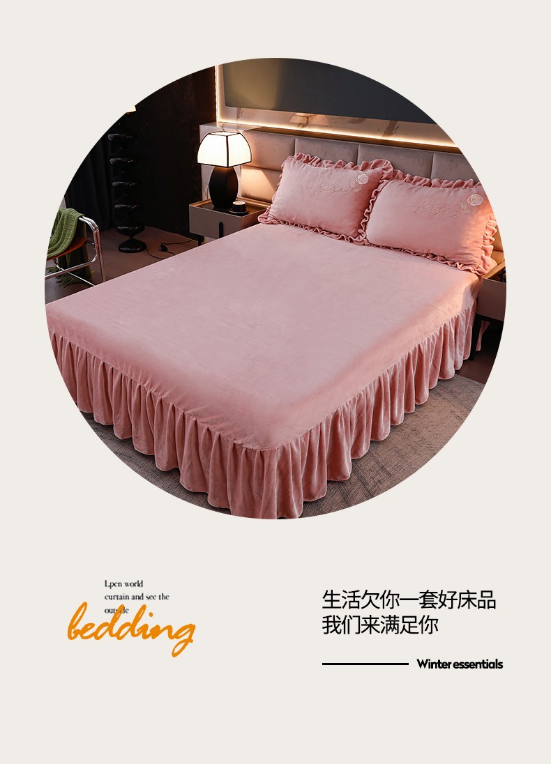 (总)绣女坊2023新款韩版花边床裙款牛奶绒宝宝绒四件套,宾利蓝,豆沙,灰色,酒红色,松花绿,紫色