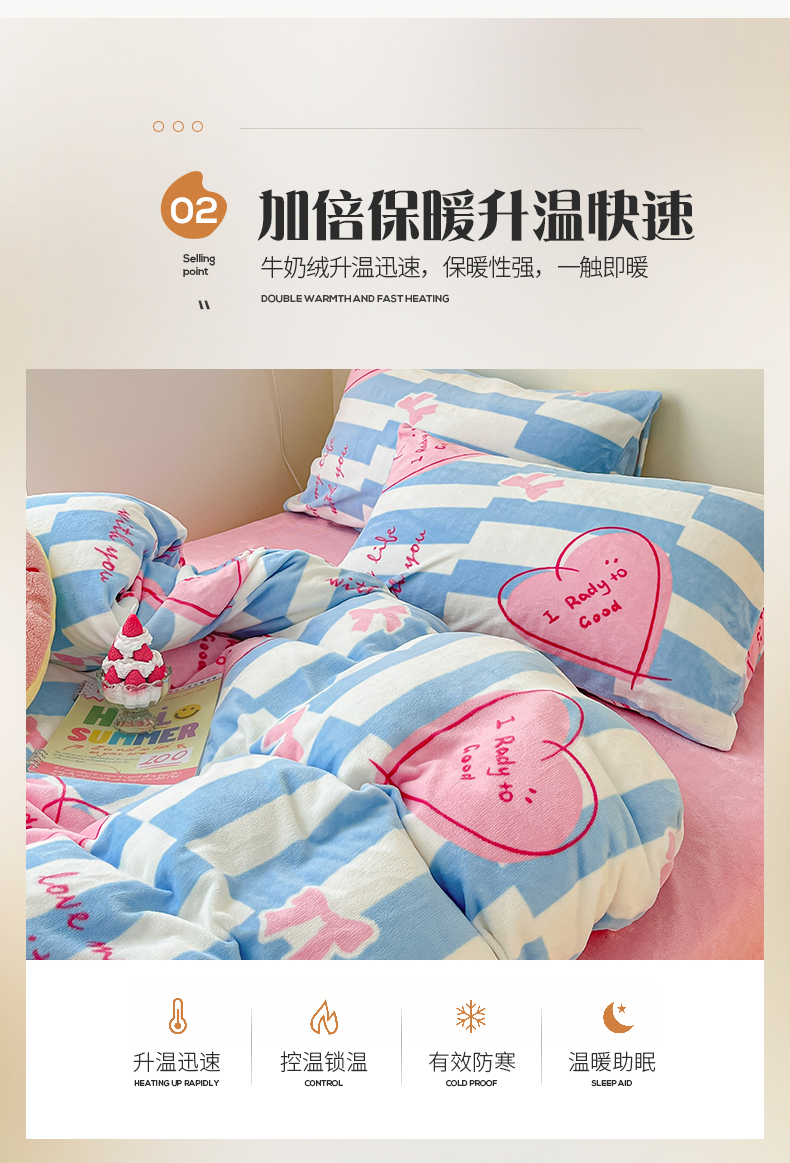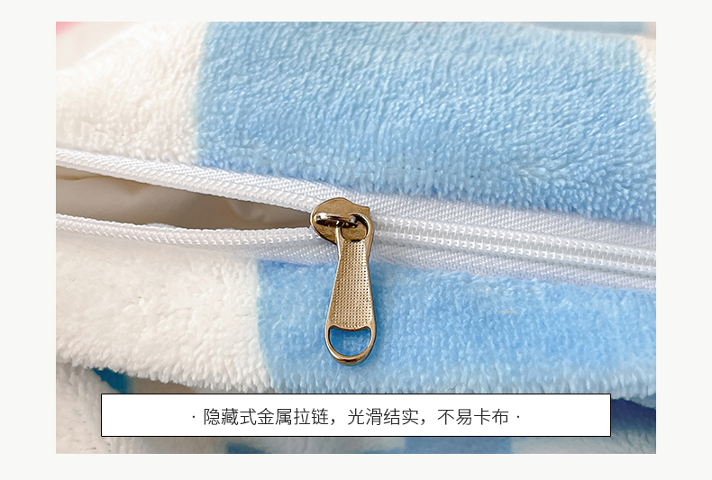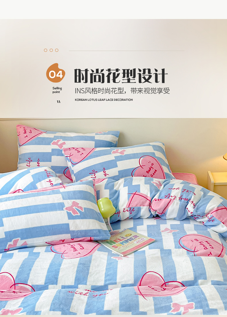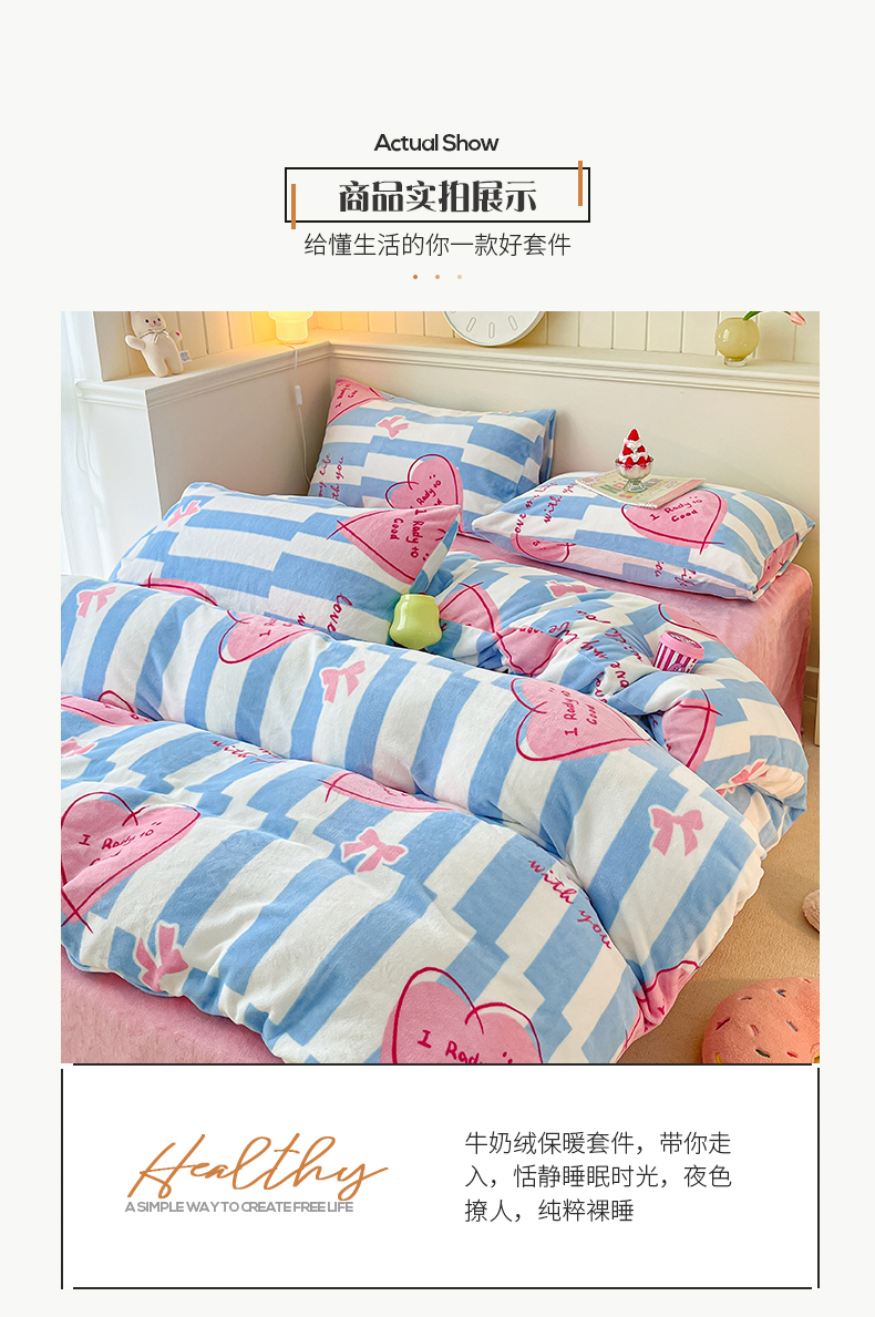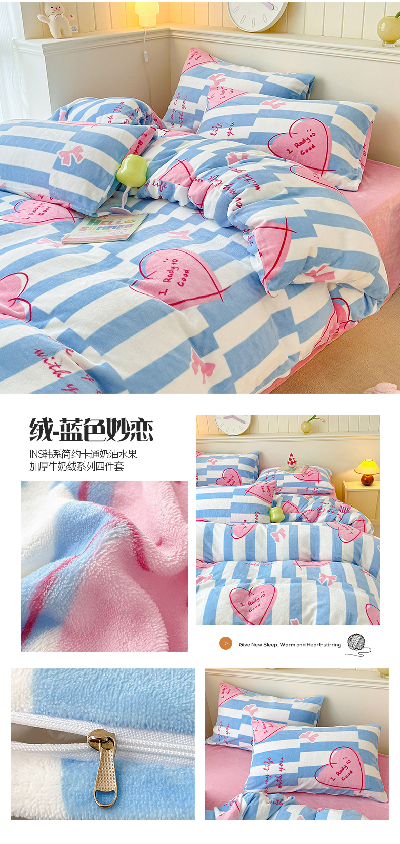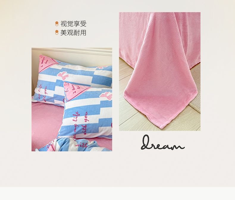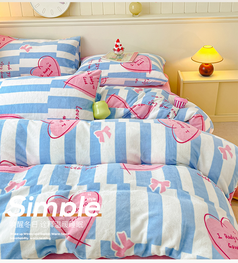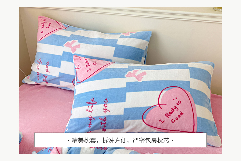 商品名称:桃子家居 2023新款ins韩系简约卡通奶油小清新加厚牛奶绒系列四件套 绒-蓝色妙恋