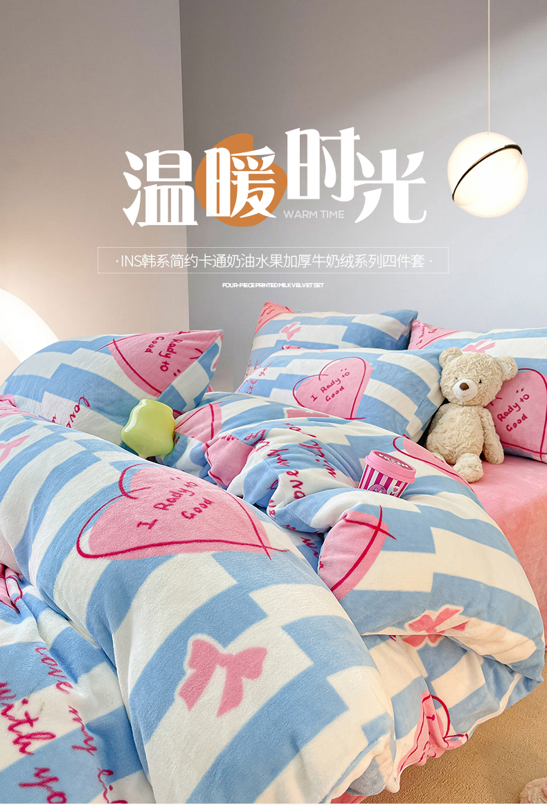 桃子家居 2023新款ins韩系简约卡通奶油小清新加厚牛奶绒系列四件套 绒-蓝色妙恋