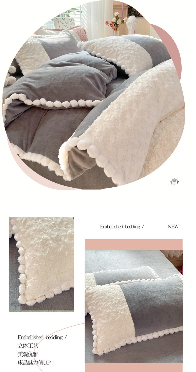 (总)艾米家居 2025秋冬新款浮雕牛奶绒花边四件套,白色,豆沙,粉色