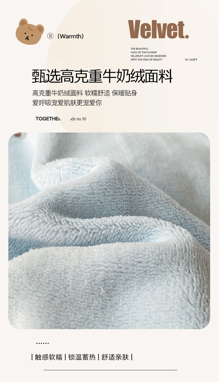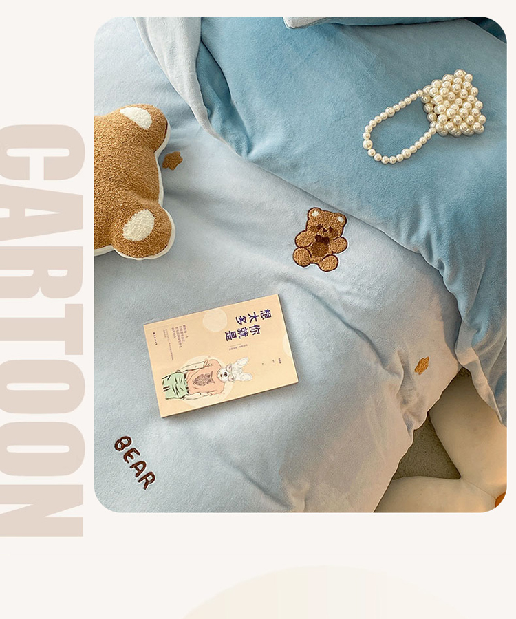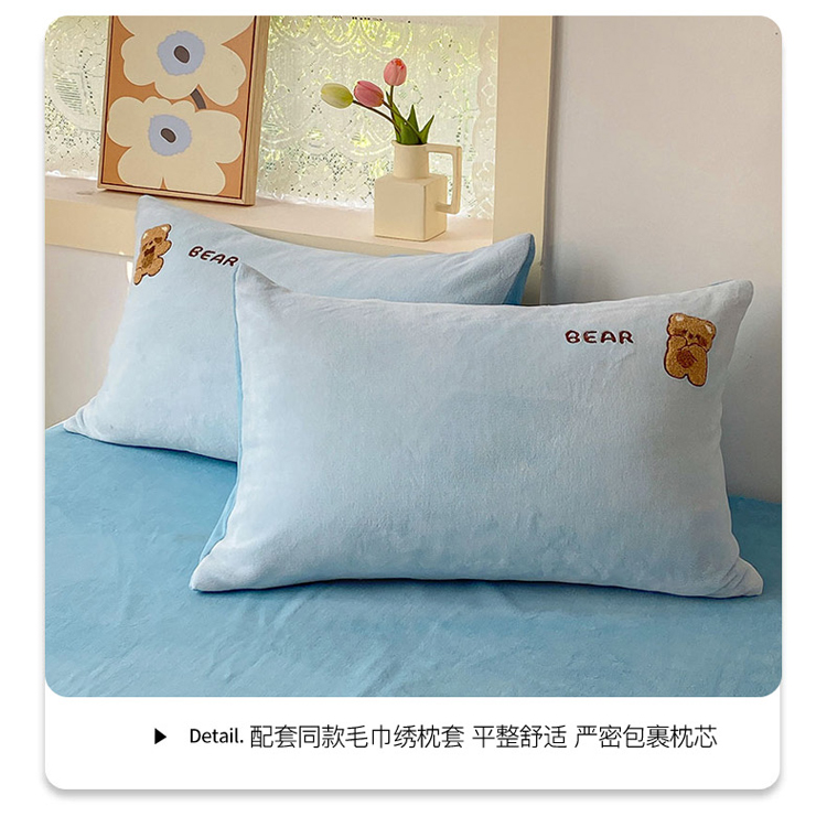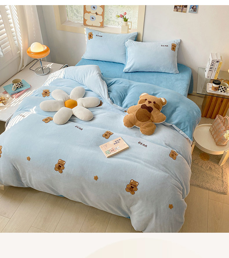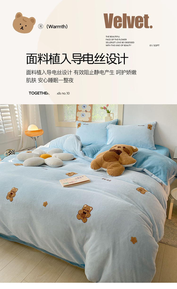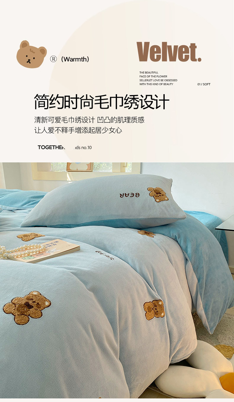 商品名称:寐居家纺 2023新款高克重牛奶绒毛巾绣四件套 萌萌熊-蓝