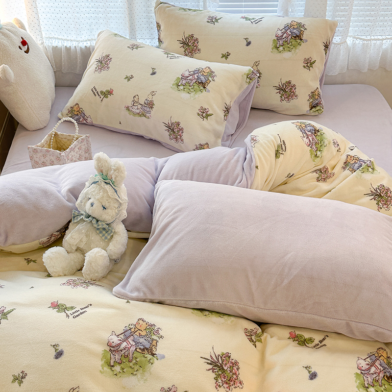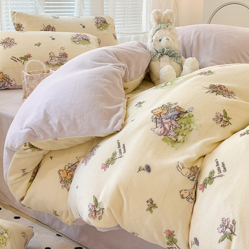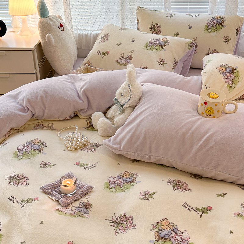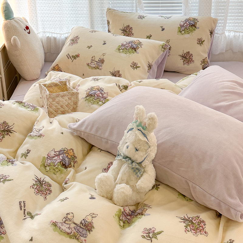 商品名称:昔可家纺 2023新款高克重印花牛奶绒小清新系列四件套 小熊花园