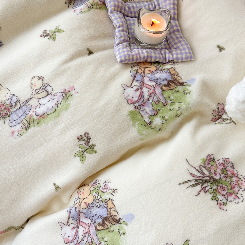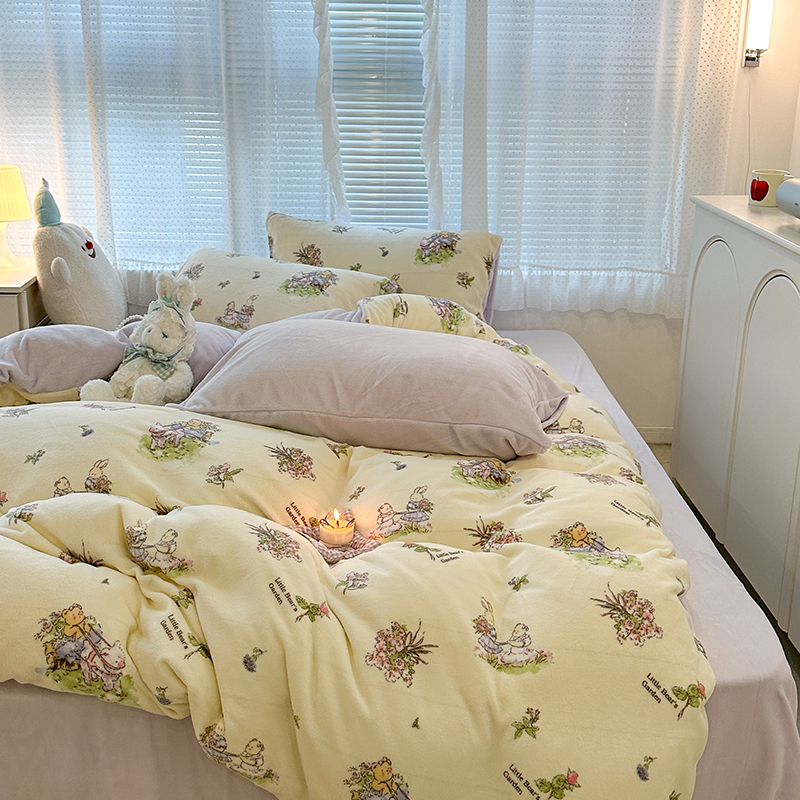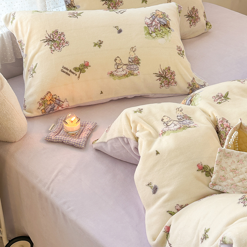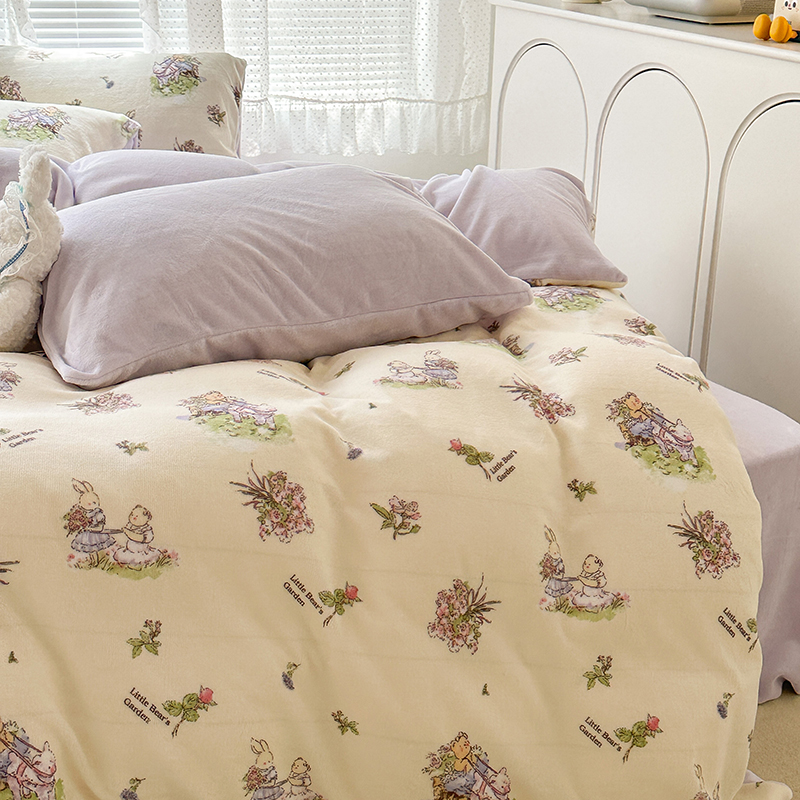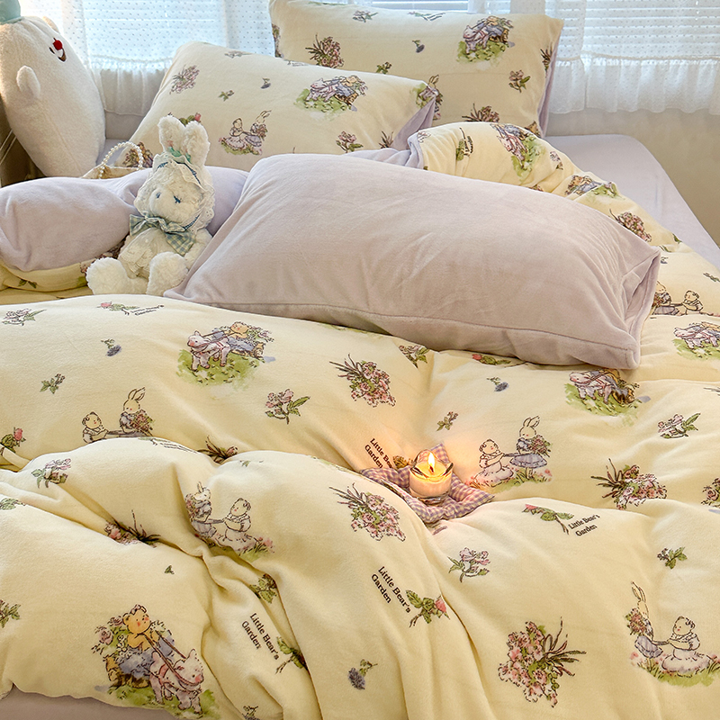 昔可家纺 2023新款高克重印花牛奶绒小清新系列四件套 小熊花园