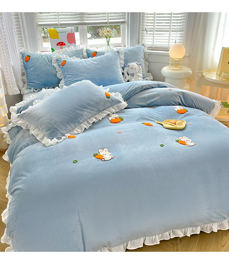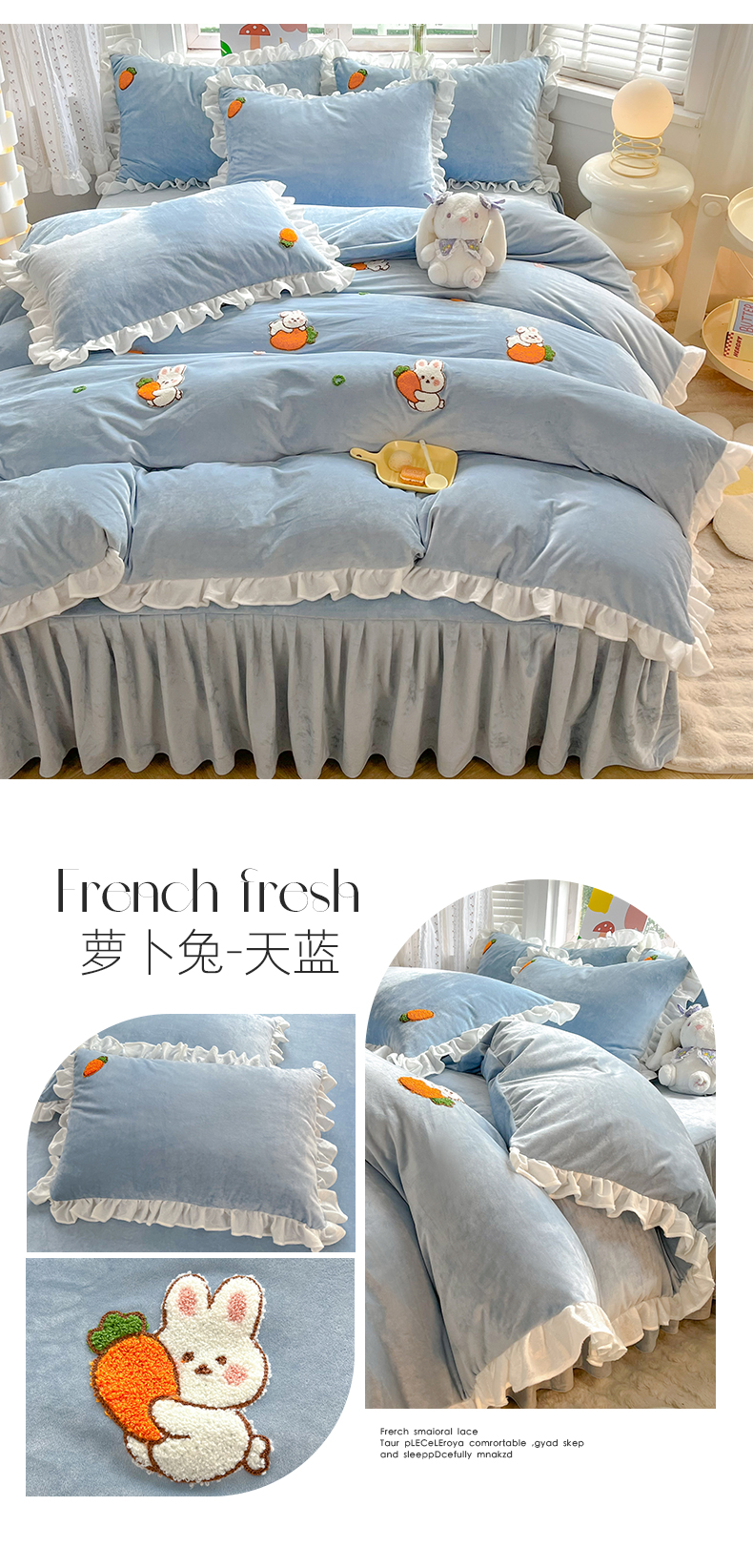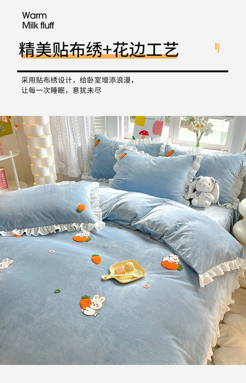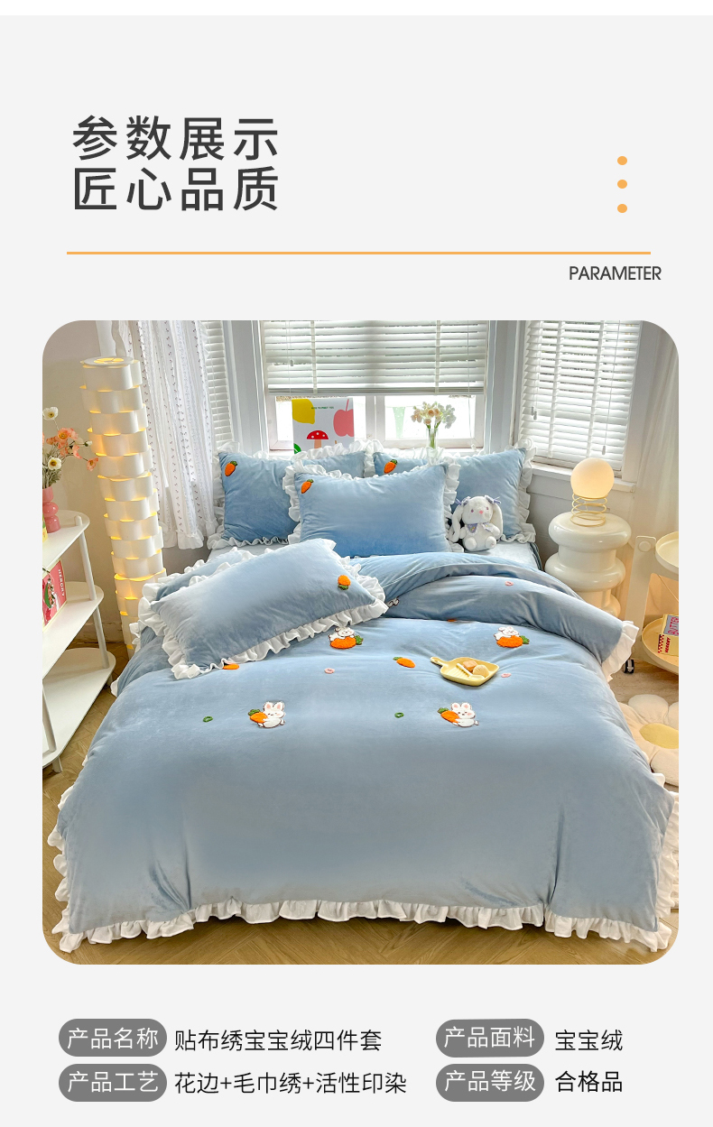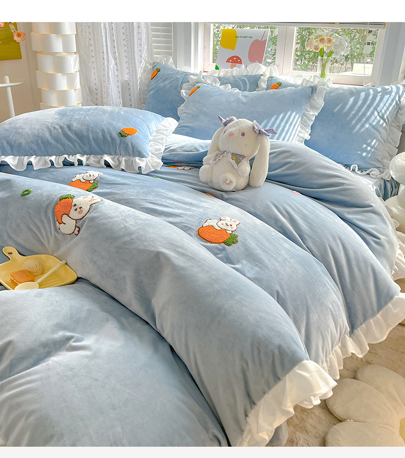 当前位置: 91家纺网 > 商品网购 > 床品套件 > 四件套 > 全棉普通四件套 > 绒兔兔2023新款棉加绒刺绣四件套-萝卜兔 萝卜兔-天蓝