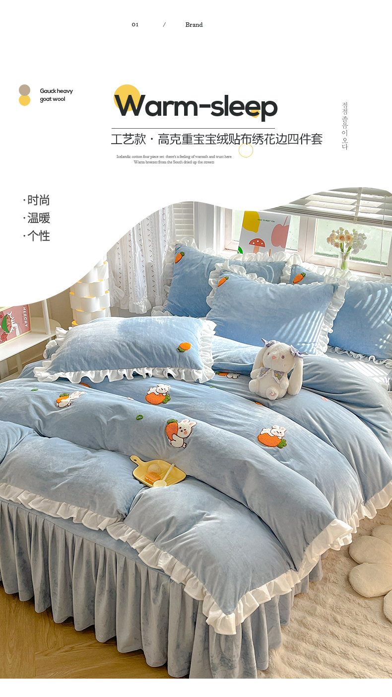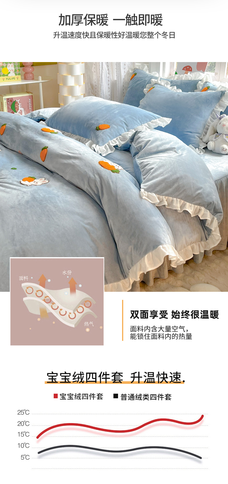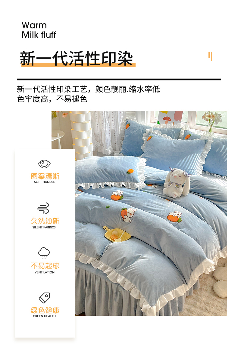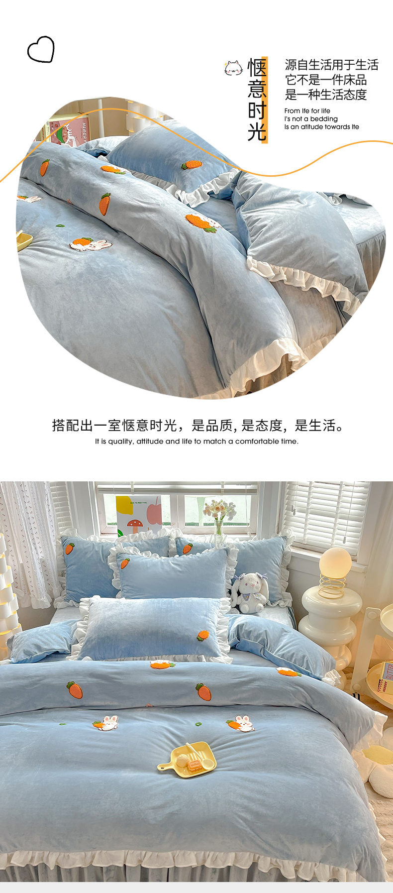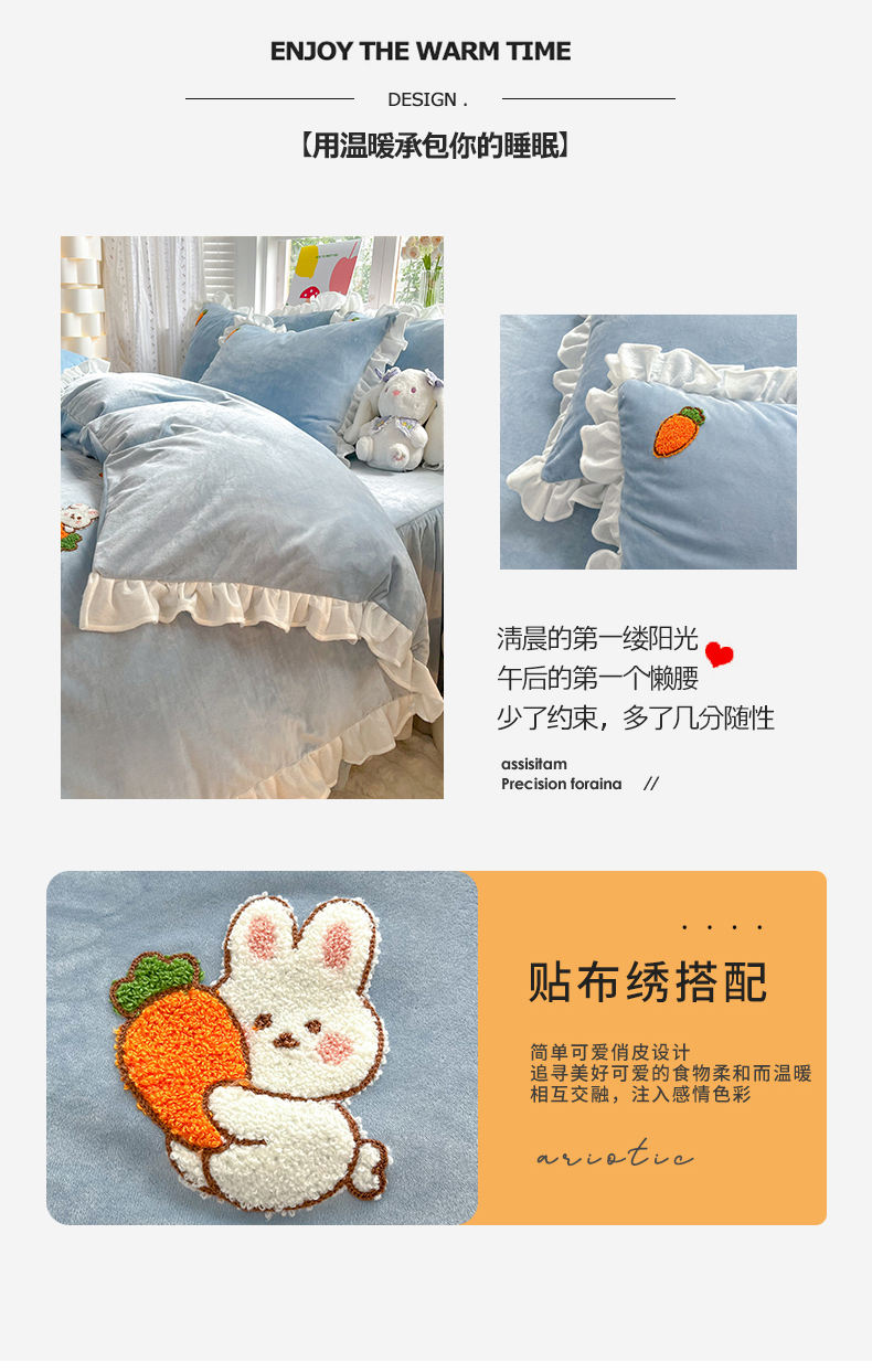 当前位置: 91家纺网 > 商品网购 > 床品套件 > 四件套 > 全棉普通四件套 > 绒兔兔2023新款棉加绒刺绣四件套-萝卜兔 萝卜兔-天蓝